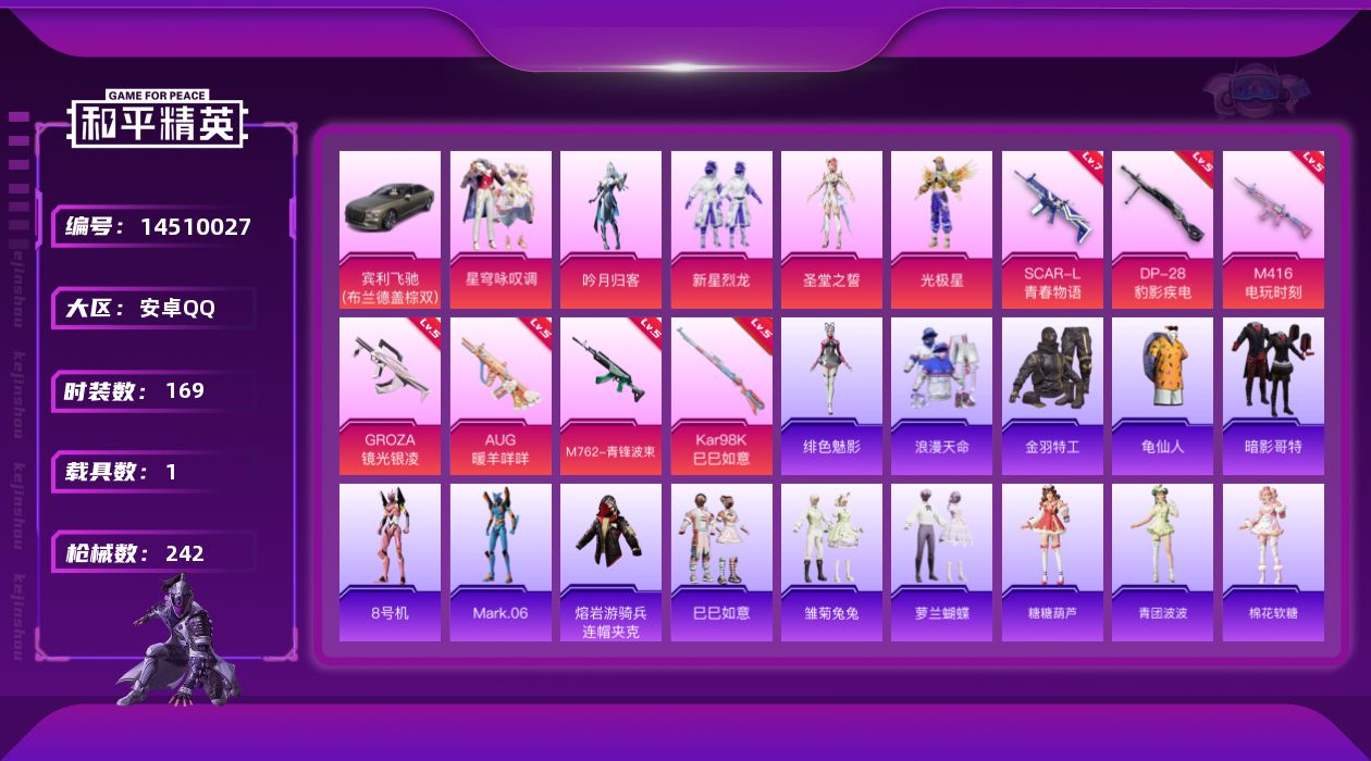 [14510027]安卓 手q-5粉装-7特效呛-1载具-1粉色飞行器-71645热力值-13王牌印记-169套装-242呛皮 【热门品类】:套装-浪漫天命,套装-派对舞王,套装-金羽特工,套装-龟仙人,套装-暗影哥特,角色-8号机,角色-mark.06,熔岩游骑兵连帽夹克 【粉色载具】:宾利飞驰(布罗德盖棕双色) 【粉色套装】:粉装-新星烈龙,粉装-吟月归客,角色-圣堂之誓,角色-光极星,粉装-星穹咏叹调 【粉色呛皮等级】:scar-l-青春物语七级,m416-电玩时刻五级,groza-镜光银凌五级,aug-暖羊咩咩五级,m762-青锋波束五级,kar98k-巳巳如意五级,dp-28-豹影疾电五级 【粉色呛皮】:scar-l-青春物语,m416-电玩时刻,groza-镜光银凌,aug-暖羊咩咩,m762-青锋波束,kar98k-巳巳如意,dp-28-豹影疾电 【粉色降落伞】:锦绣火鲤降落伞,暗夜玫瑰降落伞,垂柳戏鸭降落伞,初号机 觉醒ver.降落伞,宇宙意志降落伞,精灵之光降落伞,千金淑猫降落伞 【稀有套装】:套装-龟仙人,套装-巳巳如意,套装-雏菊兔兔,套装-萝兰蝴蝶,套装-糖糖葫芦,套装-青团波波,套装-棉花软糖,角色-都市丽猫,角色-摩登魅猫,套装-燕燕于飞,套装-鱼渊荷华,套装-粉恋花,套装-紫幽梦,套装-蓝冰羽,角色-猎影月神,角色-绯色魅影,套装-炫彩糖果 【稀有呛皮】:akm-夜灯,akm-彩虹符号,akm-灼热熔岩,akm-生命誓言,akm-破晓战魂,akm-萌趣颜团子,akm-虎虎生威,akm-锦绣火鲤,akm-霓虹街区,akm-龙的传人,m16a4-幻世战舞者,m16a4-快乐主宰,m16a4-甜心亚梦,m16a4-红色方程式,m16a4-蓝色火焰,m16a4-千金淑猫,scar-l-炫彩节奏,scar-l-玉兔迎春,scar-l-红色方程式,scar-l-黄金龙骨,m416-夜灯,m416-糯团青竹,m416-绯红前夜,m416-蓝色火焰,groza-彩虹符号,groza-懵萌河马,groza-治愈之星,groza-生命誓言,groza-田园牧歌,aug-甜蜜菠萝,aug-耀粉歌者,q-原初圣火,q-彩虹符号,q-未来歌姬,q-洛神天依,q-飞驰魅影,m762-天降萌叽,m762-彩虹符号,m762-牛气冲天,m