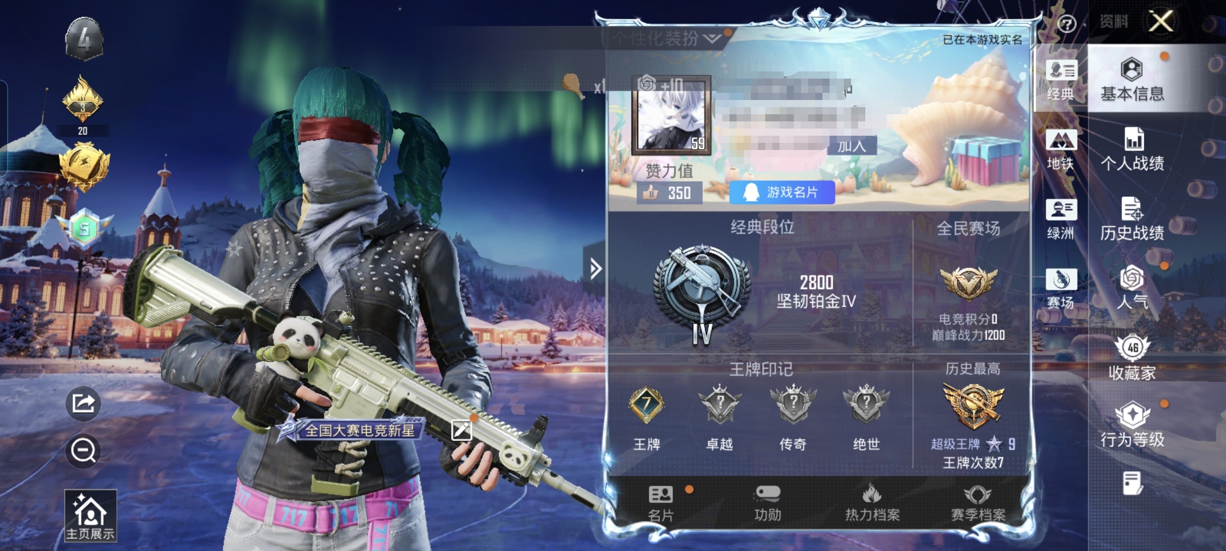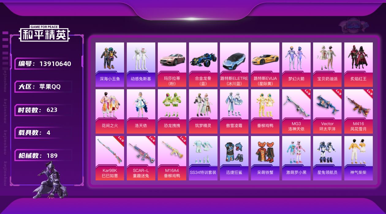 [13910640]实名: 可修改 时装数: 150 载具数: 4 呛械数: 189 战备数: 141 热门装扮: 宝贝奶油派炙焰红王花间之火洛天依恐龙拽拽筑梦精灵傲雪凌霜垂柳戏鸭 载具: 玛莎拉蒂ghibli粉合金龙骨(蓝)路特斯eletre冰川蓝路特斯evija星际黄 稀有呛皮: 五级vect-环太平洋五级mg3-洛神天依五级m416-风花雪月五级kar98k-巳巳如意,四级scar-l-童趣迷兔,三级m16a4-垂柳戏鸭
