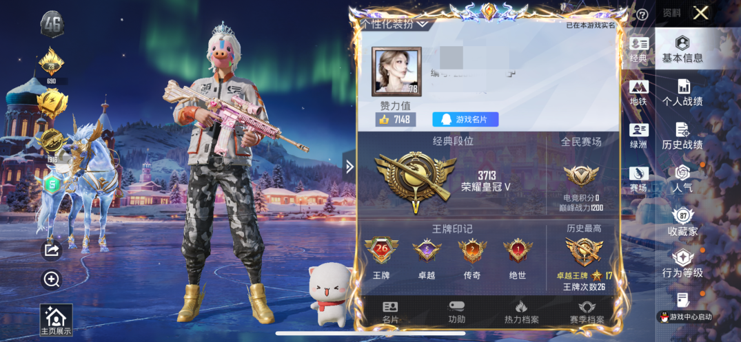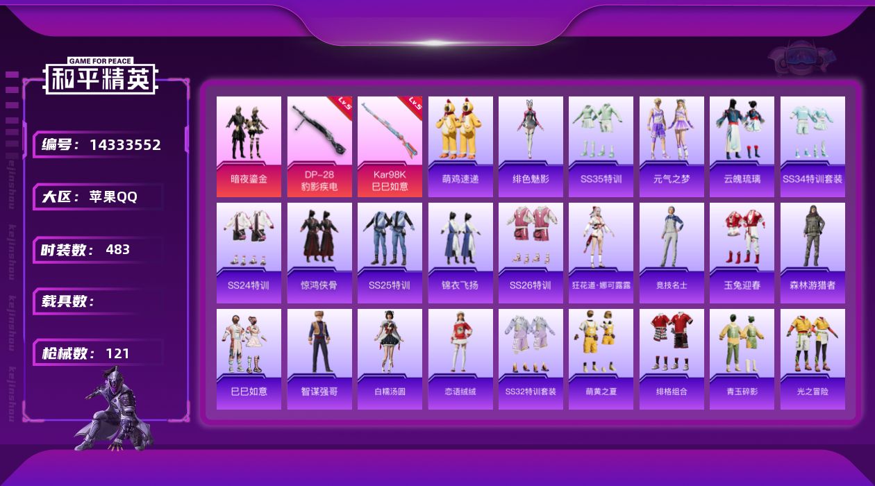 [14333552]实名: 可修改 时装数: 118 呛械数: 121 战备数: 95 热门装扮: 暗夜鎏金 稀有呛皮:五级kar98k-巳巳如意五级dp-28-豹影疾电