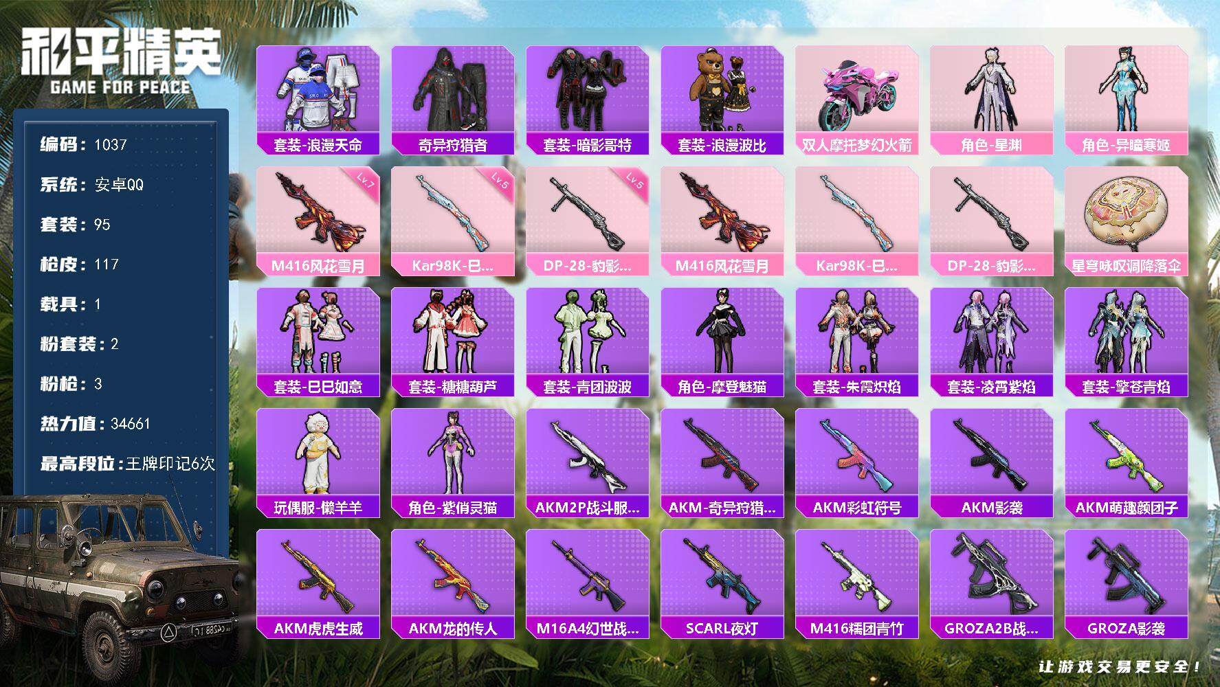 1载具-95套装-117呛皮-95套装/呛械3/装备105/载具1/战备90/王牌印记6/热力值34661/七级m416-风花雪月/五级kar98k-巳巳如意/五级dp-28-豹影疾电/套装-浪漫天命/奇异狩猎者/套装-暗影哥特/套装-浪漫波比/双人摩托-梦幻火箭/角色-星渊/角色-异瞳寒姬/m416-风花雪月/kar98k-巳巳如意/dp-28-豹影疾电/星穹咏叹调降落伞/巳巳如意/套装-糖糖葫芦/套装-青团波波/摩登魅