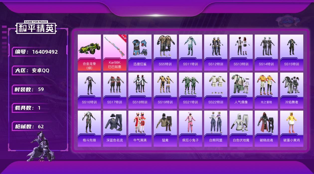 [16409493]【特价出售/店主推荐】安卓 手q-0粉装-1特效呛-1载具-0粉色飞行器-19318热力值-4王牌印记-59套装-62呛皮 【粉色呛皮等级】:kar98k-巳巳如意二级 【粉色载具】:合金龙骨(绿) 【粉色呛皮】:kar98k-巳巳如意 【粉色降落伞】:金风玉露降落伞,繁花小夜曲降落伞 【稀有呛皮】:akm-夜灯,akm-破晓战魂,akm-萌趣颜团子,akm-虎虎生威,m16a4-机械英豪,scar-l-炫彩节奏,scar-l-生命誓言,m416-红色方程式,m416-蓝色火焰,groza-治愈之星,groza-生命誓言,aug-耀粉歌者,q-彩虹符号,m762-牛气冲天,ac-val-天降萌叽,蜜獾-天降萌叽,uzi-天降萌叽,uzi-红色方程式,vect-彩虹符号,vect-治愈之星,vect-生命誓言,汤姆逊-耀粉歌者,野牛-机械英豪,kar98k-彩虹符号,kar98k-红色方程式,m24-治愈之星,sks-炫彩节奏,mk14-治愈之星,win94-机械英豪,s686-生命誓言,s12k-玩趣呆呆,s12k-夜灯,s12k-机械英豪,m249-破晓战魂,dp-28-彩虹符号,dp-28-锦绣火鲤,mg3-幻世战舞者 【其他套装】:套装-ss5特训,套装-ss11特训,套装-ss12特训,套装-ss13特训,套装-ss14特训,套装-ss15特训,套装-ss16特训,套装-ss17特训,套装-ss18特训,套装-ss19特训,套装-ss21特训,套装-ss22特训,套装-人气偶像,套装-光之冒险,套装-冷焰舞者,套装-格斗先锋,套装-深蓝色名流,套装-牛气满满,套装-猛禽,套装-疯狂小兔子,套装-白熊同盟,套装-白色伏地魔,套装-破晓战魂,套装-破蛋小黄鸡,套装-竞技名士,套装-竞技达人朋克,套装-缤纷果语,套装-耀粉歌者,套装-萌趣颜团子,套装-萌黄之夏,套装-蓝彩潮人,套装-虎虎生威吉莉,套装-街头潮人,套装-长空猛禽,套装-青年教官,套装-青玉碎影,套装-飞行日记,套装-鹤鸣,套装-黑色伏地魔,套装-龙的传人,套装-战地菁英,套装-迅捷狂鲨,套装-坚韧舞者,套装-雪山精英,套装-云丝凤蟒,套装-机械英豪,套装-机械征服者,套装-神奈川冲浪里,套装-纯白誓言,套装-治愈之星,套装-科技之星 【稀有头盔】:金风玉露头盔3级,金风玉露
