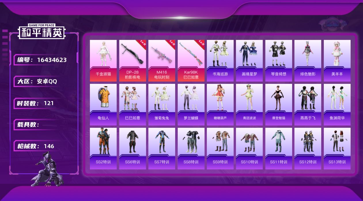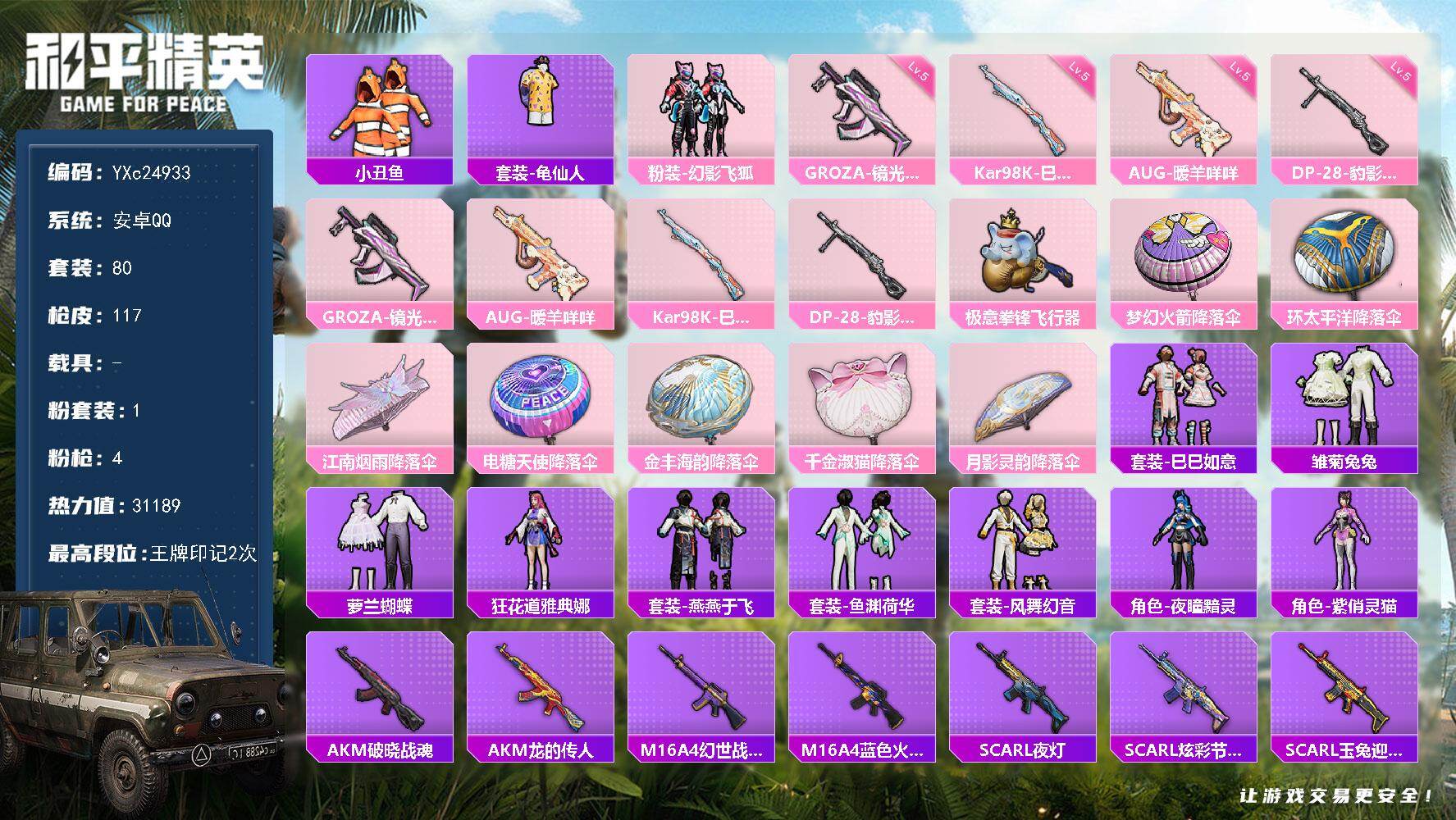[16383482]【店主推荐捡漏号!可直接换绑】安卓 手q-2粉装-4特效呛-0载具-1粉色飞行器-44909热力值-8王牌印记-136套装-162呛皮【热门品类】:粉装-梦幻火箭,套装-都市猎人,套装-深海小丑鱼,套装-小丑鱼,套装-龟仙人,角色-8号机,角色-mark.06【粉色套装】:粉装-梦幻火箭,角色-异瞳寒姬【粉色呛皮等级】:scar-l-锦绣绵绵五级,m416-电玩时刻五级,kar98k-巳巳如意五级,dp-28-豹影疾电五级【粉色呛皮】:scar-l-锦绣绵绵,m416-电玩时刻,kar98k-巳巳如意,dp-28-豹影疾电【粉色飞行器】:梦幻火箭飞行器