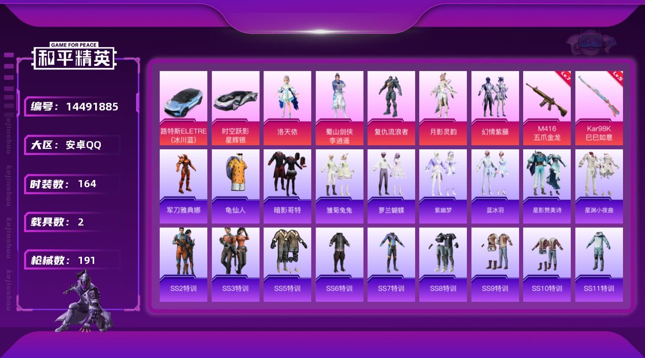 [14491885]安卓 手q-6粉装-2特效呛-2载具-2粉色飞行器-61197热力值-8王牌印记-164套装-191呛皮 【热门品类】:粉装-梦幻火箭,角色-军刀雅典娜,套装-龟仙人,套装-暗影哥特 【粉色载具】:路特斯eletre(冰川蓝),时空跃影(星辉银) 【粉色套装】:粉装-梦幻火箭,角色-洛天依,粉装-幻情紫藤,角色-复仇流浪者,蜀山剑侠-李,角色-月影灵韵 【粉色呛皮等级】:m416-五爪金龙七级,kar98k-巳巳如意五级 【粉色呛皮】:m416-五爪金龙,kar98k-巳巳如意 【粉色飞行器】:梦幻火箭飞行器,青春物语飞行器 【粉色降落伞】:至尊龙雀降落伞,梦幻火箭降落伞,星之信仰降落伞,四圣焕新降落伞,洛神天依降落伞,闪光银龙降落伞,电糖天使降落伞,金丰海韵降落伞 【稀有套装】:套装-龟仙人,套装-雏菊兔兔,套装-萝兰蝴蝶,套装-紫幽梦,套装-蓝冰羽,套装-星影赞美诗,套装-星渊小夜曲 【稀有呛皮】:akm-夜灯,akm-彩虹符号,akm-星之彼岸,akm-生命誓言,akm-破晓战魂,akm-虎虎生威,akm-霓虹街区,m16a4-幻世战舞者,m16a4-甜心亚梦,m16a4-红色方程式,m16a4-蓝色火焰,scar-l-暗夜玫瑰,scar-l-玉兔迎春,scar-l-红色方程式,m416-夜灯,m416-红色方程式,m416-蓝色火焰,groza-懵萌河马,groza-黑色刀锋,aug-幻影战神,aug-耀粉歌者,q-彩虹符号,q-洛神天依,q-诡娃娃,m762-拳皇97,m762-深海曼妙,m762-诡娃娃,m762-风花雪月,mk47-洛神天依,g36c-懵萌河马,g36c-星穹咏叹调,ac-val-天降萌叽,ac-val-甜心亚梦,蜜獾-天降萌叽,蜜獾-娇憨猪猪,uzi-众神之王,uzi-啾咪啾咪,uzi-天降萌叽,uzi-娇憨猪猪,uzi-炫彩节奏,uzi-生命誓言,ump45-繁龙极客,ump45-春暖花开,ump45-涂山之恋,ump45-生命誓言,vect-彩虹符号,vect-生命誓言,vect-银河战甲,vect-黑色刀锋,汤姆逊-炫彩节奏,汤姆逊-环太平洋,汤姆逊-耀粉歌者,mp5k-众神之王,p90-巳巳如意,kar98k-彩虹符号,kar98k-梦幻火箭,kar98k-洛神天依,kar98k-红色