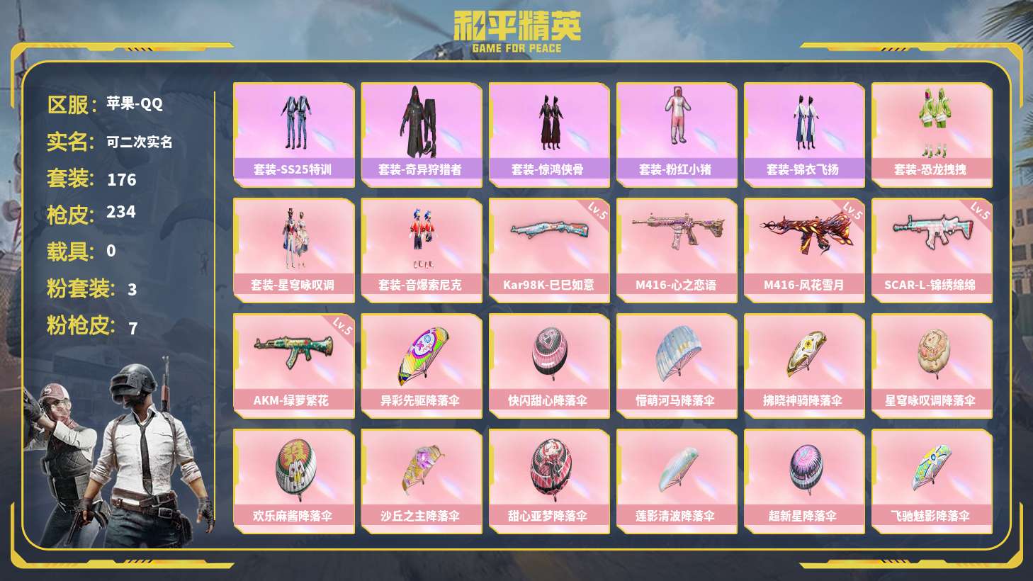 【和平精英】【lyhp17113】高印记 7w热力值 3粉装7特效呛 星穹咏叹调 恐龙拽拽 奇异狩猎者 满级m4心之恋语 5级m4风花雪月 3粉装,7特效呛,0载具,历史最高段位:超级王牌18星 王牌印记10次 热力值:70620,176套装,234呛械,267装备,122战备;套装:套装-恐龙拽拽,套装-音爆索尼克,套装-星穹咏叹调,套装-特训学院,套装-猎鹰,套装-青年教官,套装-橘黑制服,套装-红色运动,套装-黄色运动,套装-蓝色运动,套装-黄色伏地魔,套装-白色伏地魔,套装-黑色伏地魔,套装-骑行爱好者,套装-竞技名士,套装-深蓝色名流,套装-酒红色名流,套装-湖蓝色名流,套装-黄色名流,套装-猛禽,套装-长空猛禽,套装-漫步者,套装-竞技勇士朋克,套装-蓝色守护者,套装-雨林探路者,套装-旭日情侣,套装-冷焰舞者,套装-灼焰舞者,套装-特战装甲,套装-浪漫假日,套装-战地督导,套装-特殊使命,套装-燃烧卡路里,套装-滨海假日,套装-鹰眼刺客,套装-冰冻风暴,套装-完美偶像,套装-人气偶像,套装-幻影武者,套装-街头潮人,套装-蓝彩潮人,套装-怒火燎原,套装-魅力单车,套装-绮丽涂鸦,套装-耀眼新星,套装-坚韧舞者,套装-竞技达人朋克,套装-野性战心,套装-超能勇士,套装-破晓战魂,套装-都市魅力,套装-荣耀,套装-热血青春,套装-沙漠兵团,套装-酷潮明星,套装-极地朋克,套装-幻世战舞者,套装-清新柠檬,套装-奇异狩猎者,套装-蓝调潮人,套装-血色贵族,套装-甜蜜熊情侣,套装-青涩时光,套装-缤纷果语,套装-滨海厨神,套装-冰川特警,套装-极速红龙,套装-格斗先锋,套装-麻辣教官,套装-粉红小猪,套装-破蛋小黄鸡,套装-金鼠迎春,套装-北国孤狼,套装-淡雅花蕊,套装-霓虹街区,套装-ss10特训,套装-萌黄之夏,套装-夏日音浪,套装-ss9特训,套装-探宝勇士,套装-nv战队服,套装-牛气满满,套装-ss11特训,套装-萌趣颜团子,套装-特种颜团子,套装-ss12特训,套装-牛气冲天,套装-ss18特训,套装-耀粉歌者,套装-飞行日记,套装-ss13特训,套装-吉莉礼服,套装-ss15特训,套装-ss16特训,套装-ss17特训,套装-福星高照,套装-豚鼠丹丹,套装-雪兔飞飞,套装-虎虎生威吉莉,套装-异彩先驱,套装-霓虹极客,套装-空投萌叽,套装-ss19特训,套装-飞驰魅影,套装-音速流光,套装-炫蓝之夏,套装-ss20特训,套装-甜心亚梦,套装-虚音幻奏,套装-ss21特训,套装-萌趣咩咩,套装-娇憨猪猪,套装-玉兔迎春,套装-ss22特训,套装-和煦暖阳,套装-田园牧歌,套装-轻风白浪,套装-光之冒险,套装-绯格组合,套装-ss23特训,套装-摩登艾咪,套装-银月精灵,套装-甜梦熊熊,套装-神气柴柴,套装-懵萌河马,套装-妙红点点,套装-幻彩翩翩,套装-王牌教练,套装-柠萌假日,套装-青玉碎影,套装-ss24特训,套装-龟仙人,套装-ss25特训,套装-惊鸿侠骨,套装-锦衣飞扬,套装-云霞荷露,套装-果汁能量,套装-龙的传人,套装-ss26特训,套装-快闪甜心,套装-春光漫游,套装-空岛之星,套装-贝斯之夜,套装-焰鹰斗篷,套装-幽夜迷踪,套装-幻羽潜行,套装-ss27特训,套装-恋语绒绒,套装-老实芭蕉,套装-ss28特训,角色-白光莹,套装-海盐绵绵冰,角色-绯色魅影,套装-异域银装,角色-绛羽幽主,套装-ss31特训,套装-鱼渊荷华,套装-燕燕于飞,套装-紫幽梦,套装-粉恋花,套装-ss33特训,套装-云朵鹅,套装-ss32特训,套装-彩虹兔,套装-蓝冰羽,套装-顶瓜瓜,套装-雪绒豹,套装-大橘大利,套装-星渊小夜曲,套装-炫彩糖果,套装-元气之梦,套装-ss34特训,套装-薄荷星砂,套装-ss35特训,套装-ss36特训,套装-萌鸡速递;呛皮:ac-val-甜心亚梦,ac-val-乌木金纹,ac-val-彩虹甜喵,ac-val-天降萌叽,ac-val-快闪甜心,ac-val-彩装战姬,7级m416-心之恋语,5级m416-风花雪月,m416-夜灯,m416-蓝色火焰,m416-绯红前夜,m416-红色方程式,m416-暗夜行者,m416-糯团青竹,m416-璀璨流光,m16a4-蓝色火焰,m16a4-红色方程式,m16a4-夜灯,m16a4-甜心亚梦,m16a4-幻世战舞者,aug-甜蜜菠萝,aug-耀粉歌者,aug-天降萌叽,aug-异域银装,aug-冰晶雪宝,g36c-懵萌河马,g36c-星穹咏叹调,g36c-乌木金纹,5级akm-绿萝繁花,akm-灼热熔岩,akm-生命誓言,akm-破晓战魂,akm-霓虹街区,akm-夜灯,akm-彩虹符号,akm-萌趣颜团子,akm-虎虎生威,akm-龙的传人,akm-霓彩脉冲,groza-彩虹符号,groza-异彩先驱,groza-田园牧歌,groza-懵萌河马,groza-绯红回忆,groza-乌木金纹,mk47-百万伏特,mk47-乌木金纹,mk47-妙红点点,q-彩虹符号,q-飞驰魅影,q-乌木金纹,5级scar-l-锦绣绵绵,scar-l-红色方程式,scar-l-黄金龙骨,scar-l-炫彩节奏,scar-l-彩虹符号,scar-l-玉兔迎春,scar-l-是爱神辣,scar-l-海盐豹豹,蜜獾-娇憨猪猪,蜜獾-天降萌叽,蜜獾-绯穹魔姬,蜜獾-乌木金纹,m762-绯红前夜,m762-牛气冲天,m762-彩虹符号,m762-天降萌叽,m762-云朵鹅,famas-霓彩脉冲,famas-乌木金纹,5级kar98k-巳巳如意,kar98k-红色方程式,kar98k-王子的夏天,kar98k-彩虹符号,kar98k-炫彩节奏,kar98k-飞驰魅影,kar98k-乌木金纹,m24-影袭,m24-奇异狩猎者,m24-炫彩节奏,m24-樱桃泡泡,m24-乌木金纹,awm-庄周梦蝶,awm-焰鹰斗篷,awm-乌木金纹,m200-惊鸿侠骨,m200-乌木金纹,莫辛纳甘-乌木金纹,莫辛纳甘-懵萌河马,win94-萝萝小趴兔,win94-乌木金纹,amr-妙红点点,amr-乌木金纹,svd-云朵鹅,sks-炫彩节奏,sks-糯团青竹,mk20-h-莲影清波,mk20-h-快闪甜心,mk20-h-狂鲨锋刃,mk14-乌木金纹,mk14-紫幽梦,mk14-薄荷星砂,mini14-金玉无双,mini14-金鼠迎春,mini14-炫彩节奏,mini14-耀粉歌者,mini14-异彩先驱,mini14-涂山之恋,m417-惊鸿侠骨,m417-玩趣呆呆,vss-田园牧歌,vss-彩虹符号,vss-乌木金纹,slr-娇憨猪猪,slr-彩虹符号,slr-霓彩脉冲,mk12-乌木金纹,ump45-夜灯,u