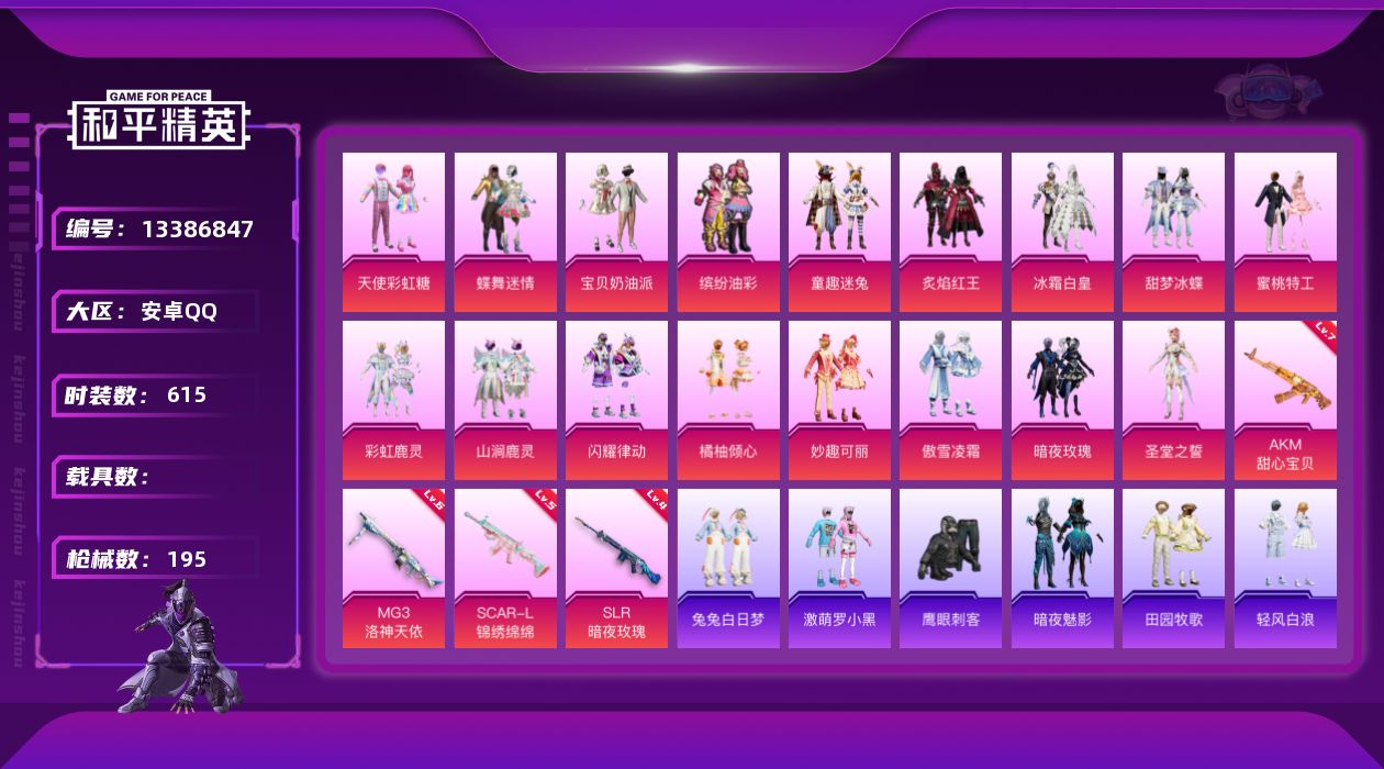 [13386852]紫螳螂天使彩虹糖天禅智恒宝贝奶油派小丑鱼洛天依满级m416-风花雪月满级ump45-相思残雪红眼罩身法浪漫天命鹰眼刺客竞技身法狂沙舞者安卓手q-可二次-10粉装-8特效-0载具 角色-初号机款机体服粉套-天使彩虹糖粉套-宝贝奶油派角色-洛天依-粉套