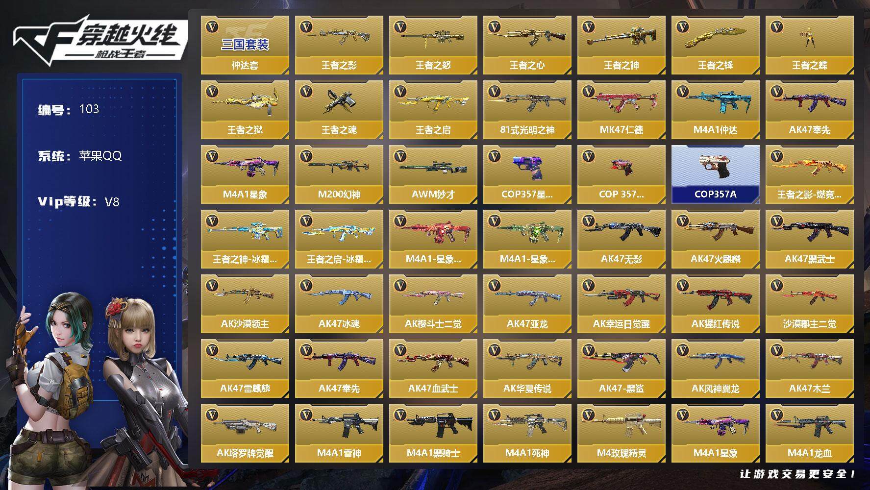 [14508415]【编号53996可秒换绑】店长推荐特价处理精品号5英雄角色数-202英雄武器数 【王者系列】:王者之翼,王者之影,王者之心,王者之神,王者之锋,王者之兽,王者之狱,王者之魂,王者之霆 【热门武器】:ksg-孟获,scar-文远,m4a1-威侯,m4a1-游骑兵2,awm-妙才,81式-阿波罗,cop 357-绚樱2 【角色】:萝拉,炽天使-x,祝融夫人2,零-新生 【英雄武器】:ak47-无影,ak47-火麒麟2,ak47-樱斗士-超觉,ak47-竞技战魂,ak47-机械迷城,ak47-幸运日觉醒,ak47-雷麒麟,ak47-血武士,ak47-黑鲨,ak47-雅韵青花,ak47-谜城烟火,m4a1-雷神2,m4a1-黑骑士,m4a1-黑龙,m4a1-死神2,m4a1-玫瑰精灵,m4a1-游骑兵2,m4a1-呛娘,m4a1-竞技战魂,m4a1-威侯,m4a1-赛博雷神,m4a1-堕天神,m4a1-心动次元觉醒,m4a1-太白诗仙,scar-幽暗骑士觉醒,scar-文远,scar light-白虎,scar-探星者,scar-守护者觉醒,scar-印刷术,an94-卷帘大将军,an94-赳赳秦师,aug-机械纪元,9a91-天神,9a91-魔蜥觉醒,m14ebr-暗夜觉醒,m14ebr-天神,m14ebr-玄武,m16-恶魔,q03-湮灭2,q03-金色蔷薇,q03-死神,q03-玉面羞花,mk47-云舞,q191-金甲虎啸觉醒,q191-封神榜,awm-天龙,awm-妙才,awm-天使,awm-指南针2,芭蕾特-毁灭3,芭蕾特-极光2,芭蕾特-金色蔷薇,芭蕾特-朱雀,09式狙-天神3,98k-血月,加特林-堡垒,加特林-堡垒觉醒,刘易斯-血月,刘易斯-天使,qbb95-极光,qbb95-再战涿鹿,mk5-极光,汤姆逊-烈龙,双持斯泰尔-天使2,qcw05-变形金刚·大黄蜂2,cbj-ms-毒蜂,czs2-血月,pp19野牛-造纸术,打击者-天神,地狱火,嗜血金鲨,地狱烈炎,aa12-火药,ksg-火力竞放觉醒,ksg-极光,ksg-孟获,usp-神罚3,usp-机械迷城,usp-太白诗仙,沙鹰-修罗3,沙鹰-飞电,沙鹰-天神,沙鹰-无影,沙鹰-神兵修罗,沙鹰-宇航兔兔,消音毛瑟-常胜,glock18-武圣,改装