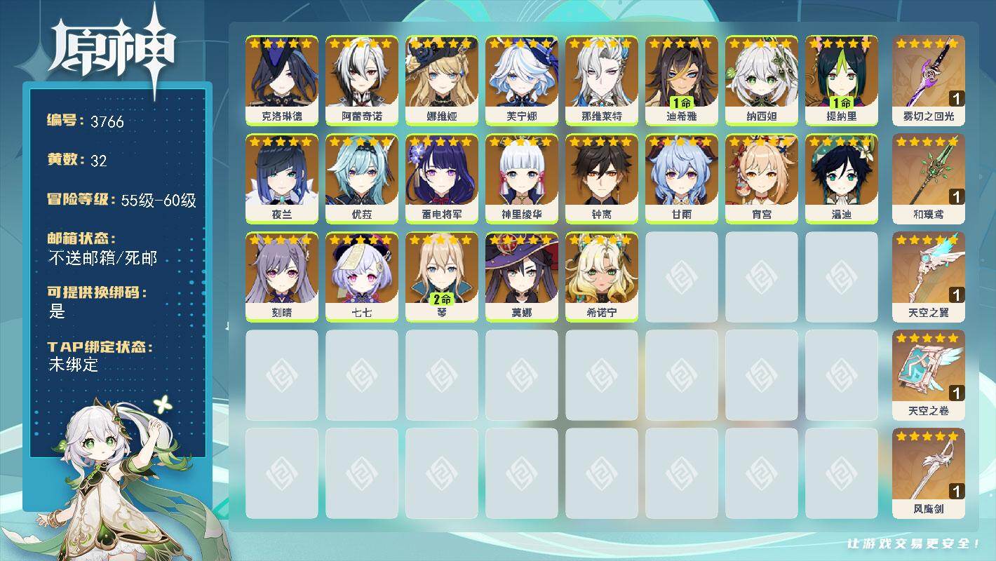 【原神】0满命,冒险等级:60,五星数量:84,五星角色:茜特菈莉 6命芙宁娜 6命爱可菲 6命达达利亚 6命迪卢克 6命甘雨 6命胡桃 6命刻晴 6命莫娜 6命七七 6命琴 6命神里绫华 6命宵宫 6命钟离 6命八重神子 6命夜兰 6命提纳里 6命赛诺 6命妮露 6命纳西妲 6命白术 4命迪希雅 4命申鹤 4命玛薇卡 3命雷电将军 3命希诺宁 2命丝柯克 2命枫原万叶 2命魈 2命温迪 2命克洛琳德 2命梦见月瑞希 1命珊瑚宫心海优菈神里绫人那维莱特千织阿蕾奇诺伊涅芙菈乌玛菲林斯奈芙尔杜林哥伦比娅__五星武器:阿莫斯之弓 5精飞雷之弦振 5精和璞鸢 5精狼的末路 5精四风原典 5精天空之脊 5精天空之翼 5精雾切之回光 5精薙草之稻光 5精终末嗟叹之诗 5精冬极白星 5精息灾 5精神乐之真意 5精波乱月白经津 5精若水 5精赤沙之杖 5精圣显之钥 5精千夜浮梦 5精磐岩结绿 4精天空之刃 3精碧落之珑 2精天空之傲 2精天空之卷 2精岩峰巡歌星鹫赤羽祭星者之望焚曜千阳苇海信标裁断有乐御簾切香韵奏者裁叶萃光不灭月华苍古自由之誓风鹰剑护摩之杖猎人之径__四星角色:班尼特 6命行秋 6命九条裟罗 6命香菱 6命久岐忍 6命鹿野院平藏 6命珐露珊 6命凝光 6命迪奥娜 6命砂糖 6命绮良良 6命瑶瑶 6命莱依拉 6命米卡 6命坎蒂丝 6命多莉 6命柯莱 6命芭芭拉 6命欧洛伦 6命云堇 6命早柚 6命托马 6命五郎 6命烟绯 6命重云 6命辛焱 6命诺艾尔 6命罗莎莉亚 6命雷泽 6命菲谢尔 6命北斗 6命夏洛蒂 6命夏沃蕾 6命嘉明 6命伊法 6命赛索斯 6命卡维 5命卡齐娜 4命琳妮特 4命塔利雅 4命菲米尼 3命爱诺 3命伊安珊 2命蓝砚 1命埃洛伊奇偶·女性奇偶·男性