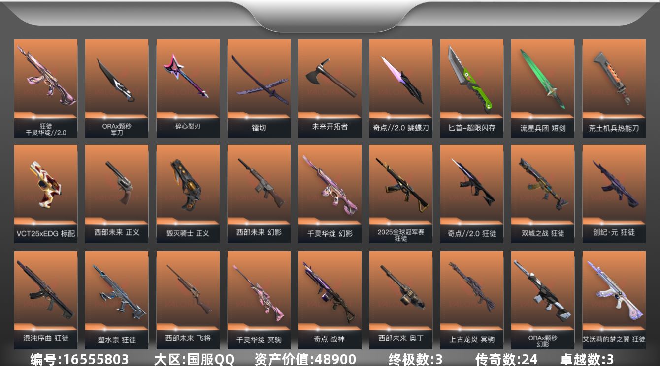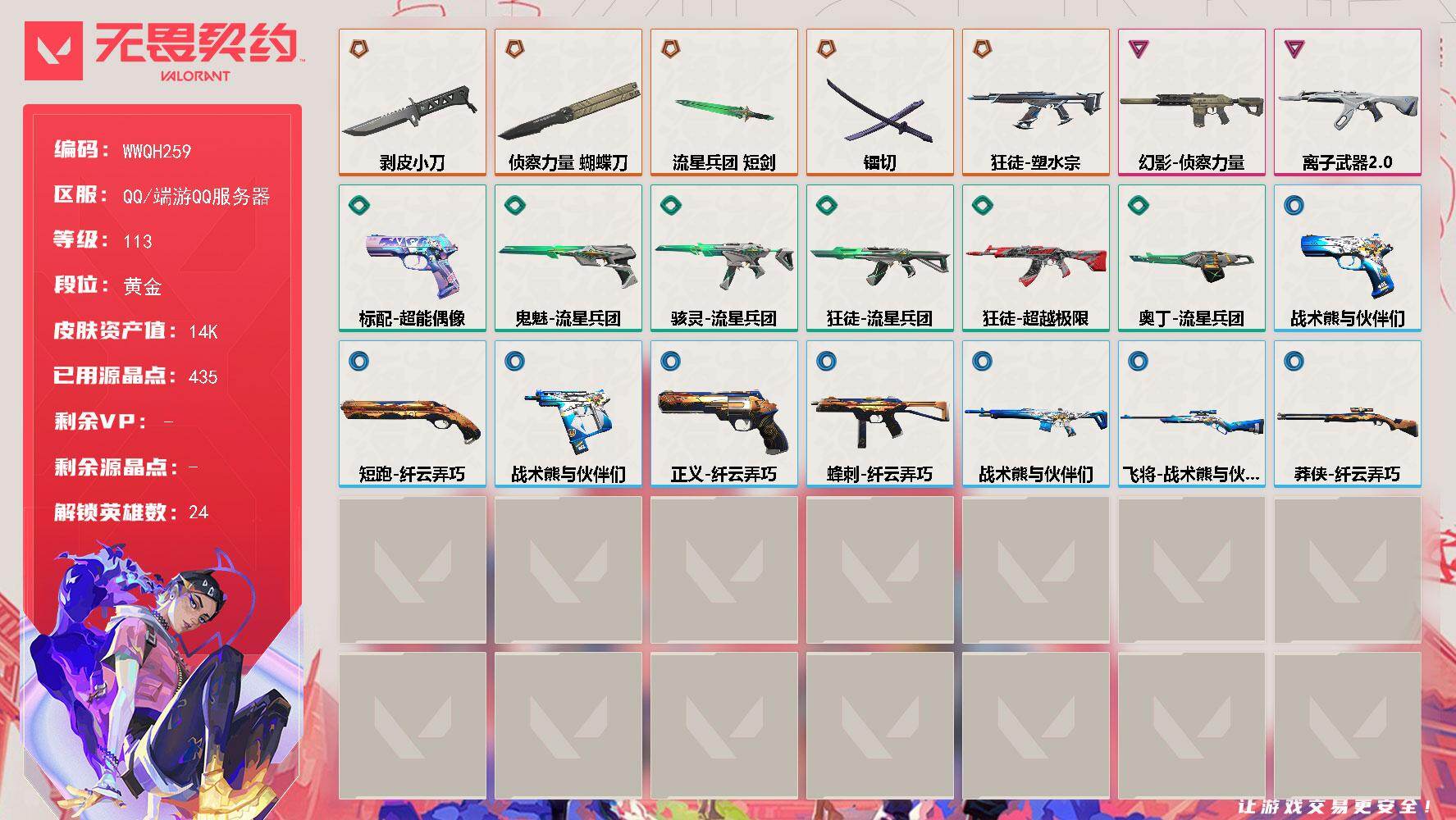 【wwqh259】终极5/卓越2/皮肤22/等级113/段位:黄金/幻棱/炼狱/维斯/暮蝶/钛狐/壹决/铁臂/捷风/雷兹/幽影/不死鸟/贤者/猎枭/蝰蛇/零/芮娜/尚勃勒/霓虹/斯凯/夜露/k/o/盖可/黑梦/近战武器-侦察力量 蝴蝶刀/近战武器-剥皮小刀/近战武器-镭切/近战武器-流星兵团 短剑/狂徒-塑水宗/狂徒-离子武器//2.0/狂徒-超越极限/狂徒-流星兵团/幻影-侦察力量/戍卫-战术熊与伙伴们/飞将-战术熊与伙伴们/莽侠-纤云弄巧/奥丁-流星兵团/骇灵-流星兵团/蜂刺-纤云弄巧/标配-超能偶像/标配-战术熊与伙伴们/正义-纤云弄巧/鬼魅-流星兵团/狂怒-战术熊与伙伴们/短炮-纤云弄巧/《双城之战》拥抱 卡面/精灵大战 卡面/欢迎来到底城 卡面/南瓜盛典 卡面/修车达人 卡面/正义的化身 卡面/终章:生意人麦宝 卡面/铁之华 卡面/时间到 卡面/最高舞台 卡面/声感陷阱设计图 卡面/霓帧牛蛙 卡面/梦幻奶茶 卡面/终章:打造专属狂徒 卡面/趁热吃 卡面/西装暴徒 卡面/失控边缘 卡面/哨卫者之领域 卡面/暮蝶工牌 卡面/战术熊与伙伴们 卡面/源能反应 卡面/流星兵团 卡面/纤云弄巧 卡面/暂别喧嚣 卡面/打造专属狂徒 卡面/零点嗅探设计图 卡面/无畏契约go!第一卷:芮娜 卡面/清除名单 卡面/无畏契约go!第一卷:零 卡面/《双城之战》金克丝 卡面/逆向独行 卡面 /代号红色 卡面/新兵报到 卡面/v契约 卡面/无畏契约 卡面/嗨宝南瓜灯 喷漆/嘭! 喷漆/都算到了 喷漆/控场勿近 喷漆/熊抱 喷漆/超级粉丝 喷漆/捷风差距 喷漆/惊声尖叫 喷漆/2021冠军巡回赛花火 喷漆/拼一呛 喷漆/加油!加油! 喷漆/开心到爆炸 喷漆/皮蛋萌舞 喷漆/我觉得不行 喷漆/头号粉丝 喷漆/吸一口快乐 喷漆/永远的答案 喷漆/再来一次? 喷漆/别挡我的路! 喷漆/我的刀呢? 喷漆/当然可以 喷漆/流星兵团 喷漆/战术熊与伙伴们 喷漆/禁止喷漆 喷漆/纤云弄巧 喷漆/双击点赞 喷漆/买装还是存钱 喷漆/胜利属于无畏契约 喷漆/glhf 喷漆/无畏契约 喷漆/悠闲鸡块 挂饰/伞绳 挂饰/《双城之战》小蛋糕 挂饰/第九季//第三幕 纪念币 挂饰/熔岩灯 挂饰/第九季//第二幕 纪念币 挂饰/终章:这瓜保熟 挂饰/糖葫芦 挂饰/袖珍捷风 挂饰/迷你浓缩 挂饰/第九季//第一幕 纪念币 挂饰/终章:迷你机甲 挂饰/犯困的布鲁诺 挂饰/战术河童 挂饰/招财猫熊 挂饰/迷你机甲 挂饰/荧光棒 挂饰/章鱼烧先生 挂饰/流星兵团 挂饰/云开见日 挂饰/第八季//第三幕 纪念币 挂饰/第八季//第二幕 纪念币 挂饰 /天外飞客 挂饰/无畏契约 纪念币 挂饰