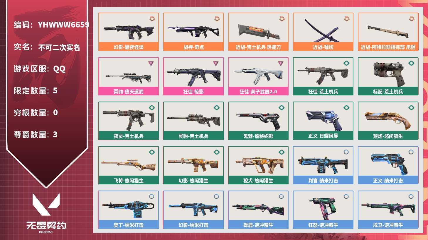 【无畏契约】【yhwww6458】等级:89,已用无畏点43130,已用源晶点950,橙皮:近战-rgx 11z pro3.0 爪刀|狂徒-归零者|狂徒-混沌序曲|近战-荒土机兵 热能刀|近战-鬼丸国纲|近战-神圣领域 战刀|飞将-西部未来|正义-西部未来|奥丁-西部未来|幻影-西部未来|近战-未来开拓者|近战-诡秘蛇影 军刀|戍卫-电音光谱|獠犬-电音光谱|标配-电音光谱|幻影-电音光谱|近战-谐波音谱__紫皮:幻影-紫阙金琅2.0|冥驹-离子武器|狂徒-紫阙金琅|战神-般若假面2.0|獠犬-般若假面2.0|狂徒-般若假面2.0|狂怒-般若假面2.0|幻影-神中神罚__段位:超凡__蓝皮:判官-纳米打击|正义-纳米打击|奥丁-纳米打击|幻影-纳米打击|雄鹿-逆冲蛮牛|狂怒-逆冲蛮牛|戍卫-逆冲蛮牛|獠犬-逆冲蛮牛|鬼魅-星云暗涌|骇灵-星云暗涌|正义-月球哨兵|莽侠-月球哨兵|戍卫-月球哨兵|雄鹿-月球哨兵|冥驹-星云暗涌|蜂刺-星云暗涌|蜂刺-折光棱晶|戍卫-折光棱晶|标配-折光棱晶|飞将-末日之翼|幻影-末日之翼|短炮-末日之翼|奥丁-末日之翼|蜂刺-甜心猎手|短炮-甜心猎手|莽侠-甜心猎手|幻影-甜心猎手|戍卫-甜心猎手|正义-诛心猎手|冥驹-诛心猎手|獠犬-诛心猎手|奥丁-诛心猎手__绿皮:狂徒-荒土机兵|标配-荒土机兵|骇灵-荒土机兵|冥驹-荒土机兵|獠犬-神圣领域|狂怒-神圣领域|战神-神圣领域|幻影-神圣领域|鬼魅-流星兵团|判官-诡秘蛇影|鬼魅-诡秘蛇影|莽侠-诡秘蛇影|狂徒-诡秘蛇影|狂徒-幻心猎手|鬼魅-幻心猎手__英雄:尚勃勒|维斯|黑梦|斯凯|暮蝶|盖可|霓虹|壹决|幽影|夜露|钢锁|奇乐|炼狱|铁臂|贤者|猎枭|钛狐|芮娜|零|捷风|不死鸟|幻棱|禁灭__金皮:幻影-a x 颗秒