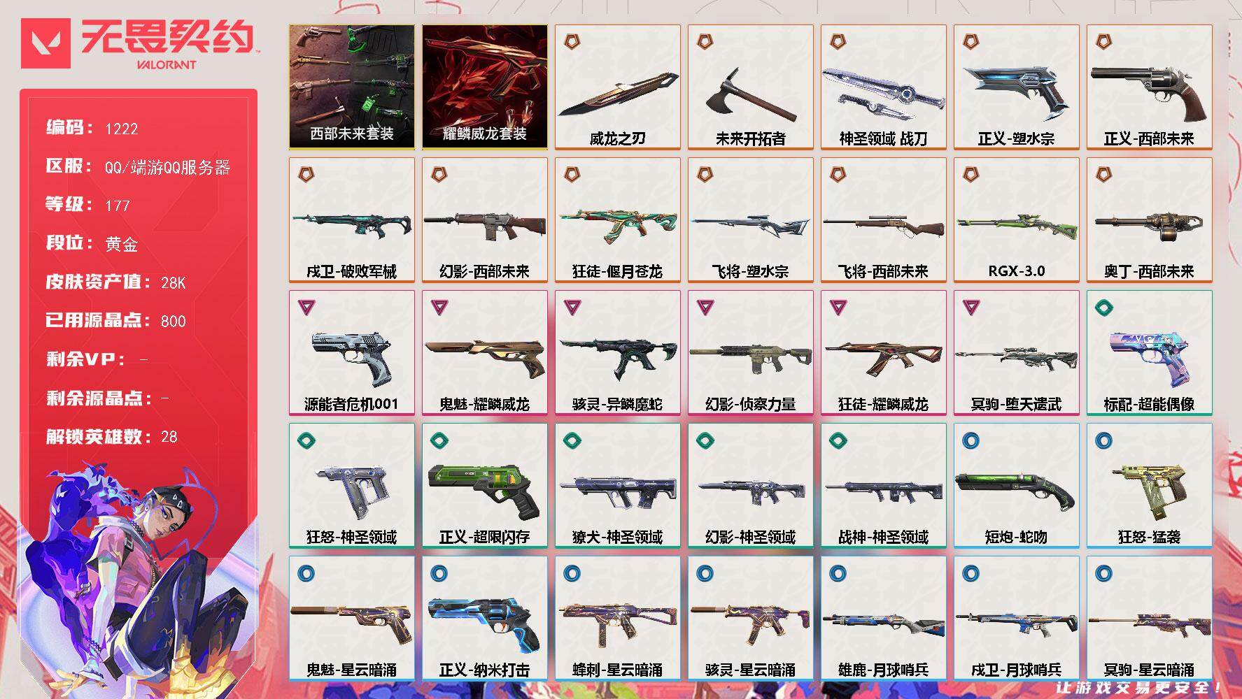 [12945546]皮肤资产43000/【套装】:2022全球冠军赛套装,耀鳞威龙套装,起源套装 【英雄】:幻棱,炼狱,维斯,暮蝶,钛狐,壹决,铁臂,捷风,雷兹,幽影,不死鸟,贤者,猎枭,蝰蛇,零,芮娜,奇乐,尚勃勒,霓虹,斯凯,夜露,星礈,k/o,海神,盖可,黑梦,钢锁【近战 武器】:近战武器-2022全球冠军赛 蝴蝶刀,近战武器-黑波之刃,近战武器-威龙之刃,近战武器-珍珠棘贝 短剑,近战武器-钢轨卫士 战锤,近战武器-弧光异彩 军刀,近战武器-机动狂飙 战刀,近战武器-起源 环刃 【狂徒】:狂徒-洪荒怒焰,狂徒-混沌序曲,狂徒-起源,狂徒-日冕雄师,狂徒-耀鳞威龙,狂徒-钢轨卫士,狂徒-弧光异彩 【幻影】:幻影-2022全球冠军赛,幻影-噬源兽防卫工程,幻影-珍珠棘贝,幻影-战术小伙伴 【戍卫】:戍卫-紫阙金琅,戍卫-钢轨卫士,戍卫-珍珠棘贝,戍卫-彩梦之城,戍卫-萌彩剪影 【獠犬】:獠犬-弧光异彩,獠犬-复古浪潮,獠犬-胡桃狂想,獠犬-战术小伙伴 【冥驹】:冥驹-起源,冥驹-复古浪潮,冥驹-胡桃狂想 【飞将】:飞将-天界神兵,飞将-沙尘幻旅,飞将-信手涂鸦,飞将-光导纤维 【莽侠】:莽侠-深海水族 【战神】:战神-奇点,战神-盖亚的复仇//2.0,战神-萌彩剪影,战神-深海水族 【奥丁】:奥丁-巨神铁甲,奥丁-信手涂鸦,奥丁-战术小伙伴 【判官】:判官-偃月苍龙,判官-萌彩剪影 【雄鹿】:雄鹿-起源,雄鹿-彩梦之城,雄鹿-复古浪潮 【骇灵】:骇灵-沙尘幻旅,骇灵-珍珠棘贝,骇灵-光导纤维,骇灵-信手涂鸦 【蜂刺】:蜂刺-弧光异彩,蜂刺-胡桃狂想,蜂刺-深海水族,蜂刺-战术小伙伴 【标配】:标配-紫阙金琅,标配-浪漫雪国,标配-彩梦之城,标配-光导纤维 【正义】:正义-塑水宗,正义-多边形,正义-复古浪潮,正义-纳米打击 【鬼魅】:鬼魅-耀鳞威龙,鬼魅-光导纤维,鬼魅-胡桃狂想,鬼魅-信手涂鸦 【狂怒】:狂怒-起源,狂怒-钢轨卫士,狂怒-珍珠棘贝,狂怒-萌彩剪影 【短炮】:短炮-钢轨卫士,短炮-弧光异彩,短炮-深海水族 【卡面】:终章:激斗汉堡 卡面,进入射程 卡面,《双城之战》拥抱 卡面,精灵大战 卡面,欢迎来到底城 卡面,南瓜盛典 卡面,超限闪存 卡面,梦幻奶茶 卡面,源能反应 卡面,打造专属狂徒 卡面,零点嗅探设计图 卡面,表象之下 卡面,虹吸式咖啡壶 卡面,源能者美容