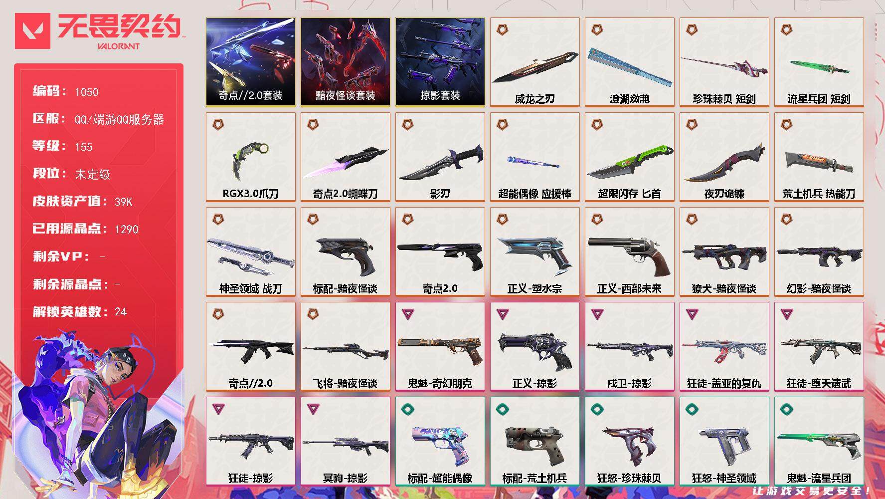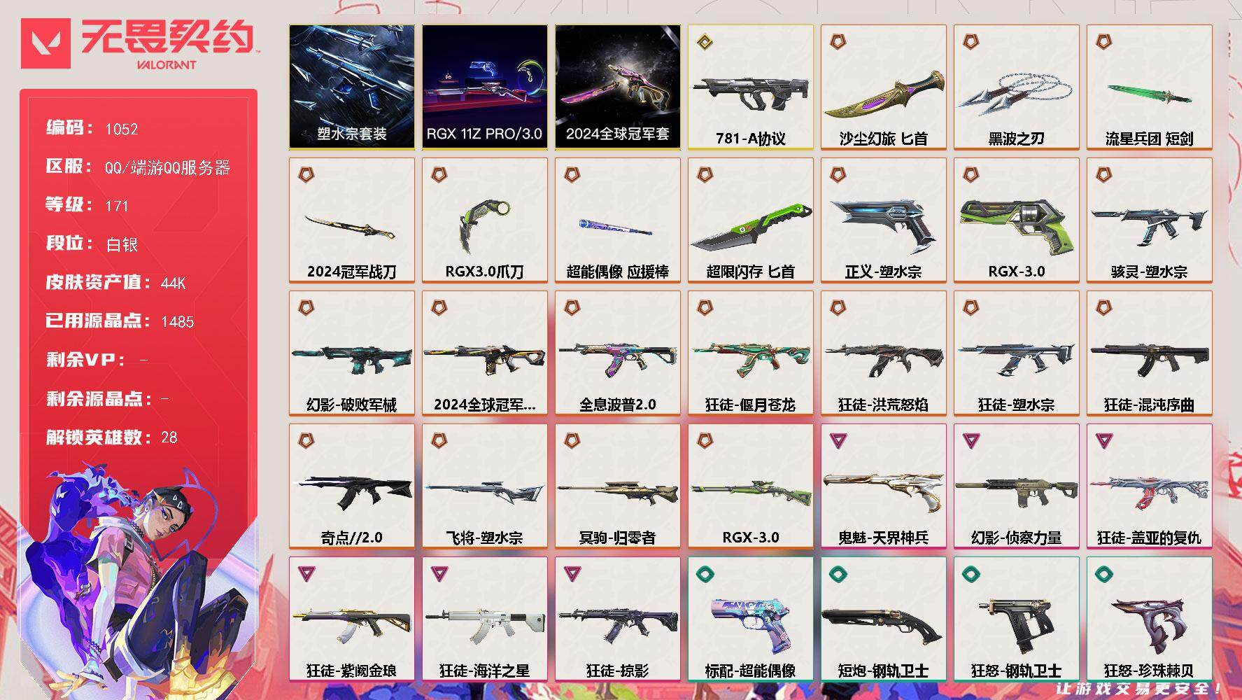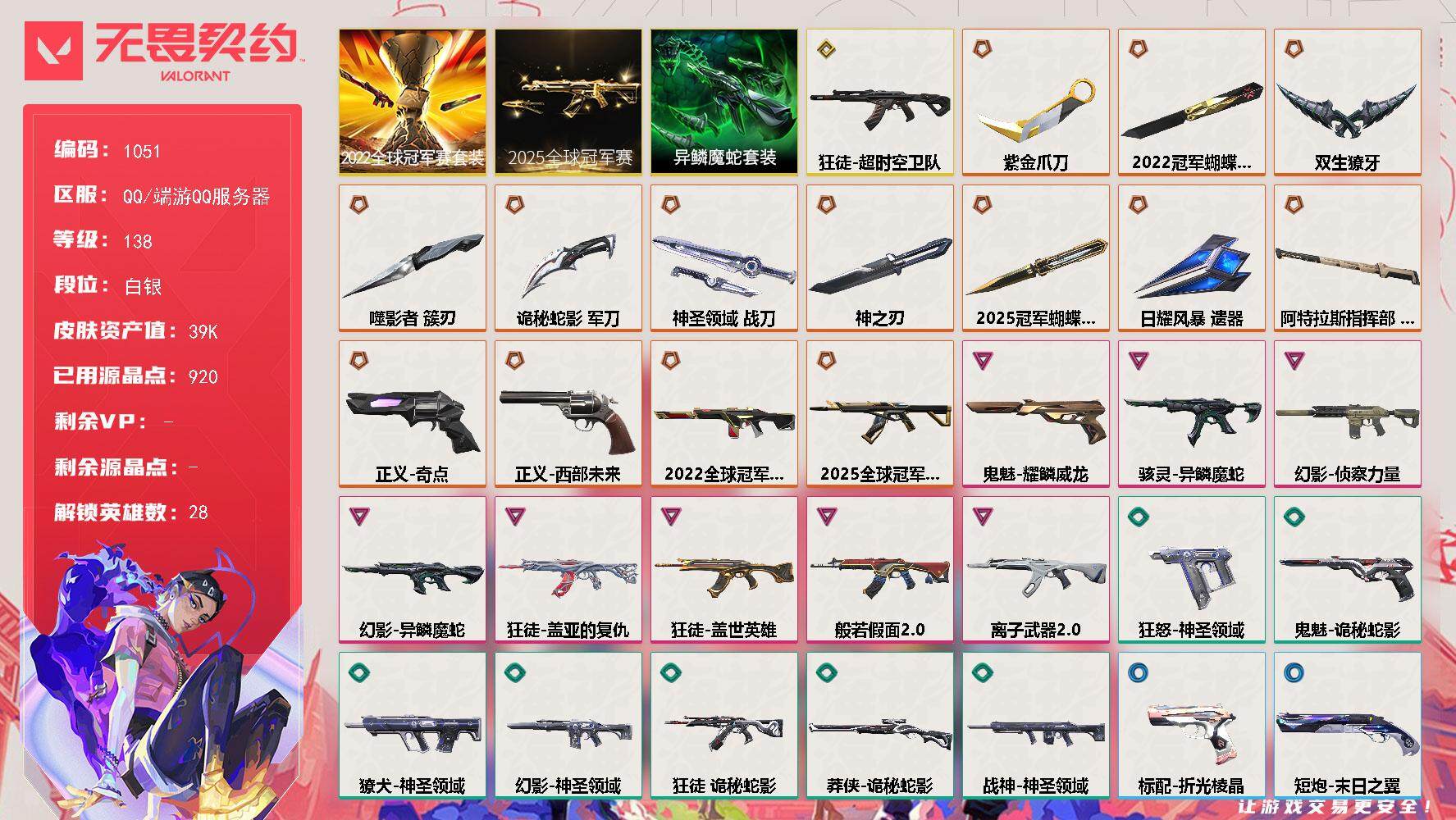 【1051】xl04268【套装】:2025全球冠军赛套装,2022全球冠军赛套装,异鳞魔蛇套装 【英雄】:幻棱,炼狱,维斯,暮蝶,钛狐,壹决,铁臂,捷风,雷兹,幽影,不死鸟,贤者,猎枭,蝰蛇,零,芮娜,奇乐,尚勃勒,霓虹,斯凯,夜露,星礈,k/o,海神,盖可,黑梦,钢锁 【近战 武器】:近战武器-2025全球冠军赛 蝴蝶刀,近战武器-2022全球冠军赛 蝴蝶刀,近战武器-神之刃,近战武器-紫金爪刀,近战武器-噬影者 簇刃,近战武器-双生獠牙,近战武器-诡秘蛇影 军刀,近战武器-神圣领域 战刀,近战武器-日耀风暴 遗器,近战武器-阿特拉斯指挥部 甩棍 【狂徒】:狂徒-超时空卫队,狂徒-2025全球冠军赛,狂徒-般若假面//2.0,狂徒-盖世英雄,狂徒-盖亚的复仇,狂徒-离子武器//2.0,狂徒-诡秘蛇影 【幻影】:幻影-2022全球冠军赛,幻影-侦察力量,幻影-异鳞魔蛇,幻影-神圣领域,幻影-末日之翼 【戍卫】:戍卫-月球哨兵,戍卫-折光棱晶 【獠犬】:獠犬-神圣领域 【冥驹】:冥驹-星云暗涌 【飞将】:飞将-末日之翼 【莽侠】:莽侠-诡秘蛇影,莽侠-月球哨兵 【战神】:战神-神圣领域 【奥丁】:奥丁-末日之翼 【判官】:判官-诡秘蛇影 【雄鹿】:雄鹿-月球哨兵 【骇灵】:骇灵-异鳞魔蛇,骇灵-星云暗涌 【蜂刺】:蜂刺-星云暗涌,蜂刺-折光棱晶 【标配】:标配-折光棱晶 【正义】:正义-奇点,正义-西部未来,正义-月球哨兵 【鬼魅】:鬼魅-耀鳞威龙,鬼魅-诡秘蛇影,鬼魅-星云暗涌 【狂怒】:狂怒-神圣领域 【短炮】:短炮-末日之翼 【卡面】:南瓜盛典 卡面,vct cn首冠 卡面,钢弓与箭弦 卡面,无畏契约:暮蝶 卡面,修车达人 卡面,热舞环节 卡面,正义的化身 卡面,无畏契约go!第一卷:芮娜 卡面,无畏契约go!第一卷:零 卡面,《双城之战》金克丝 卡面,无畏契约go!第一卷:贤者 卡面,代号红色 卡面,新兵报到 卡面,v契约 卡面,无畏契约 卡面 【喷漆】:伤心心 喷漆,熊抱 喷漆,蛋糕还是爆能器? 喷漆,买装还是存钱 喷漆,胜利属于无畏契约 喷漆,glhf 喷漆,无畏契约 喷漆 【挂饰】:v25第三幕:超凡 挂饰,第九季//第三幕 纪念币 挂饰,瞬云履 挂饰,第九季//第二幕 纪念币 挂饰,z世代特饮 挂饰,天外飞客 挂饰,红鳞松叶 挂饰,《双城之战》魄罗 挂饰,高音谱号 挂饰,无畏契约 纪念币 挂饰