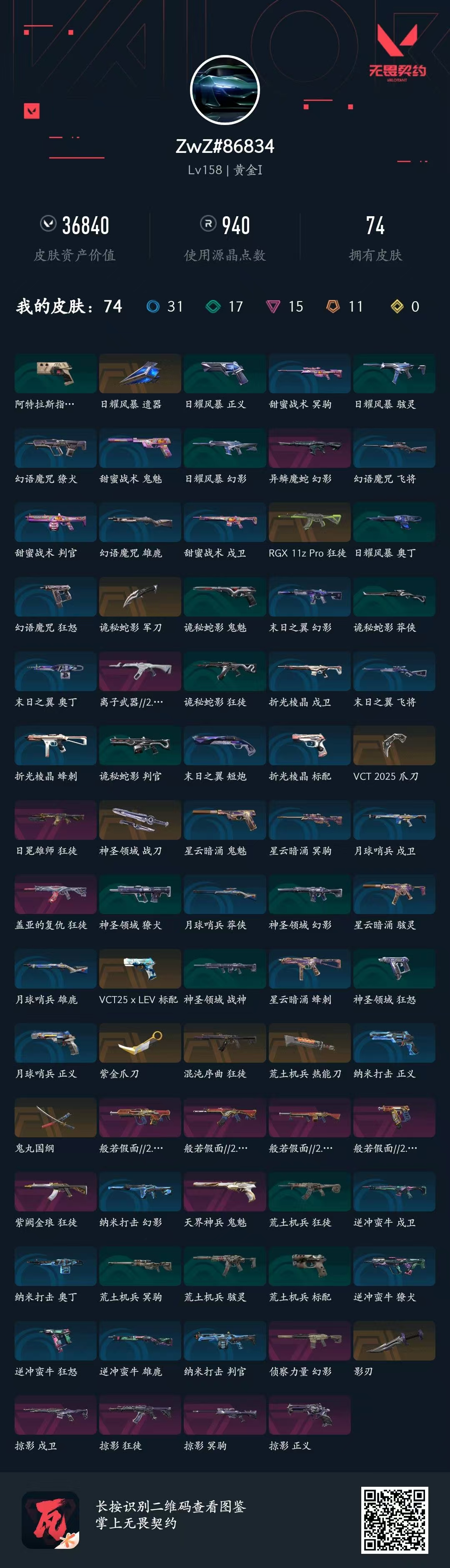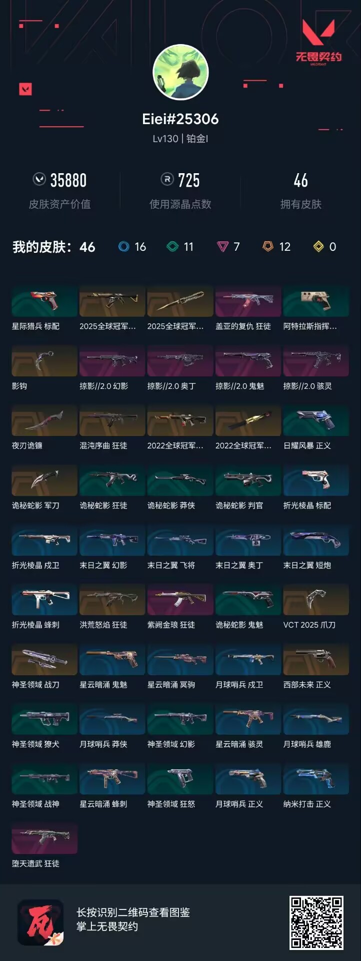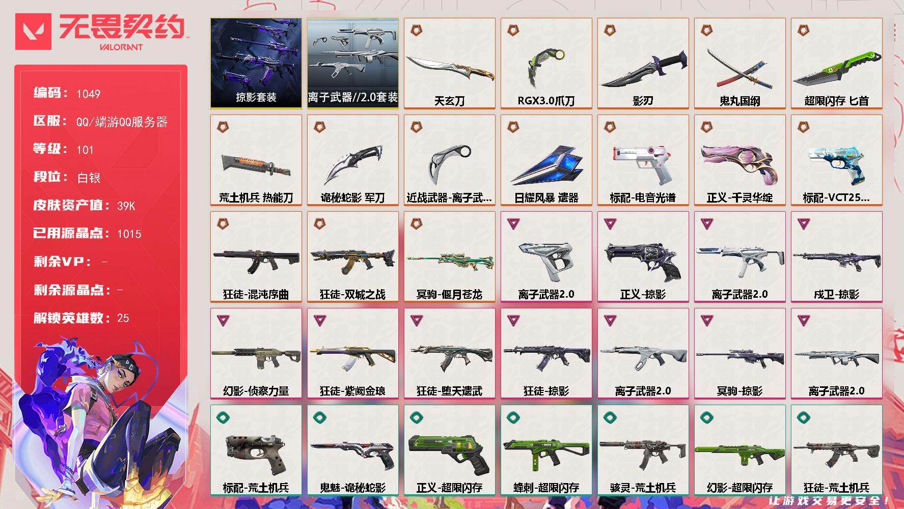 【1051】xl04268【套装】:2025全球冠军赛套装,2022全球冠军赛套装,异鳞魔蛇套装 【英雄】:幻棱,炼狱,维斯,暮蝶,钛狐,壹决,铁臂,捷风,雷兹,幽影,不死鸟,贤者,猎枭,蝰蛇,零,芮娜,奇乐,尚勃勒,霓虹,斯凯,夜露,星礈,k/o,海神,盖可,黑梦,钢锁 【近战 武器】:近战武器-2025全球冠军赛 蝴蝶刀,近战武器-2022全球冠军赛 蝴蝶刀,近战武器-神之刃,近战武器-紫金爪刀,近战武器-噬影者 簇刃,近战武器-双生獠牙,近战武器-诡秘蛇影 军刀,近战武器-神圣领域 战刀,近战武器-日耀风暴 遗器,近战武器-阿特拉斯指挥部 甩棍 【狂徒】:狂徒-超时空卫队,狂徒-2025全球冠军赛,狂徒-般若假面//2.0,狂徒-盖世英雄,狂徒-盖亚的复仇,狂徒-离子武器//2.0,狂徒-诡秘蛇影 【幻影】:幻影-2022全球冠军赛,幻影-侦察力量,幻影-异鳞魔蛇,幻影-神圣领域,幻影-末日之翼 【戍卫】:戍卫-月球哨兵,戍卫-折光棱晶 【獠犬】:獠犬-神圣领域 【冥驹】:冥驹-星云暗涌 【飞将】:飞将-末日之翼 【莽侠】:莽侠-诡秘蛇影,莽侠-月球哨兵 【战神】:战神-神圣领域 【奥丁】:奥丁-末日之翼 【判官】:判官-诡秘蛇影 【雄鹿】:雄鹿-月球哨兵 【骇灵】:骇灵-异鳞魔蛇,骇灵-星云暗涌 【蜂刺】:蜂刺-星云暗涌,蜂刺-折光棱晶 【标配】:标配-折光棱晶 【正义】:正义-奇点,正义-西部未来,正义-月球哨兵 【鬼魅】:鬼魅-耀鳞威龙,鬼魅-诡秘蛇影,鬼魅-星云暗涌 【狂怒】:狂怒-神圣领域 【短炮】:短炮-末日之翼 【卡面】:南瓜盛典 卡面,vct cn首冠 卡面,钢弓与箭弦 卡面,无畏契约:暮蝶 卡面,修车达人 卡面,热舞环节 卡面,正义的化身 卡面,无畏契约go!第一卷:芮娜 卡面,无畏契约go!第一卷:零 卡面,《双城之战》金克丝 卡面,无畏契约go!第一卷:贤者 卡面,代号红色 卡面,新兵报到 卡面,v契约 卡面,无畏契约 卡面 【喷漆】:伤心心 喷漆,熊抱 喷漆,蛋糕还是爆能器? 喷漆,买装还是存钱 喷漆,胜利属于无畏契约 喷漆,glhf 喷漆,无畏契约 喷漆 【挂饰】:v25第三幕:超凡 挂饰,第九季//第三幕 纪念币 挂饰,瞬云履 挂饰,第九季//第二幕 纪念币 挂饰,z世代特饮 挂饰,天外飞客 挂饰,红鳞松叶 挂饰,《双城之战》魄罗 挂饰,高音谱号 挂饰,无畏契约 纪念币 挂饰