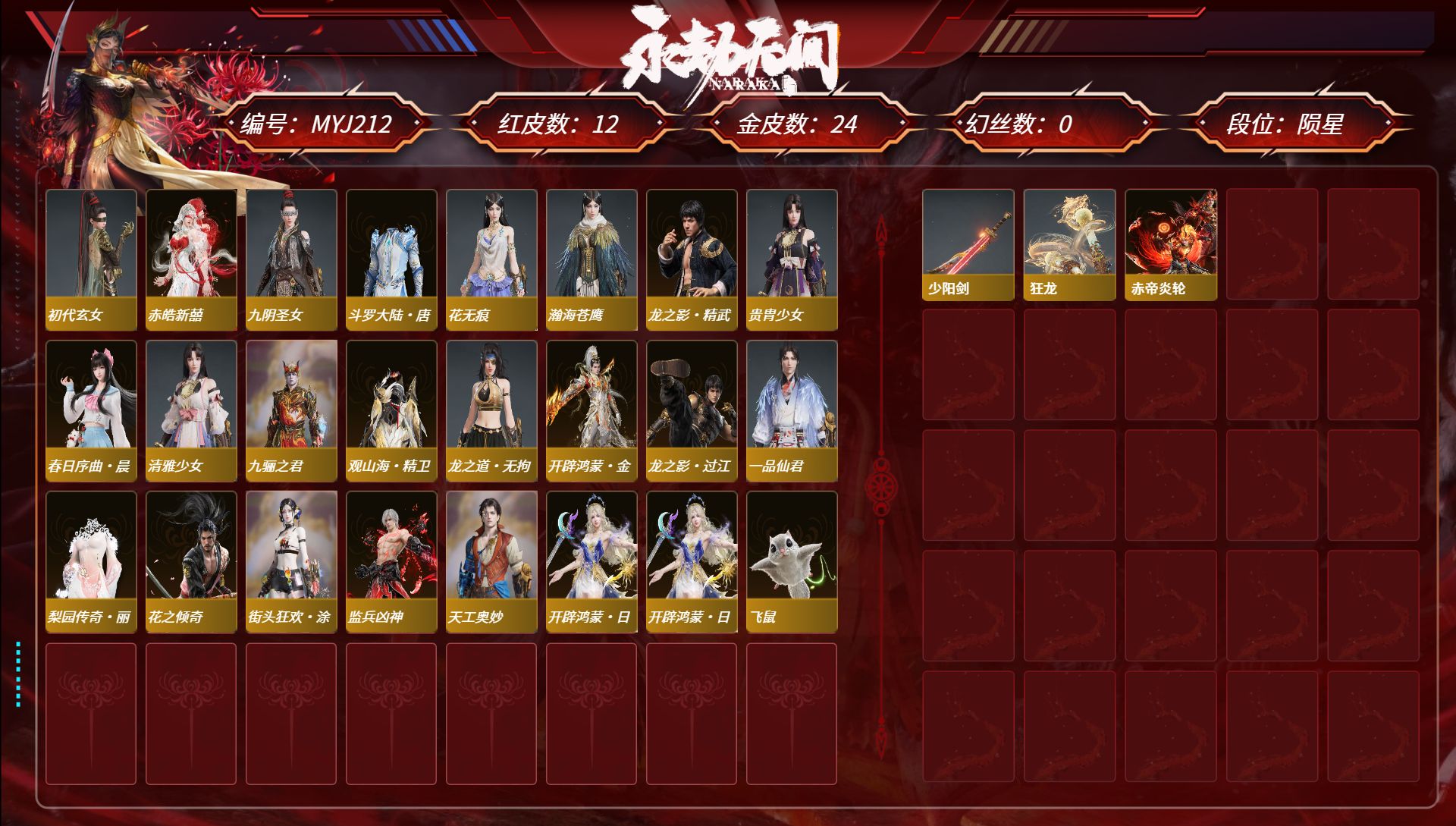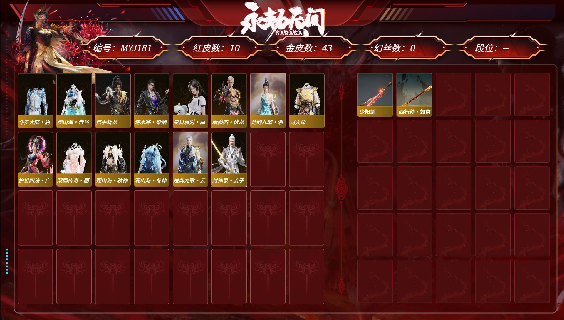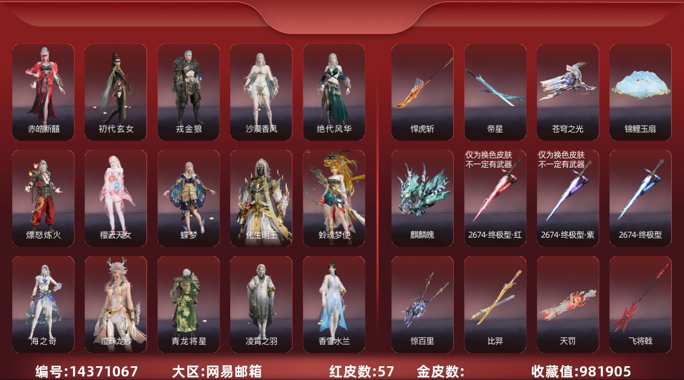 [14371067]9deb45网易邮箱57个红皮谪星·无定法(2孔),谪星·2p,初樱绮梦胡桃发型,棠华映露玉玲珑发型,泳装13个【高校水着(胡桃),椰风夕照(季沧海),热海白珊(妖刀姬),午后瑰夏(宁红夜),昭夏流金(迦南),仲夏霜华(顾清寒),弄潮逐浪(崔三娘)下次换绑时间2025/7/9,等待换绑期间可以登入网易大神直接进入游戏不影响游戏体验。网易支付未实名道具货币都是默认已使用.,半夏晚风(魏轻),夏海伏浪(天海),初夏绯莓(沈妙),长夏清澜(殷紫萍),盛夏白阳(季莹莹),赤夏悠漾(玉玲珑),精武魂(季沧海),】奥义特效14个【神君印(岳山),赤徽(岳山),炎烈珠(季沧海),初代机(沈妙),绿野守护·竹韵悠(沈妙),神乌造像(天海),石龛造像(天海),珥冰(天海),百战·枷锁(魏轻),楚韵九歌·四海(哈迪),噬骨哈迪),镇冥司刘炼),雪霜姿顾清寒),宝葫芦(玉玲珑),】小技能特效6个【剪纸·彩刀(妖刀姬),三娃葫芦(天海),千秋匠心·凶虎(胡为),观山海·春木(殷紫萍),霜翎哈迪),拳皇·勾玉胡为),】胡为吕布全套,胡为孙悟空全套,岳山杨戬变身器三尖两刃刀全套,岳山关羽全套,岳山2674衣服变身器高达套装,武器红皮26个【2674·终极型,悍虎斩,帝星,惊百里,麒麟魄,烈阳,西行劫·如意金箍棒,冰魄,2674·九阴,飞将戟,锦鲤玉扇,比羿,灵狐幻刃,天琼,涯角,逆晦朔,凤求凰,狂龙,少阳剑,灵犀,狼主,苍穹之光,天罚,毕方,2674·终极型·紫,2674·终极型·红,】其他红皮31个【初樱绮梦,棠华映露,流金晓锦,画中仙,星辉魔纱,樱云天女,守墨麟,逐光者,夜魅游莹,监兵凶神,执明神君,化道者,通天狐袄,暮光胴丸,赤皓新囍,化生明王,泣珠龙纱,青龙将星,墨离,长天藏锦,蛉魂梦使,海之奇,香雪水兰,朱雀星衣,沙漠香风,蝶梦,凌霄之羽,初代玄女,戎金狼,绝代风华,熛怒炼火,】飞鼠,劫涛·潮,春桃笑,唐舞桐,昊天,小舞,海神三叉戟,流火映真,观山海·腓腓,杨戬,悟空,2674·街头烈火,春日序曲·赤羽,唐三,霍雨浩,庖丁·食神,信手斩龙,龙之影·龙虎斗,春日序曲·晨风,新魔杰·辟邪帝姬,西行劫·悟净,千秋匠心·青枝瓷,新魔杰·斩魔天将,孽炎祸斗,百战·破荆者,观山海·夏神祝融,护世四法·增长天王,巨阙,龙之道·自知,
