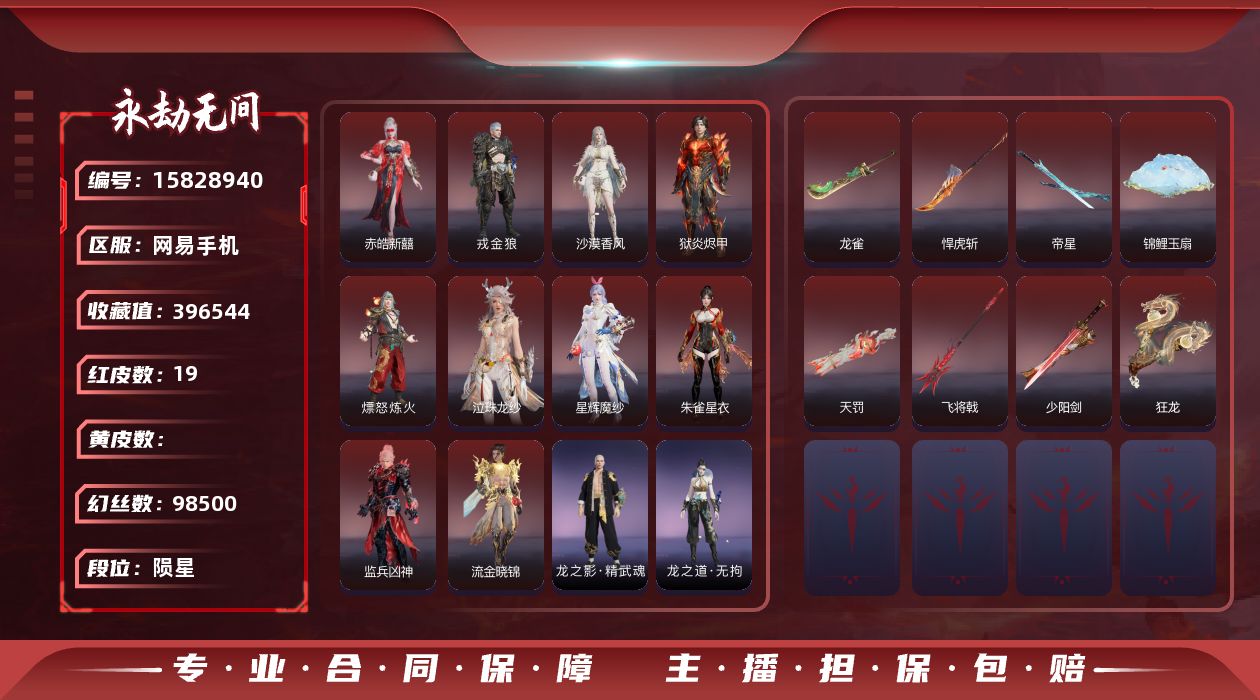 [15828499]wj4109,网易手机,2月21可换绑,三人段位蚀月3,裂变三排无相龙王,裂变双排无量梵天,侠风三排无相龙王,侠风双排无量梵天,侠风双排百强武尊,侠风极百强武尊,1谪星,47红,1067金,声望11,谪星2p,空折枝,残雪琉璃瓠,缠缠,雪霜姿,镇冥司,噬骨,霜翎,夜蔷薇,凶虎,神君印,2674初代机,神乌造像,炎烈珠,炎魄焚心,少阳剑,冰魄,断昼吟,太玄之刃,2674九阴,灵狐幻刃,帝星,比羿,龙雀,狼主,飞将戟,涯角,灵犀,如意金箍棒,天琼,锦鲤玉扇,狂龙,凤求凰,惊百里,天罚,苍穹之光,毕方,赤皓新囍,初代玄女,星辉魔纱,化生明王,长天藏锦,戎金狼,熛怒炼火,樱云天女,泣珠龙纱,青龙将星,凌霄之羽,香雪水兰,暮光眮丸,绝代风华,沙漠香风,监兵凶神,夜魅游莹,通天狐妖,化道者,执明神君,流金晓锦,守墨麒,寒梅傲雪,墨离,生死局,精武魂,冲冠,至纯,无拘,过江龙,灵心,弄潮逐浪,甜筒兔,高校水着,仲夏霜华,赤夏悠漾,逐浪砂阳,胧月魂,无相印,隐锋,醉花风,鎏金勺,幻彩泡泡,雷王锯,千钧羽,墨檀香,除岁,天威,玄武,云朵咩咩,悠竹萌客,瑶光沐月,李星云,瑞火麟,掌珠仙子,金羽客,寒芷,斑斓衣,金财聚辉,碎月缎光,匣中女郎,飞鼠,花海台,提步,傲立,木棉,男性发型14,活动中心手机绑定无法解绑