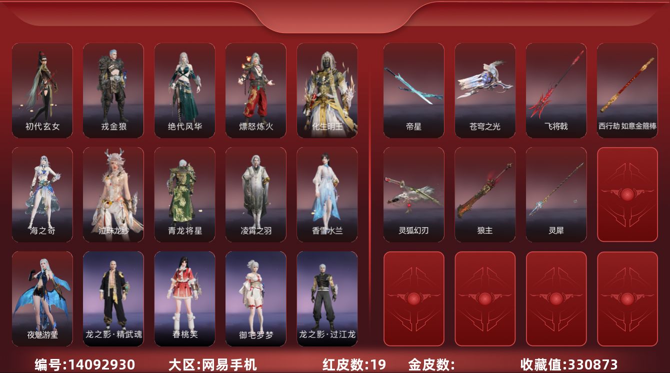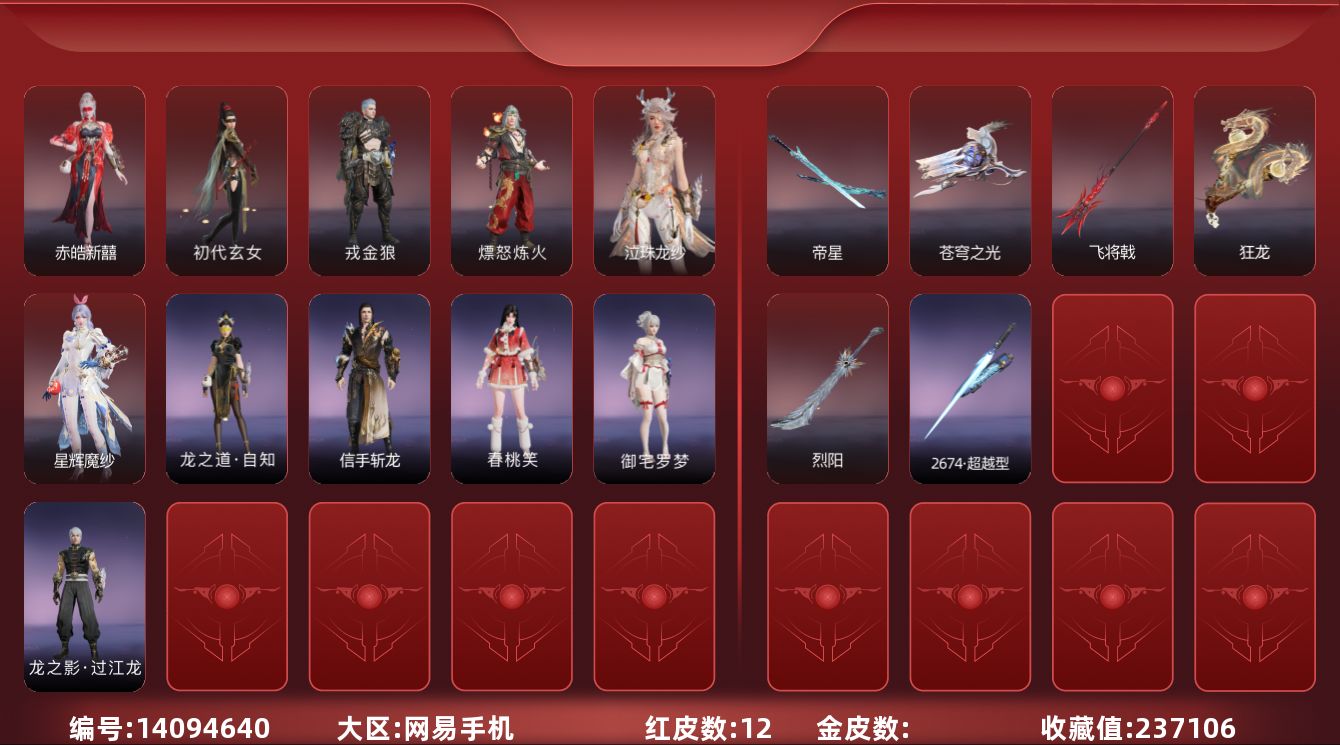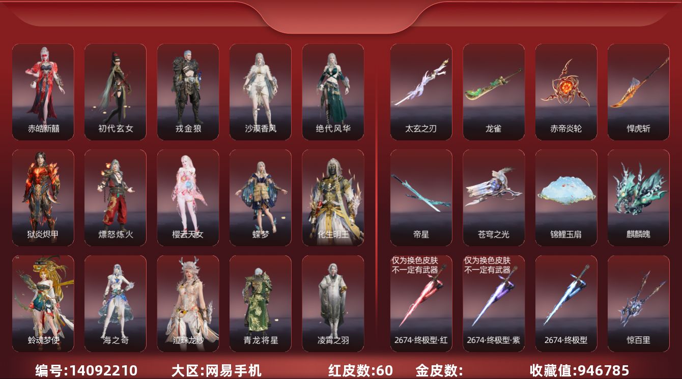 [14092210]wj2944,网易手机,12月19日可换绑,三人段位蚀月5,1谪星,60红,1227金,谪星沧澜绡,2孔1紫1蓝,好椰,销兵镝遗,御祥云,雪霜姿,镇冥司,噬骨,霜翎,绿野守护竹韵悠,夜蔷薇,百战枷锁,四海,凶虎,彩俑娃娃,剪纸彩刀,春木,神君印,2674初代机,神乌造像,炎烈珠,炎魄焚心,墨离,赤帝炎轮,麒麟魄,少阳剑,冰魄,2674终极型,2674终极型紫,2674终极型红,太玄之刃,2674九阴,灵狐幻刃,帝星,比羿,龙雀,烈阳,狼主,悍虎斩,飞将戟,涯角,灵犀,如意金箍棒,天琼,锦鲤玉扇,逆晦朔,狂龙,凤求凰,惊百里,天罚,苍穹之光,毕方,赤皓新囍,初代玄女,星辉魔纱,朱雀星衣,化生明王,长天藏锦,戎金狼,狱炎烬甲,熛怒炼火,樱云天女,蝶梦,蛉魂梦使,泣珠龙纱,海之奇,青龙将星,凌霄之羽,香雪水兰,暮光眮丸,绝代风华,沙漠香风,监兵凶神,夜魅游莹,通天狐袄,化道者,执明神君,流金晓锦,守墨麒,逐光者,画中仙,自知,求真,龙虎斗,精武魂,至纯,生死局,无拘,过江龙,灵心,椰风夕照,高校水着,热海白珊,弄潮逐浪,仲夏霜华,长夏清澜,赤夏悠漾,初夏绯莓,盛夏白阳,甜筒兔,匣中女郎,翠影,天狐,白鹿,锁魂斩怨,劫涛潮,冰辉,腾云歌,白熊,鹅黄纱梦,禄运玉霄,獬豸,山漠狞影,雪铃绮歌,提步,男性发型14,木棉,活动中心手机绑定无法解绑,找回包赔,