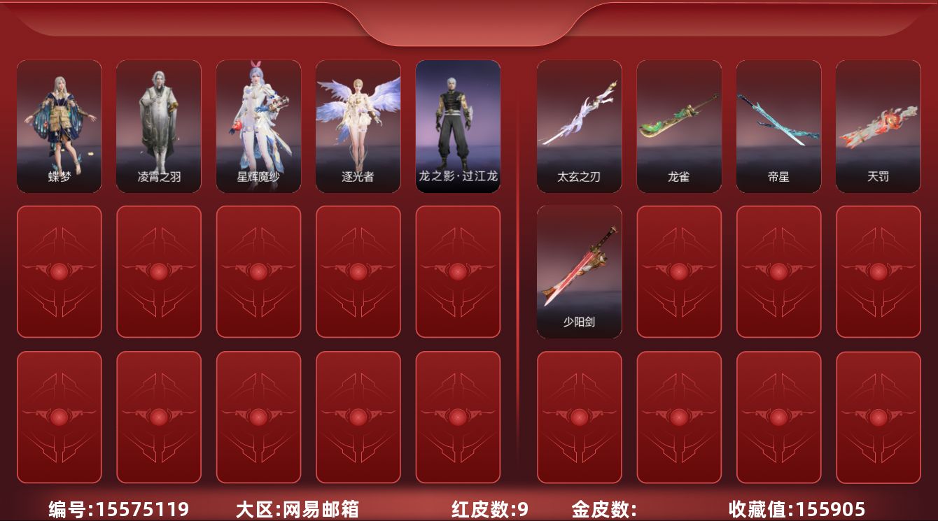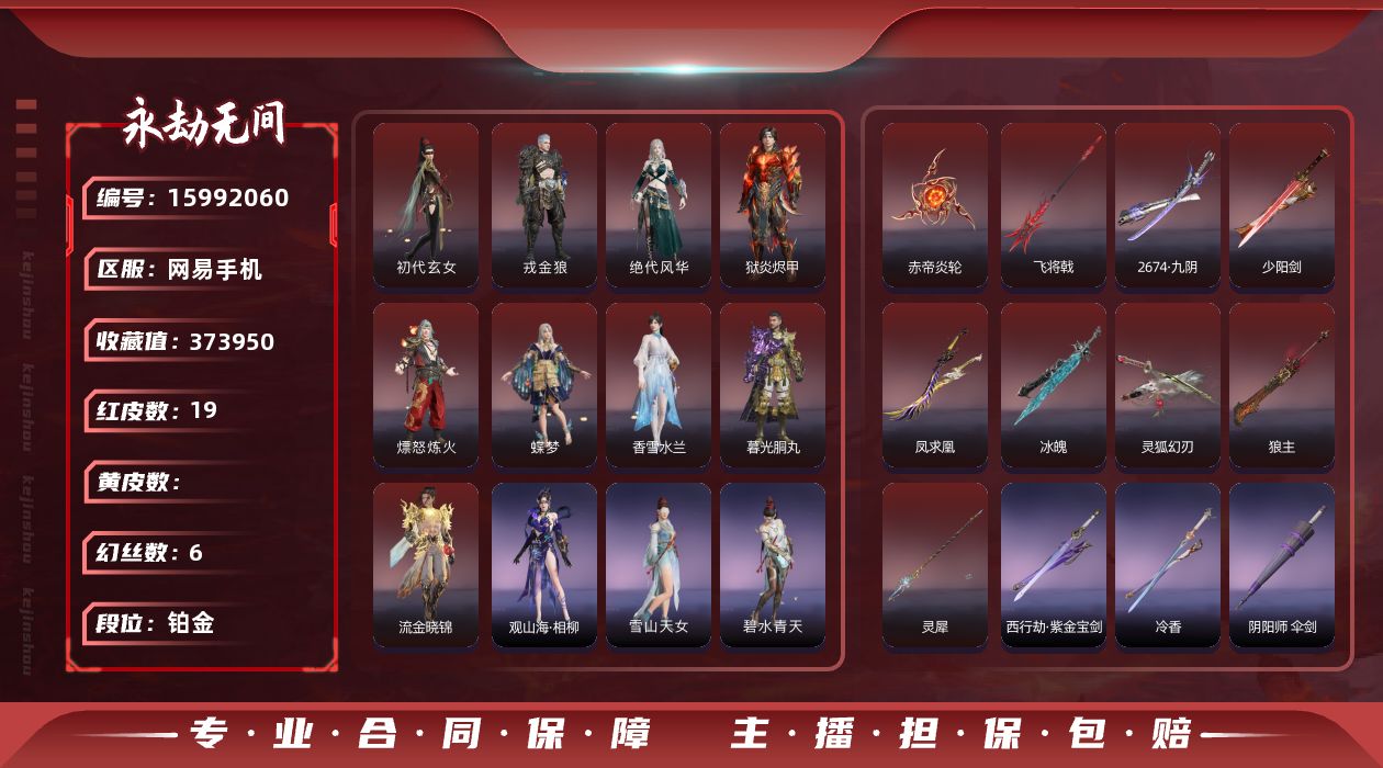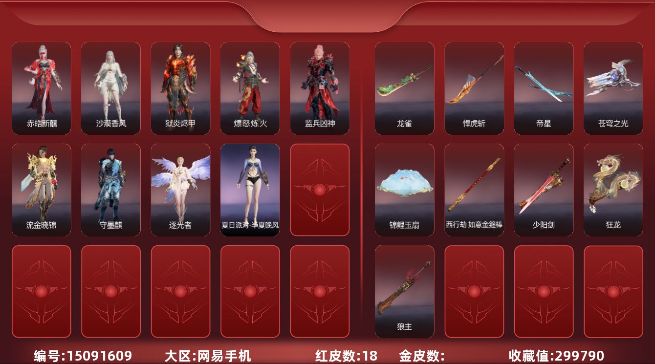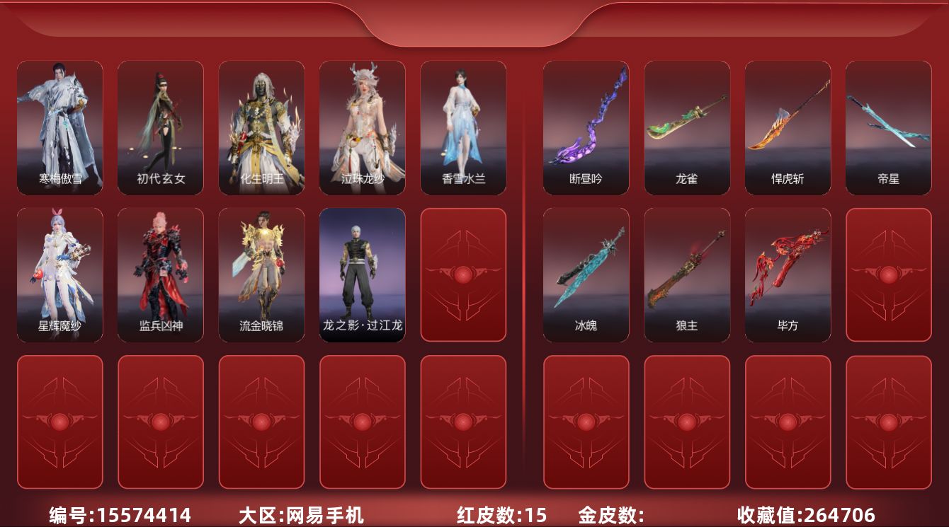 [15992060]1e5571网易手机19个红皮谪星·扶桑劫(2孔),谪星·沧澜绡(1孔),泳装1个【热海白珊(妖刀姬),】奥义特效1个【石龛造像(天海),】下次换绑时间2025/6/10,等待换绑期间可以登入网易大神直接进入游戏不影响游戏体验。网易支付无法注销,道具货币都是默认已使用.尼尔衣服全套,武器红皮9个【赤帝炎轮,冰魄,2674·九阴,飞将戟,灵狐幻刃,凤求凰,少阳剑,灵犀,狼主,】其他红皮10个【流金晓锦,狱炎烬甲,暮光胴丸,墨离,香雪水兰,蝶梦,初代玄女,戎金狼,绝代风华,熛怒炼火,】飞鼠,劫涛·潮,自动人形·2b,自动人形·a2,悟空,龙心炽焰,龙之影·龙虎斗,花无痕,枫行者,自动人形·9s,孽炎祸斗,百战·破荆者,护世四法·增长天王,巨阙,龙之道·自知,金羽圣鹰,轩辕剑·拓跋玉儿,惊云羽,龙门·飞天,神鹰之女,主祭者,天钿女命,日道神子,龙之影·生死局,决战平安京·御神之刃,龙之影·过江龙,守誓者,轩辕剑·陈靖仇,常胜袍,龙之道·无拘,掌珠仙子,金羽客,司天命,姑射真人,寒英素雪,春雪,沐昭,观山海·冬神玄冥,百战·断链,干将莫邪,观山海·秋神蓐收,复制体·凯妮,黄昏巫主,沙海之鸠,劫涛·潮,西行劫·三尖两刃刀,咯咯,咕咕(连弩),葫芦兄弟·蛤蟆头领,封神录·申公豹,观山海·相柳,赤雾烟霞