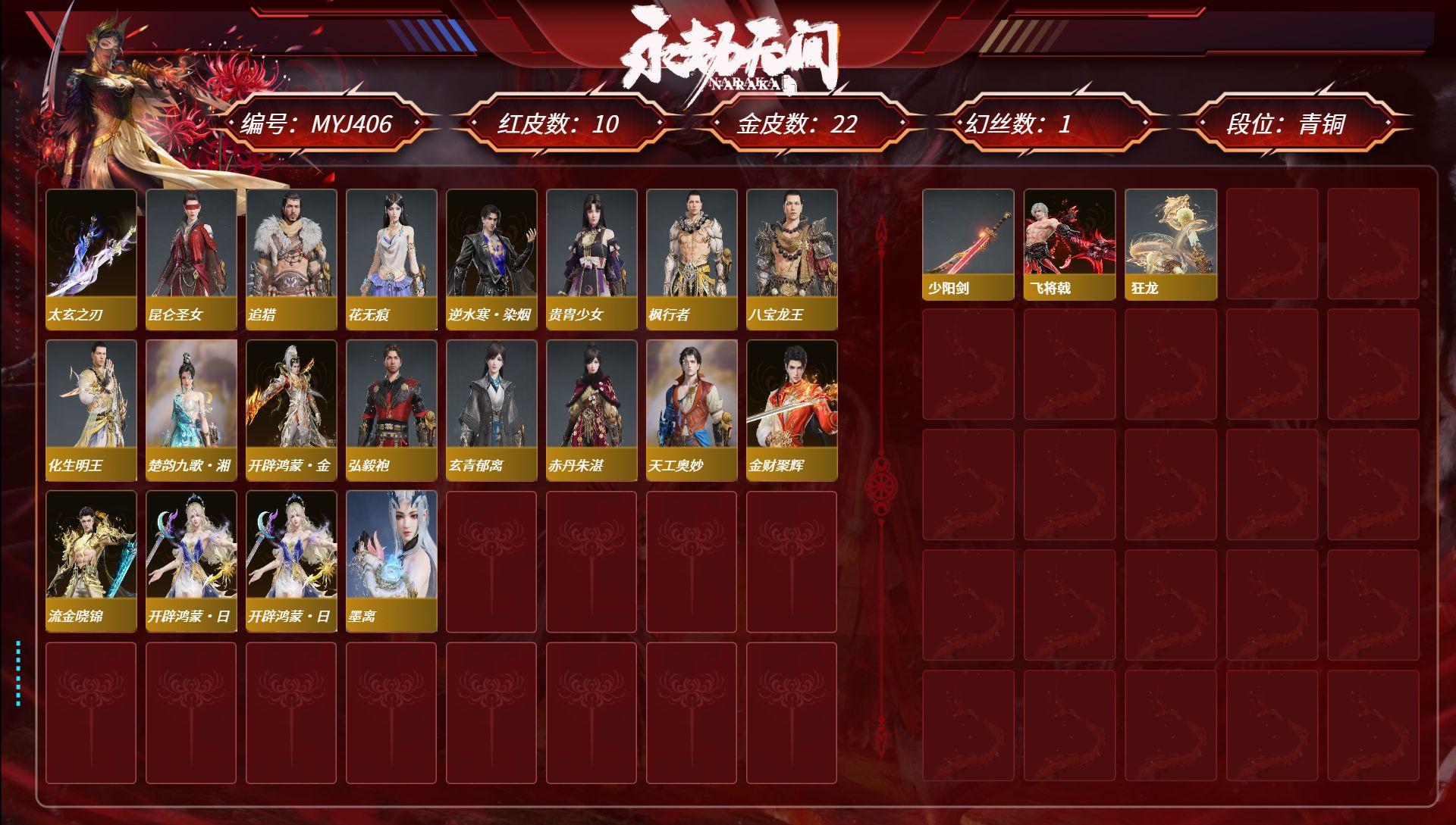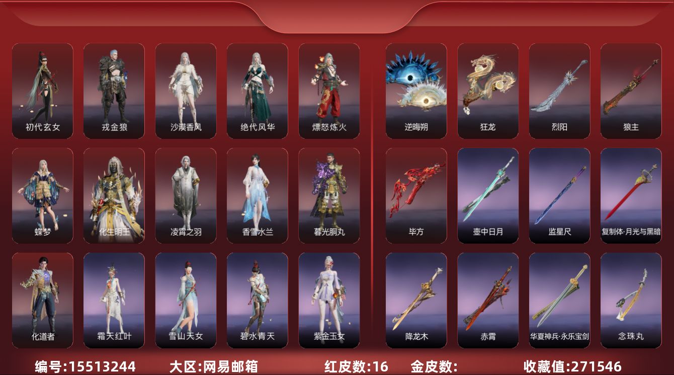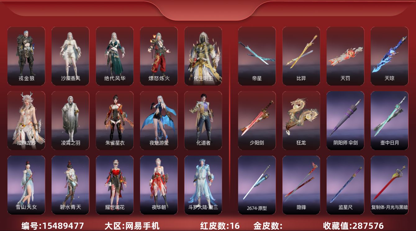 [15513244]yjj1294/2.9换绑/等级248/s19三人黄金4/18红312金收藏值271546/初代玄女/化生明王/新倩女幽魂·长天藏锦/戎金狼/熛怒炼火/蝶梦/凌霄之羽/香雪水兰/暮光胴丸/绝代风华/沙漠香风/化道者/毕方/烈阳/狼主/逆晦朔/狂龙/凤求凰//耀世魂花/紫金玉女/龙之道·自知/霜天红叶/雪山天女/碧水青天/九阴圣女/绮云衫/西行劫·紫衣仙子/梨园传奇·法海/龙之影·生死局/觉之一念/枫行者/净金宝相/裟伽龙王/不动明王/智绘·萍之缘/新倩女幽魂·流纨裙/噬月天狼/苍狼之主/观山海·夏神祝融/瑞火麟/闻道/逆水寒·江海沧澜/醉山川/游四海/夏日派对·高校水着/山吹茶/龙之道·至纯/天钿女命/御宅罗梦/阴阳姬/清雅少女/贵胄少女/决战平安京·御神之刃/阴阳师·赤影妖刀姬/妖刀姬/观山海·文鳐/夏日派对·弄潮逐浪/蛰龙吟/掌珠仙子/伏波龙女/龙之道·无拘/长歌诗韵·戍关将/复制体·尼尔/华夏宝甲·归义/华夏宝甲·汉光/龙之影·过江龙/守誓者/骁骑/武道无穷·太极/司天命/若谷/赤丹朱湛/寒英素雪/苍雷丸/长歌诗韵·胡旋女/观山海·青鸟/火罗圣女/龙门·飞天/惊云羽/龙之道·求真/金羽圣鹰/月轮魅影/瀚海苍鹰/观山海·秋神蓐收/观山海·冬神玄冥/武道无穷·形意/黄昏巫主/暖冬茶馨/发型金色皮肤:缥缈发/韶光发/缘觉发/灿莲花发/子菀发/伏苓发/(挑染)暮落发/九州遗珍·春桃发/苍狼宗主发/逆水寒·江海发/(挑染)水仙发/(挑染)沸海发/激浪发/浩渺发/碎浪发/(挑染)觅封侯发/云长冠发/九梁发/(挑染)羽客发/冰凌发/阎摩发/翔鸾发/朝颜发/龙门·化羽发/(挑染)凤姿发/观山海·青鸾发/观山海·天刑发/观山海·冥泉发/流萤发/古溪发/武器金色皮肤:镇海/乱风云/朱雀/青鸟/出渊蛟/石中火/观山海·嘉果花/造景/火罗卫/竹霹雳/貔貅吞宝/吞海鲛/玄武/龙息/龙啸/虎踞/鹦鹉螺/炉中火/星追月/心魔/转轮弓/仙毫/日辉/腥红之月/古月/莲心剑雨/炎魔/胧月魂/监星尺/复制体·月光与黑暗/赤霄/降龙木/华夏神兵·永乐宝剑/壶中日月/黑绳/樱华/念珠丸/数珠丸/雷厉/龙蟠/决战平安京·不祥绯刃/暮影/阴阳师·妖刀/阔刀-阴阳师·赤影妖刀/观山海·朱明/观山海·金神钺/长虹/雪夜·清光引/建木/镰鼬剃/玄鲸骨叉/白虹/九尺沁金耙/护世四法·降魔/学宫之杖/倒马棍/桡尺刀