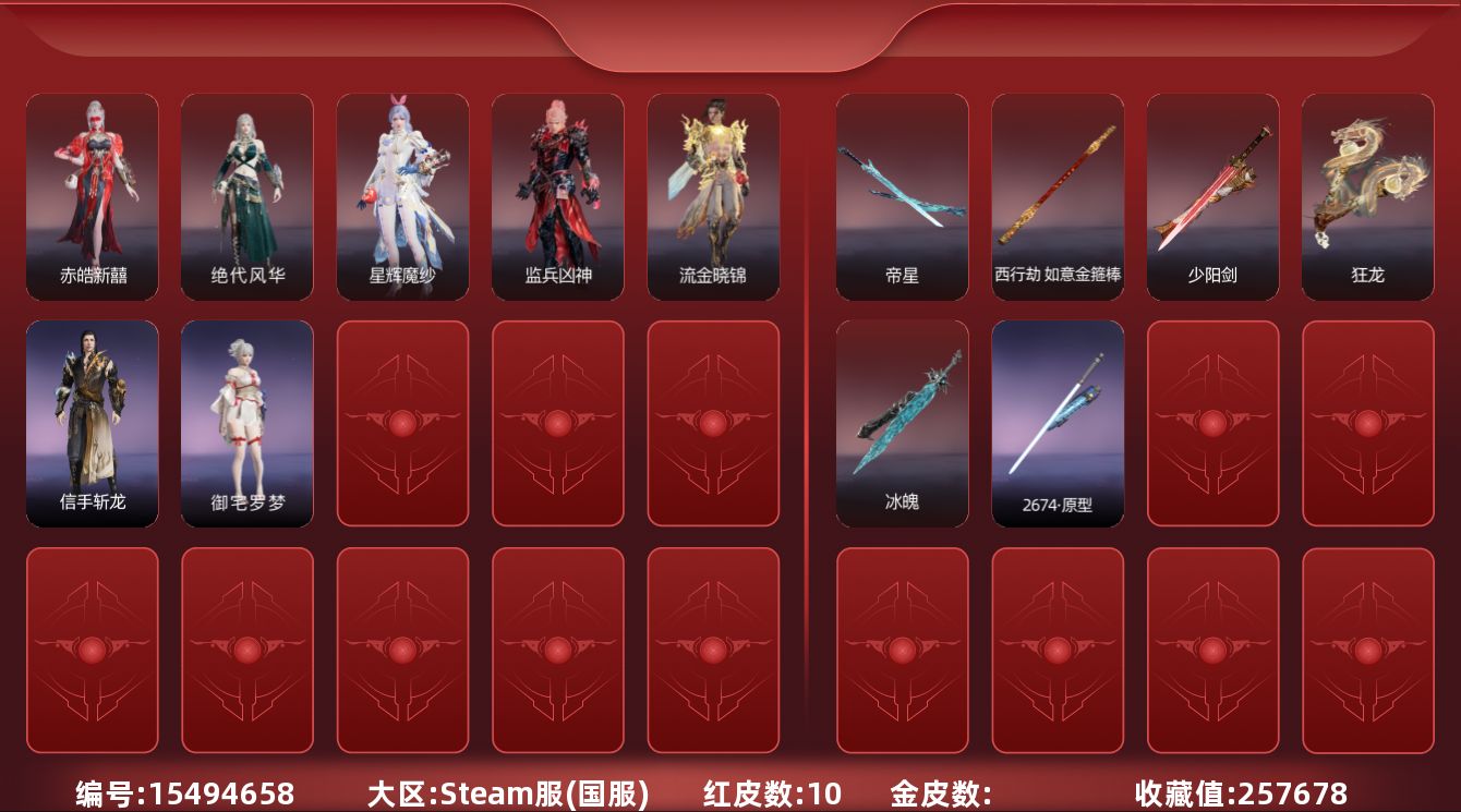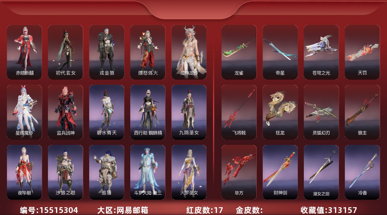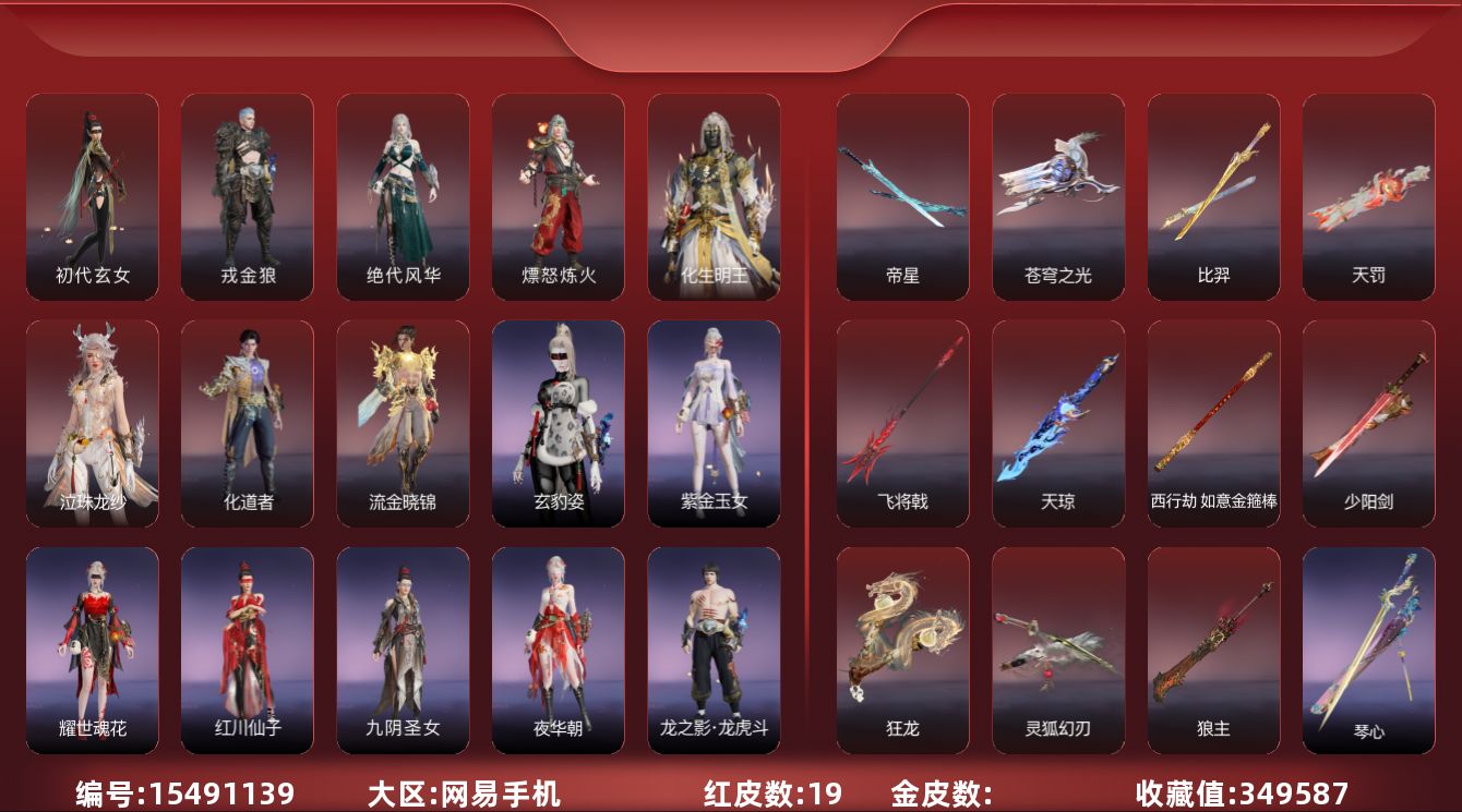 [15515304]yjj1304/2.9换绑/等级320/s19三人黄金4/19红459金收藏值313157///赤皓新囍/初代玄女/星辉魔纱/戎金狼/熛怒炼火/泣珠龙纱/监兵凶神/太玄之刃/灵狐幻刃/帝星/狼主/龙雀/飞将戟/狂龙/天罚/苍穹之光/毕方/墨离/【技能奥义】/初代机/揽九天/神君印/凶虎/勾玉 【武技外观】/穿仙洞·绯/仙洞十三迹·霞飞/封两仪·煌/无极封剑诀·珀华/破重霄·焰/御足轮·赤/狐影御罗纱·炎轮 宁红夜:/赤皓新囍/初代玄女/倒反阴阳炽羽/夜华朝/碧水青天/蜘蛛精/九阴圣女/泠川发/簪缨发/双马尾女 沈妙:/星辉魔纱/紫衣仙子/秋藏桂/悠竹萌客/腓腓/绮云衫/娇憨发/韶光发/双马尾女 天海:/觉明尊者/少林/八宝龙王/双马尾男 殷紫萍:/福寿仙/风雨谐/萍之缘/鹅黄纱梦/天禄瑞光/瑶光沐月/伏苓发/降香发/暖绒发/双马尾女 特木尔:/戎金狼/唐三/红蓝狂想/沙狼之怒/追猎/海神发/双马尾男 季沧海:/熛怒炼火/鹧鸪天/不良人李星云/康复之星/江海沧澜/江海发/白狼发/不如吾发/双马尾男 胡桃:/小可/遣唐使/高校水着/御宅花织/天钿女命/阴阳姬/清雅少女/月丹发/木棉发/双马尾女 妖刀姬:/暗夜利刃/恋念私语/赤影妖刀姬 崔三娘:/泣珠龙纱/汐泪/暗沼摩罗/冷傲发/双马尾女 岳山:/铁面/戍关将/杨戬/尼尔/神武/过江龙/玄鳞发/双马尾男 无尘:/一品仙君/司天命/双马尾男 顾清寒:/紫微星命/禄运玉霄/a2/姑射真人/灵儿发/绯霜发/双马尾女 武田信中:/花之倾奇/双马尾男 迦南:/胡旋女/火罗圣女/凛冬/花无痕/双马尾女 胡为:/监兵凶神/不败擂主/蛤蟆头领/福瑞天泽/秋神蓐收/天刑发/双马尾男 季莹莹:/冬无归/冬神玄冥/炽火照夜/八极/无常白袍/冥泉发/幽焰发/流萤发/双马尾女 玉玲珑:/赤阳天狐/春不敛/赤羽/黄昏巫主/古溪发/惊雀发/双马尾女 哈迪:/夜绸袍/卷王/秀逸发/双马尾男 魏轻:/念奴娇/热力节拍/寿竹云春/傲采发/双马尾女 刘炼:/金财聚辉/双马尾男 张起灵:/山漠狞影/云间影/双马尾男 席拉:/雪铃绮歌/蜜语发/双马尾女 蓝梦:/灵心/如梦令/沉醉发/随性发/双马尾女 万钧:/雷行猎手/迅猛发/双马尾男 拳刃:/毛乎乎/苍雷破/诡刃八岐 长剑:/不良人龙泉剑/冷香/含光承影/壶中日月/湖女之剑/炼/监星尺/福禄双至/财神剑/隐锋/