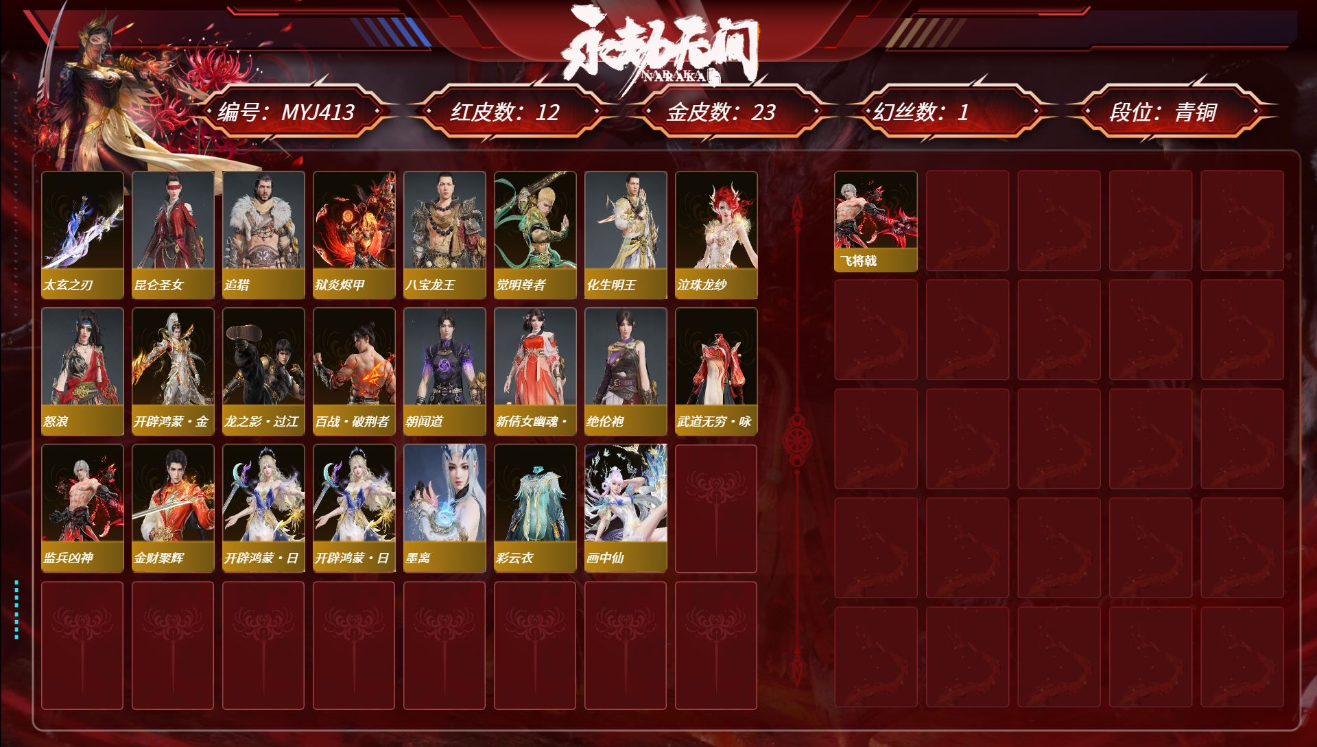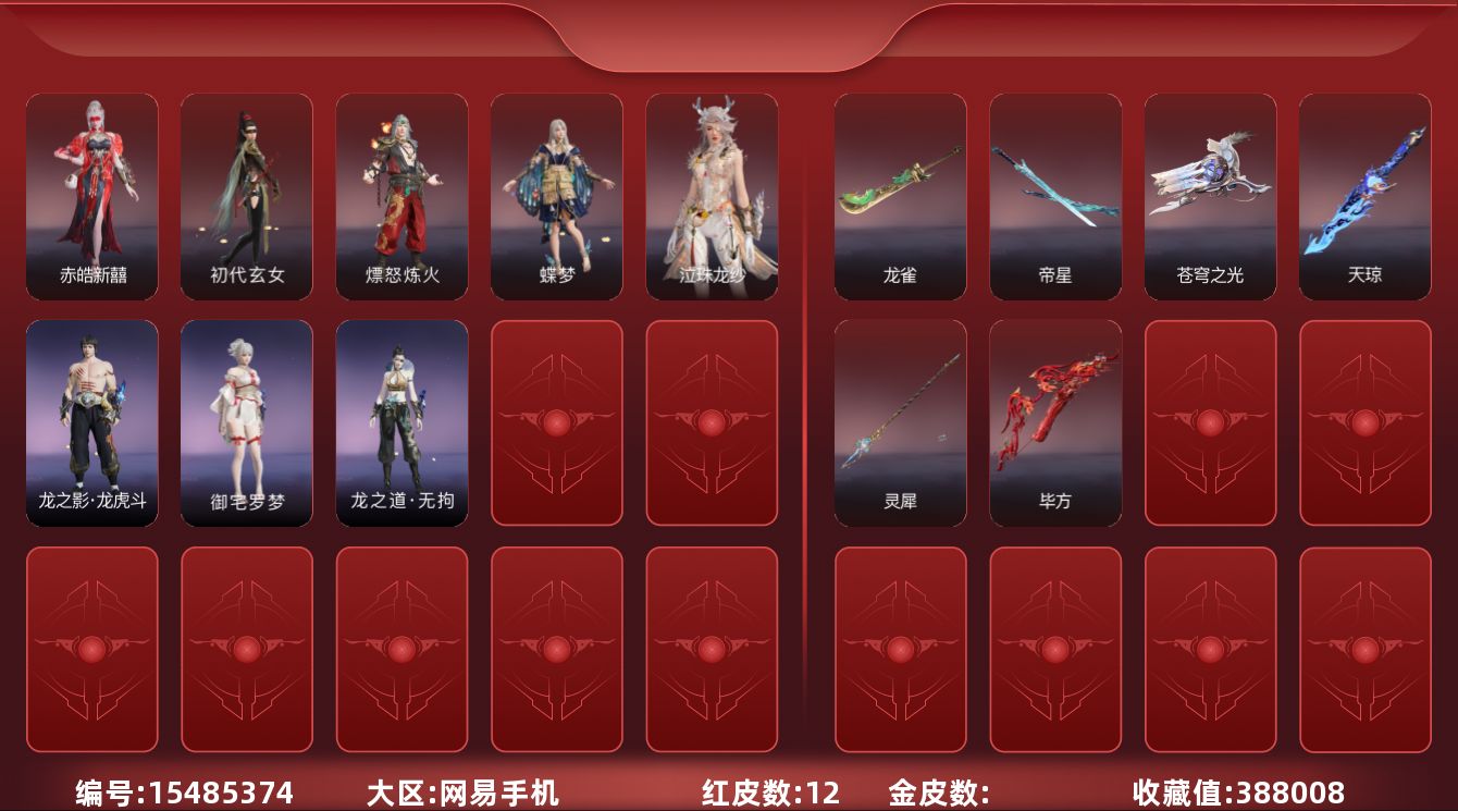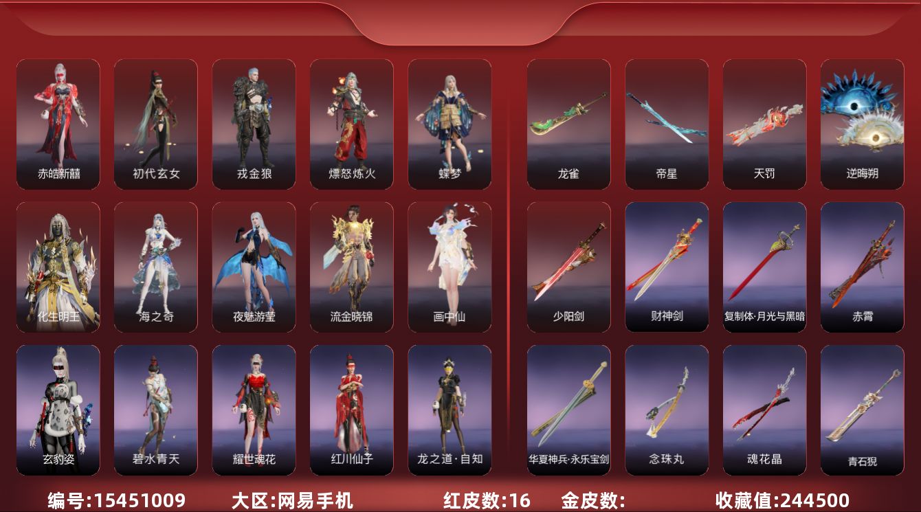 [15451009]yjj1261/2.7换绑/等级411/s19三人蚀月4/16红322金收藏值244500/赤皓新囍/初代玄女/化生明王/戎金狼/熛怒炼火/蝶梦/海之奇/夜魅游莹/流金晓锦/画中仙/少阳剑/帝星/龙雀/逆晦朔/天罚/墨离/【技能奥义】/荆魂/勾玉/御祥云/珥冰 宁红夜:/赤皓新囍/初代玄女/耀世魂花/昆仑之主/倒反阴阳炽羽/自知/玄豹姿/红川仙子/碧水青天/缥缈发 沈妙:/咏春 天海:/化生明王/警长制服/觉明尊者/白熊/觉之一念/若水尊者/裟伽龙王/八宝龙王/持威明王/缘觉发 殷紫萍:/福寿仙/萍之缘 特木尔:/戎金狼/唐三/友情岁月/苍狼之主/沙狼之怒/苍狼宗主发/海神发 季沧海:/熛怒炼火/瑞火麟/龙心炽焰/立天地/精武魂/江海沧澜/游四海/江海发 胡桃:/蝶梦/天钿女命/清雅少女 妖刀姬:/暗夜利刃/赤影妖刀姬 崔三娘:/海之奇/汐泪/镇海龙/浩渺发/安澜发/激浪发 岳山:/金戈止/杨戬/骁骑/过江龙/觅封侯发 无尘:/未济袍/若谷/羽客发 顾清寒:/金襦玉衫/禄运玉霄/赤丹朱湛/绯霜发 武田信中:/花之倾奇 迦南:/蕾雅/神鹰之女/璨银魔枭/夕鹰发 胡为:/福瑞天泽 季莹莹:/夜魅游莹/炽火照夜 玉玲珑:/丽娘/广目天王/惊雀发 哈迪:/衔环/秀逸发 魏轻:/执金 刘炼:/流金晓锦 张起灵:/云间影 席拉:/雪铃绮歌/蜜语发 蓝梦:/画中仙 万钧:/雷行猎手/迅猛发/炽羽尘光发 拳刃:/镇恶 长剑:/少阳剑/月光与黑暗/永乐/财神剑/赤霄 太刀:/切影/念珠丸/魂花晶 横刀:/帝星/雷厉 阔刀:/龙雀/妖刀/斩银河/暮影/青石猊/龙蟠 斩马刀:/护云狩 呛:/凌云志/击苍穹/建木/白虹/镰鼬剃/长虹 棍:/学宫之杖/打狗棒/糖果棍 匕首:/仙舞/判官笔/寻魂/桡尺刀/残霄 扇:/逆晦朔/耀夜流华/腾云歌/舞扇/青峰叠扇 链剑:/醉花风 双截棍:/傲骨/嘶风/地火涌/法持/精武/衔谷/镇魔杵 双刀:/双蝶/天之刑/天威/无救/破重云 双戟:/光影裁决 万仞轮:/穷奇 飞刀:/胧月魂 连弩:/乱风云/朱雀/穿云燕/镇海 鸟铳:/出渊蛟/戏祥云/石中火/金蝎/雪夜巡礼 火炮:/天罚/兔华笼/吞海鲛/墨不归/钻山/雪国礼炮/龙啸/龙息 五眼铳:/丹鹤/夜观灯/梦魇/炉中火 弓箭:/乌木弓/春水/月虹弦角/瞑蛇引/逆逢/雅矢/青花 一窝蜂:/莲心剑雨飞索:/毒刺/飞