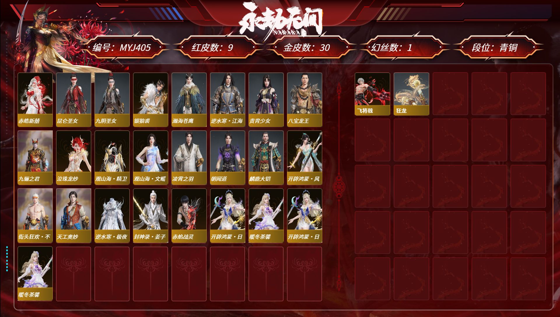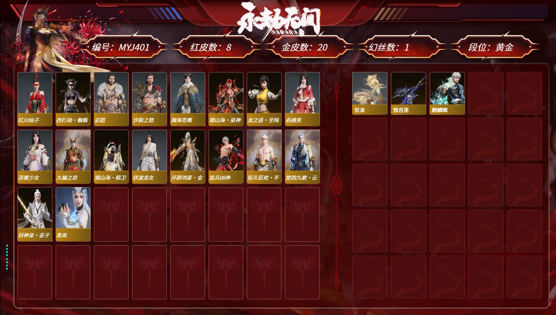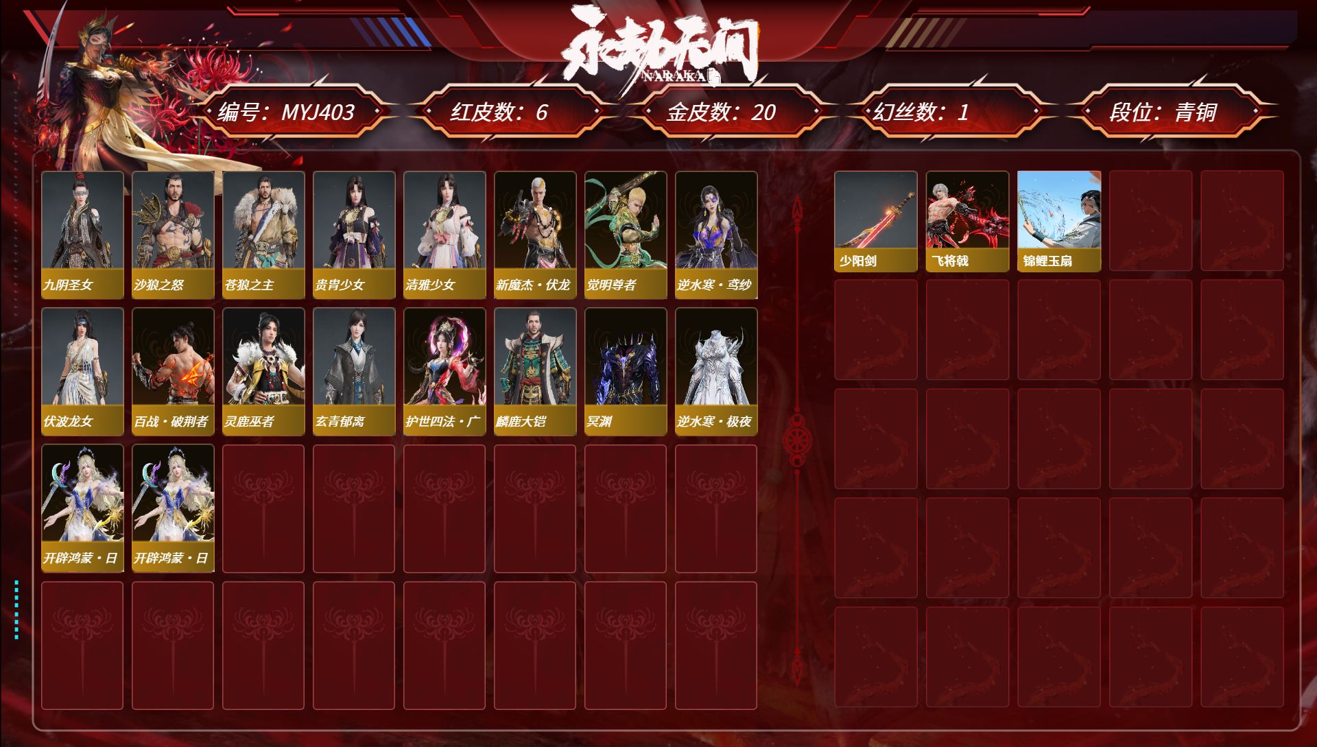 [15450631]yjj1260/365换绑/等级365/s19三人蚀月4/18红469金收藏值303308/赤皓新囍/初代玄女/星辉魔纱/化生明王/戎金狼/熛怒炼火/沙漠香风/流金晓锦/少阳剑/灵狐幻刃/帝星/比羿/龙雀/悍虎斩/飞将戟/狂龙/苍穹之光/墨离/【技能奥义】/雪霜姿/珥冰/御祥云/勾玉 宁红夜:/赤皓新囍/初代玄女/夜华朝/山川润/昆仑之主/倒反阴阳炽羽/蜘蛛精/自知/红川仙子/碧水青天/泠川发/月白发/簪缨发/落霜发/双马尾女 沈妙:/星辉魔纱/秋藏桂/楚韵九歌山鬼/悠竹萌客/涂鸦少女/娇憨发/双马尾女 天海:/化生明王/白熊/九骊之君/八宝龙王 殷紫萍:/春神句芒/风雨谐/鹅黄纱梦/福寿仙/瑶光沐月/伏苓发/暖绒发/双马尾女 特木尔:/戎金狼/多闻天王/红蓝狂想/唐三/沙狼之怒/追猎/海神发 季沧海:/熛怒炼火/鹧鸪天/不良人李星云/康复之星/巨阙/精武魂/江海发/烈火发/不如吾发/含锋发 胡桃:/紫藤神子/清雅少女/贵胄少女/月丹发/归宁发/双马尾女 妖刀姬:/暗夜利刃/赤影妖刀姬 崔三娘:/赤雾烟霞/暗沼摩罗/无拘/伏波龙女/弄潮发/冷傲发/双马尾女 岳山:/金戈止/铁面/汉光/过江龙/玄鳞发 无尘:/雨宫莲joker/申公豹/柳生/黄庭道/joker发型 顾清寒:/凤凰装/寒芷/a2/禄运玉霄/仲夏霜华/赤丹朱湛/玄青郁离/霜天发/灵儿发/绯霜发/双马尾女 武田信中:/祸津素盏/麟鹿大铠/枫狩/花之倾奇 迦南:/沙漠香风/玉叶景/夜吻/琳琅发/双马尾女 胡为:/蛤蟆头领/杜虎符/福瑞天泽 季莹莹:/冬无归/持国天王/干将莫邪/断链/缱绻发/幽焰发/双马尾女 玉玲珑:/赤阳天狐/春不敛/日影花阴/惊雀发/双马尾女 哈迪:/天工奥妙/卷王/夜绸袍/秀逸发 魏轻:/念奴娇/寿竹云春/傲采发/双马尾女 刘炼:/流金晓锦/虹猫 张起灵:/山漠狞影/赤焰战灵 席拉:/天虹咏/雪铃绮歌/蜜语发/双马尾女 蓝梦:/如梦令/沉醉发/双马尾女 万钧:/林七夜/雷行猎手/【挑染】雷霆客发/迅猛发/炽羽尘光发 拳刃:/毛乎乎/醒狮 长剑:/少阳剑/不良人龙泉剑/冰魄剑/冷香/月光与黑暗/隐锋/2674原型 太刀:/灵狐幻刃/切影/拂雪绒/残阳/毅魂守/炫日/鎏金勺/雷赐 横刀:/帝星/比羿/尽春锋/烛泪/白鹿/雷厉 阔刀:/龙雀/听涛_/塑梦钥匙/斩银河/朔方之刃/破天/青石猊 斩