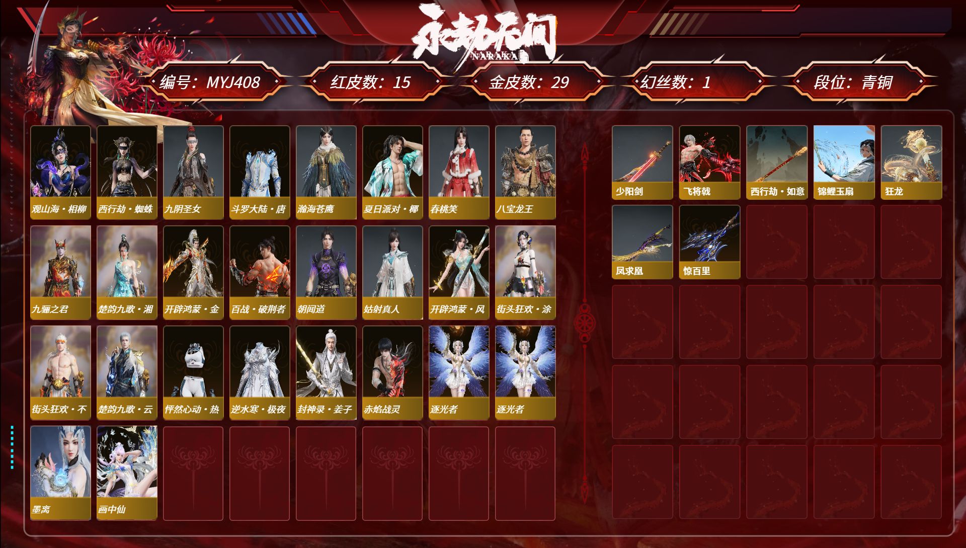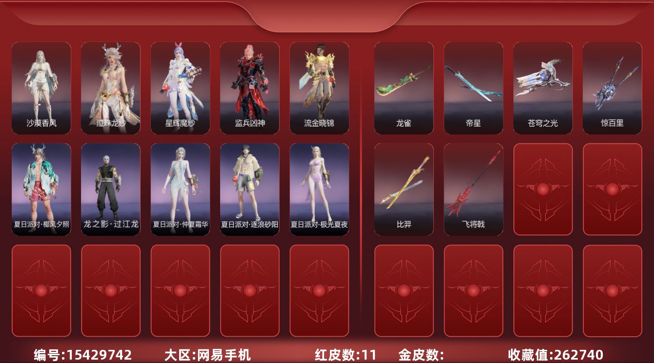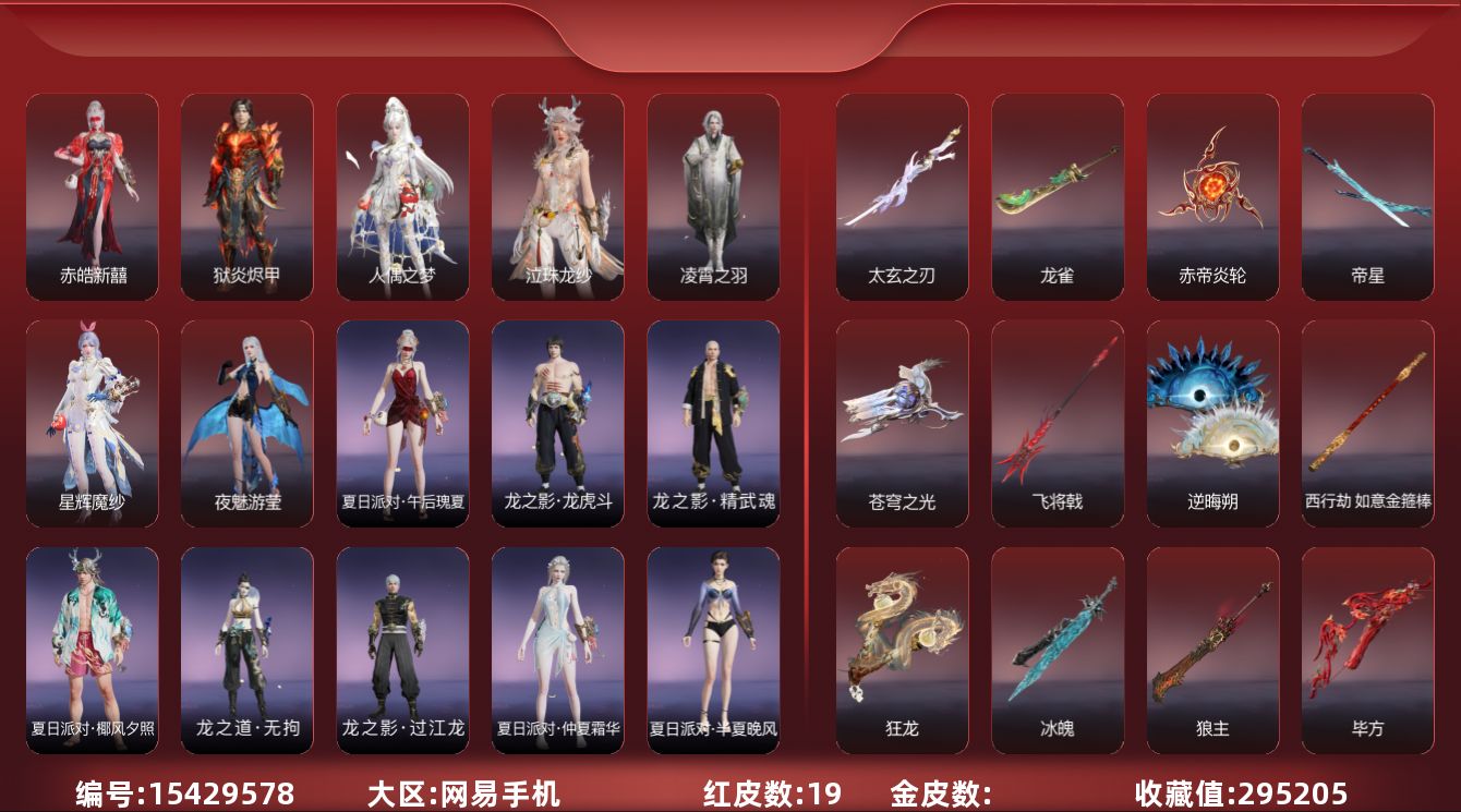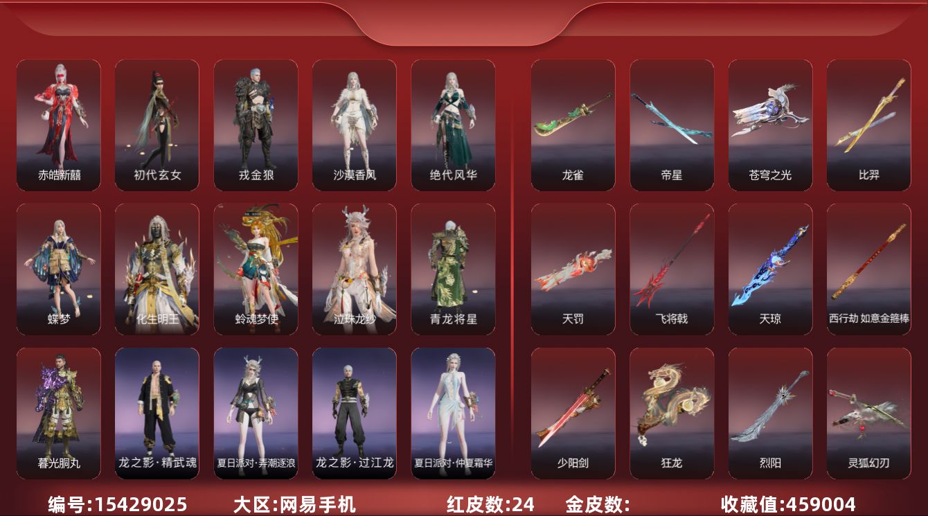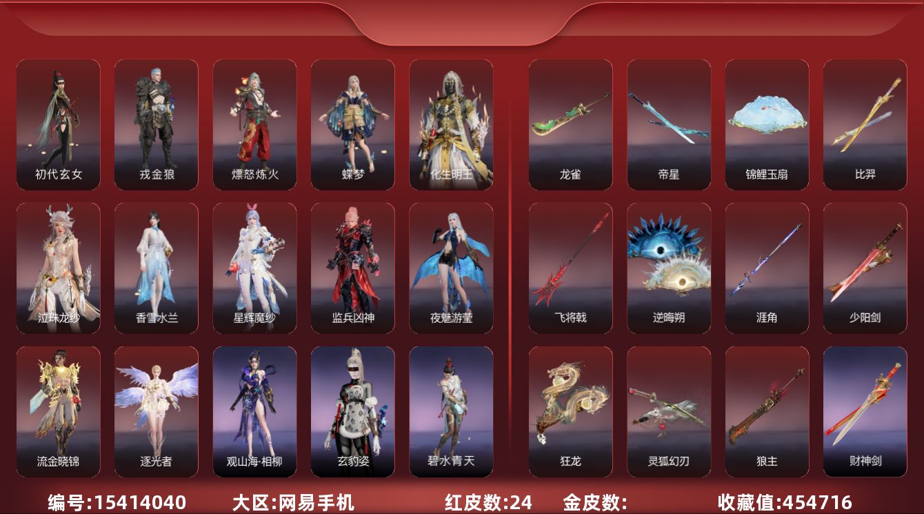 [15414040]yjj1250/2.7换绑/等级517/s19三人黄金2/24红736金收藏值454716/初代玄女/星辉魔纱/化生明王/戎金狼/熛怒炼火/蝶梦/泣珠龙纱/香雪水兰/监兵凶神/夜魅游莹/流金晓锦/逐光者/少阳剑/灵狐幻刃/帝星/比羿/狼主/龙雀/飞将戟/涯角/逆晦朔/锦鲤玉扇/狂龙/墨离【技能奥义】/凶虎/应龙号/珥冰/揽九天/石龛造像 宁红夜:/初代玄女/夜华朝/相柳/山川润/昆仑之主/耀世魂花/玄豹姿/紫金玉女/碧水青天/九阴圣女/缥缈发/簪缨发/云霞发/双马尾女 沈妙:/星辉魔纱/絮云衣/悠竹萌客/紫衣仙子/腓腓/绮云衫/百灵发/娇憨发/韶光发/双马尾女 天海:/化生明王/觉之一念/少林/觉明尊者/白熊/若水尊者/八宝龙王/自在发/双马尾男 殷紫萍:/风雨谐/鹅黄纱梦/萍之缘/福寿仙/云雪染/沐昭/流纨裙/瑶光沐月/春雪/紫芙发/子菀发/伏苓发/暖绒发/双马尾女 特木尔:/戎金狼/唐三/噬月天狼/追猎/海神发/双马尾男 季沧海:/熛怒炼火/杰洛特/鹧鸪天/巨阙/江海沧澜/龙心炽焰/瑞火麟/游四海/立天地/腾烟发/江海发/白狼发/含锋发/双马尾男 胡桃:/蝶梦/辉烨少女/山吹茶/春桃笑/天钿女命/阴阳姬/至纯/御宅罗梦/清雅少女/月丹发/月下香发/双马尾女 妖刀姬:/御神之刃 崔三娘:/泣珠龙纱/巨鲸客/暗沼摩罗/阿娜希塔/蛰龙吟/赤雾烟霞/掌珠仙子/碎浪发/安澜发/浩渺发/激浪发/鲸海发/冷傲发/双马尾女 岳山:/常胜袍/金戈止/尼尔/铁面/争斗洪流/守誓者/过江龙/骁骑/觅封侯发/玄鳞发/无畏发/双马尾男 无尘:/幽篁山鬼/黄庭道/一品仙君/司天命/申公豹/朝闻道/灵鹿巫者/若谷/金羽客/羽客发/九梁发/竹律发/双马尾男 顾清寒:/香雪水兰/藏雨阁主/寒烟素/龙吉公主/寒英素雪/冰凌发/霜天发/绯霜发/红鸾星发/双马尾女 武田信中:/祸津素盏/麟鹿大铠/击浪/苍雷丸/阎摩发/双马尾男 迦南:/火罗圣女/观山海青鸟/凛冬/玉叶景/神鹰之女/惊云羽/璨银魔枭/浣烟纱/花无痕/夕鹰发/玉儿发/青鸾发/琳琅发/双马尾女 胡为:/监兵凶神/斑斓衣/不败擂主/蛤蟆头领/福瑞天泽/行空裘/悟空/秋神蓐收/大圣发/天刑发/双马尾男 季莹莹:/夜魅游莹/干将莫邪/哪吒/冬无归/冬神玄冥/冥泉发/缱绻发/流萤发/幽焰发/双马尾女 玉玲珑:/丽娘/春不敛/妲己/日影花阴/广目天王