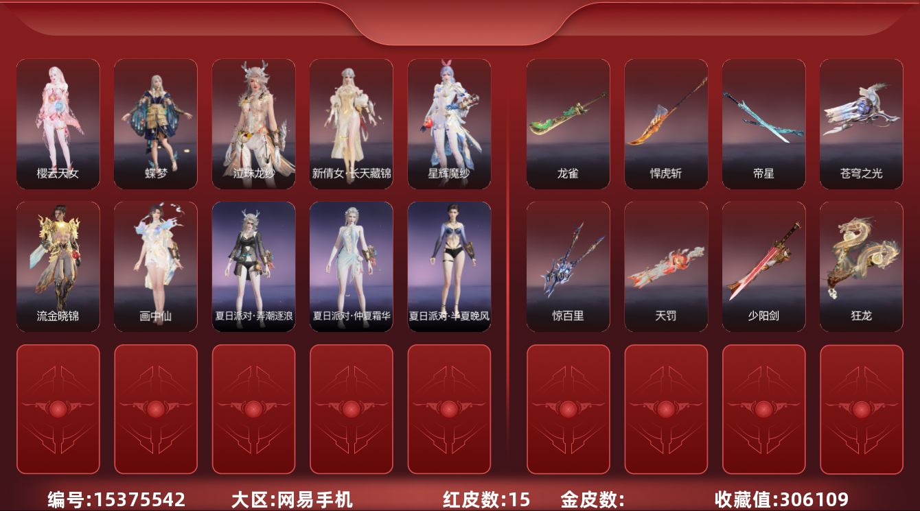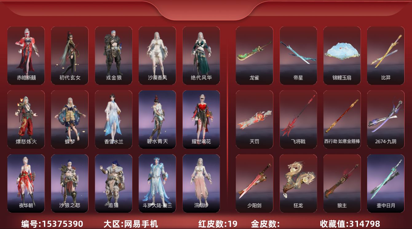 [15380834]yjj1228/2.6换绑/等级450/s19三人陨星5/20红561金收藏值346850//初代玄女/星辉魔纱/朱雀星衣/化生明王/戎金狼/熛怒炼火/人偶之梦/绝代风华/沙漠香风/监兵凶神/通天狐袄/化道者/少阳剑/帝星/狼主/龙雀/天琼/逆晦朔/狂龙/苍穹之光/【技能奥义】/勾玉/宝葫芦/凶虎/揽九天/荆魂/珥冰/御祥云/剪纸彩刀 宁红夜:/初代玄女/相柳/倒反阴阳炽羽/耀世魂花/紫金玉女/泠川发 沈妙:/星辉魔纱/朱雀星衣/秋藏桂/悠竹萌客/腓腓/奥村春noir/娇憨发/noir发型 天海:/化生明王/九骊之君/若水尊者 殷紫萍:/鹅黄纱梦/福寿仙/萍之缘/白芷发/紫芙发/暖绒发 特木尔:/戎金狼/多闻天王/友情岁月/银狼裘/唐三/龙虎斗/苍狼宗主发/海神发 季沧海:/熛怒炼火/杰洛特/鹧鸪天/夏神祝融/精武魂/孽炎祸斗/游四海/腾烟发/江海发/烈火发/白狼发 胡桃:/小可/御宅罗梦/贵胄少女/春桃笑/清雅少女/樱舞发 妖刀姬:/人偶之梦/灼舞桃节/青枝瓷 崔三娘:/文鳐/暗沼摩罗/汐泪/阿娜希塔/精卫/巨鲸客/弄潮逐浪/鲸海发/冷傲发 岳山:/常胜袍/铁面/尼尔/过江龙/玄鳞发 无尘:/司天命/申公豹/柳生/若谷/灵鹿巫者 顾清寒:/藏雨阁主/龙吉公主/禄运玉霄/金襦玉衫/赤丹朱湛/寒英素雪/冰凌发/绯霜发/红鸾星发 武田信中:/祸津素盏/苍雷丸/阎摩发 迦南:/绝代风华/沙漠香风/蕾雅/凛冬/观山海青鸟/不知火舞/浣烟纱/飞天/花无痕/翔鸾发/朝颜发/女忍发/青鸾发 胡为:/监兵凶神/蛤蟆头领/行空裘/福瑞天泽/秋神蓐收/桀骜发/天刑发 季莹莹:/冬无归/持国天王/冬神玄冥/冥泉发/流萤发/幽焰发 玉玲珑:/通天狐袄/春不敛/妲己/黄昏巫主/古溪发/笼烟芍药发/惊雀发 哈迪:/化道者/季中赛2025漠海/沙海之鸠/秀逸发/珀光发 魏轻:/极夜天曦/念奴娇/傲采发 刘炼:/姜子牙/仙风发 张起灵:/山漠狞影/赤焰战灵/云间影 席拉:/暧冬茶馨/雪铃绮歌/蜜语发 蓝梦:/如梦令/牵云霞发/沉醉发 万钧:/惊世袍 拳刃:/天狐/毛乎乎/镇恶 长剑:/少阳剑/亢龙/含光承影/壶中日月/寂兮/月光与黑暗/湖女之剑/琴心/监星尺/福禄双至/紫金宝剑/降龙木/2674超越型 太刀:/切影/残阳/金玉一文字/雷赐/魂花晶/黑绳 横刀:/帝星/尽春锋/无限/白鹿/纳福/雷厉