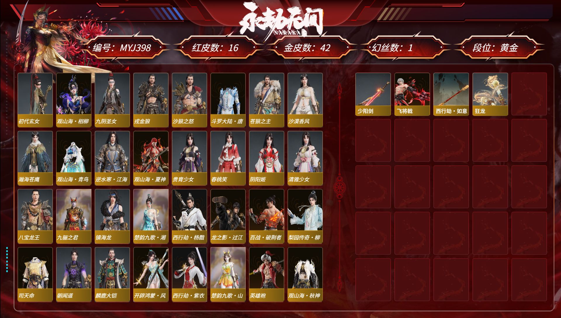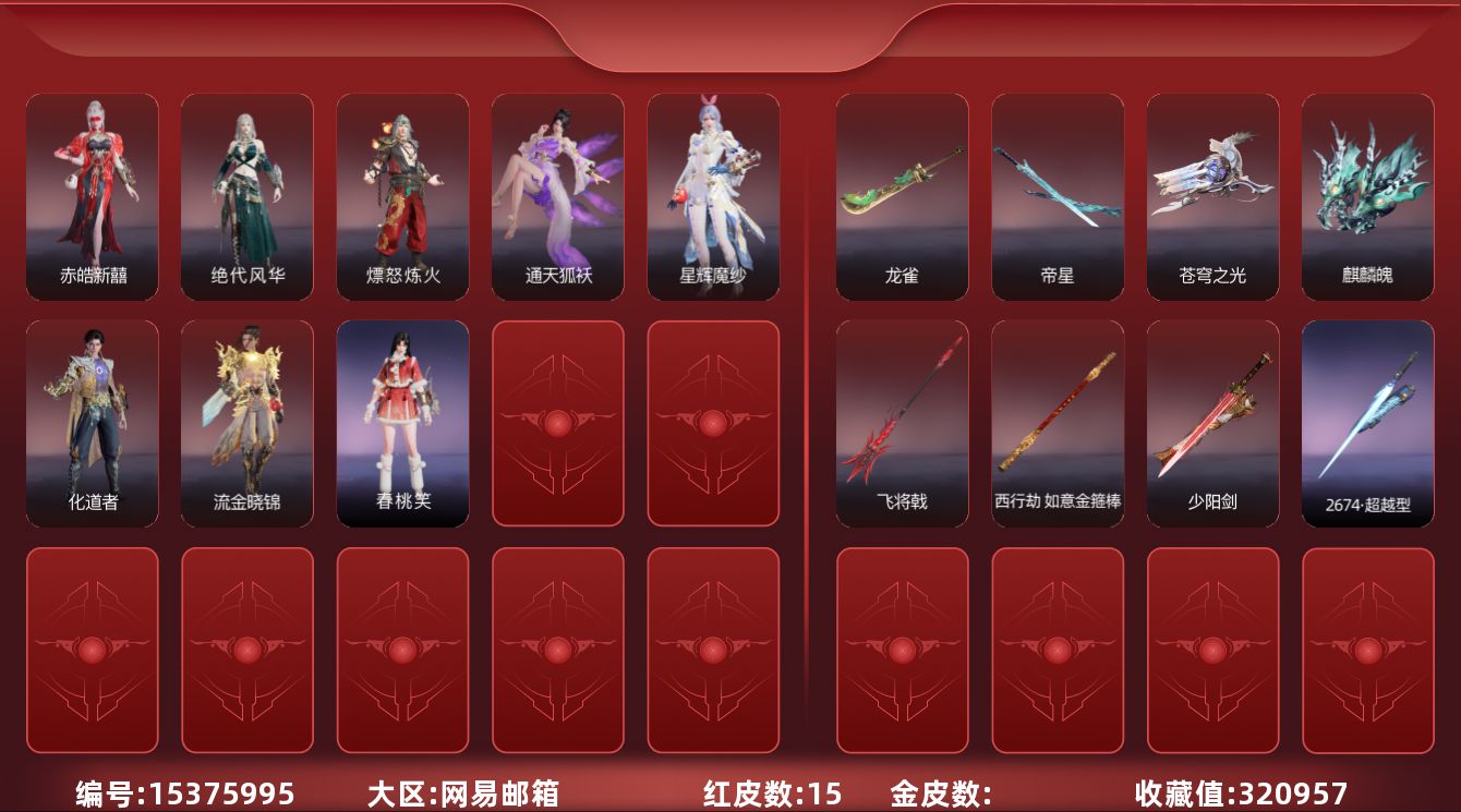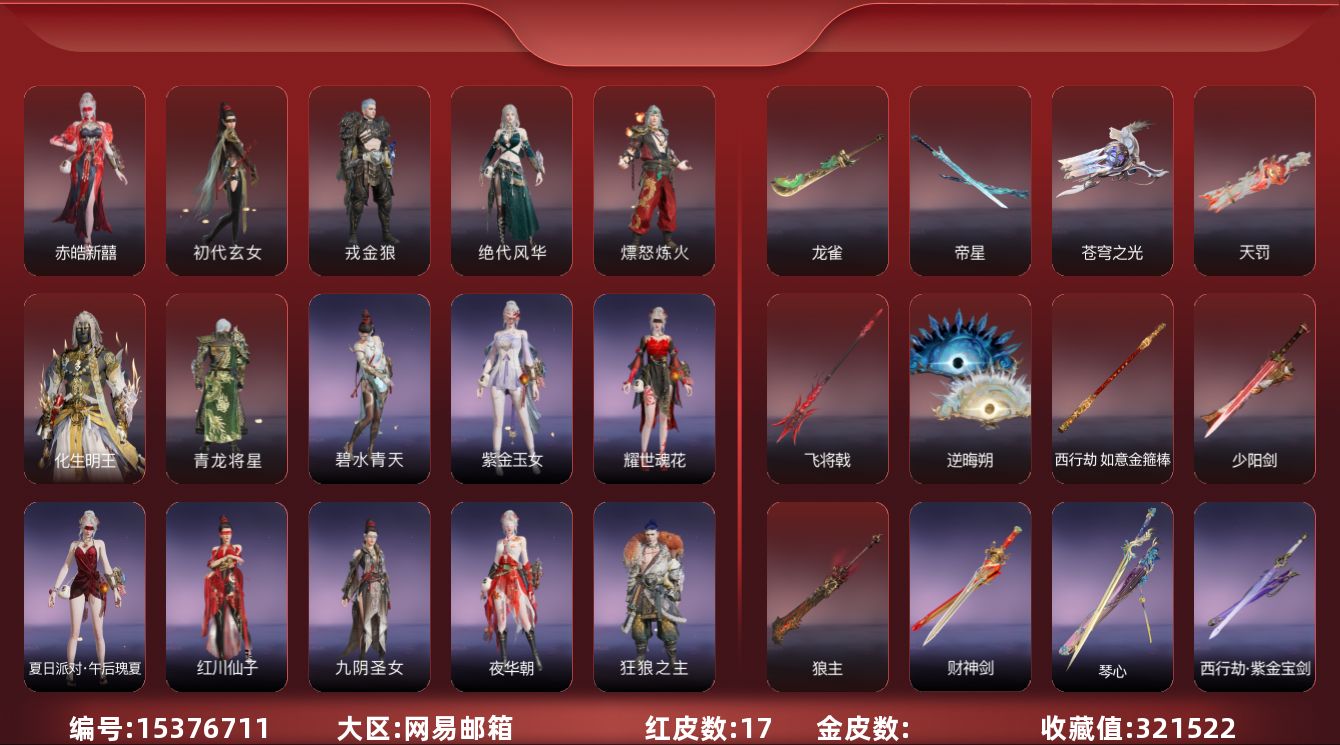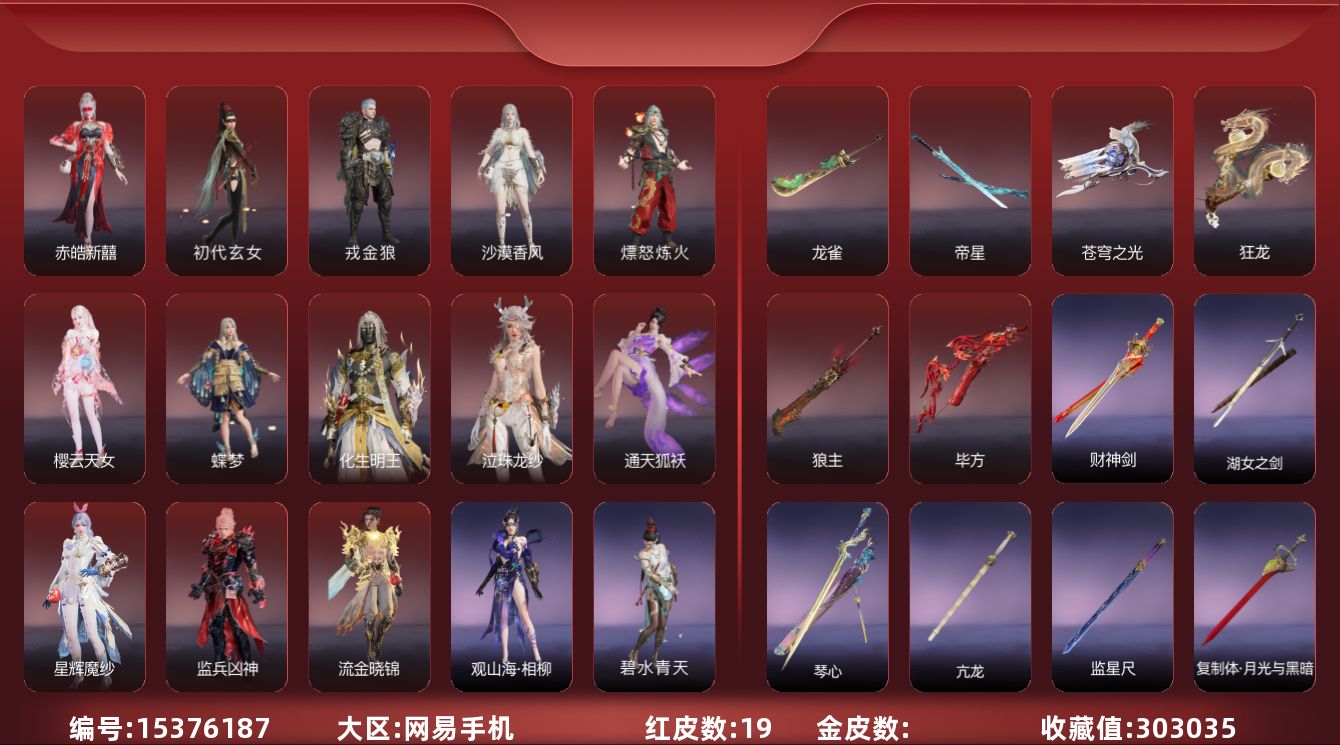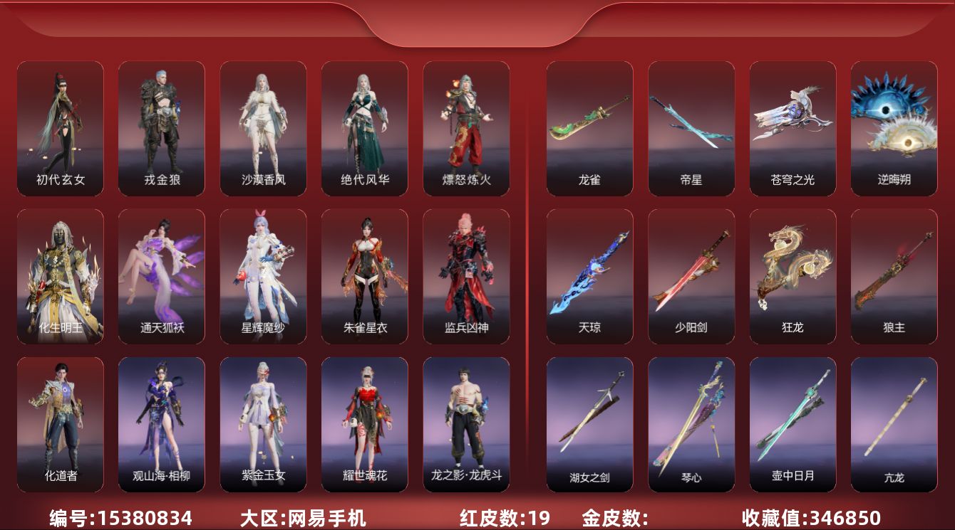 [15380834]yjj1228/2.6换绑/等级450/s19三人陨星5/20红561金收藏值346850//初代玄女/星辉魔纱/朱雀星衣/化生明王/戎金狼/熛怒炼火/人偶之梦/绝代风华/沙漠香风/监兵凶神/通天狐袄/化道者/少阳剑/帝星/狼主/龙雀/天琼/逆晦朔/狂龙/苍穹之光/【技能奥义】/勾玉/宝葫芦/凶虎/揽九天/荆魂/珥冰/御祥云/剪纸彩刀 宁红夜:/初代玄女/相柳/倒反阴阳炽羽/耀世魂花/紫金玉女/泠川发 沈妙:/星辉魔纱/朱雀星衣/秋藏桂/悠竹萌客/腓腓/奥村春noir/娇憨发/noir发型 天海:/化生明王/九骊之君/若水尊者 殷紫萍:/鹅黄纱梦/福寿仙/萍之缘/白芷发/紫芙发/暖绒发 特木尔:/戎金狼/多闻天王/友情岁月/银狼裘/唐三/龙虎斗/苍狼宗主发/海神发 季沧海:/熛怒炼火/杰洛特/鹧鸪天/夏神祝融/精武魂/孽炎祸斗/游四海/腾烟发/江海发/烈火发/白狼发 胡桃:/小可/御宅罗梦/贵胄少女/春桃笑/清雅少女/樱舞发 妖刀姬:/人偶之梦/灼舞桃节/青枝瓷 崔三娘:/文鳐/暗沼摩罗/汐泪/阿娜希塔/精卫/巨鲸客/弄潮逐浪/鲸海发/冷傲发 岳山:/常胜袍/铁面/尼尔/过江龙/玄鳞发 无尘:/司天命/申公豹/柳生/若谷/灵鹿巫者 顾清寒:/藏雨阁主/龙吉公主/禄运玉霄/金襦玉衫/赤丹朱湛/寒英素雪/冰凌发/绯霜发/红鸾星发 武田信中:/祸津素盏/苍雷丸/阎摩发 迦南:/绝代风华/沙漠香风/蕾雅/凛冬/观山海青鸟/不知火舞/浣烟纱/飞天/花无痕/翔鸾发/朝颜发/女忍发/青鸾发 胡为:/监兵凶神/蛤蟆头领/行空裘/福瑞天泽/秋神蓐收/桀骜发/天刑发 季莹莹:/冬无归/持国天王/冬神玄冥/冥泉发/流萤发/幽焰发 玉玲珑:/通天狐袄/春不敛/妲己/黄昏巫主/古溪发/笼烟芍药发/惊雀发 哈迪:/化道者/季中赛2025漠海/沙海之鸠/秀逸发/珀光发 魏轻:/极夜天曦/念奴娇/傲采发 刘炼:/姜子牙/仙风发 张起灵:/山漠狞影/赤焰战灵/云间影 席拉:/暧冬茶馨/雪铃绮歌/蜜语发 蓝梦:/如梦令/牵云霞发/沉醉发 万钧:/惊世袍 拳刃:/天狐/毛乎乎/镇恶 长剑:/少阳剑/亢龙/含光承影/壶中日月/寂兮/月光与黑暗/湖女之剑/琴心/监星尺/福禄双至/紫金宝剑/降龙木/2674超越型 太刀:/切影/残阳/金玉一文字/雷赐/魂花晶/黑绳 横刀:/帝星/尽春锋/无限/白鹿/纳福/雷厉