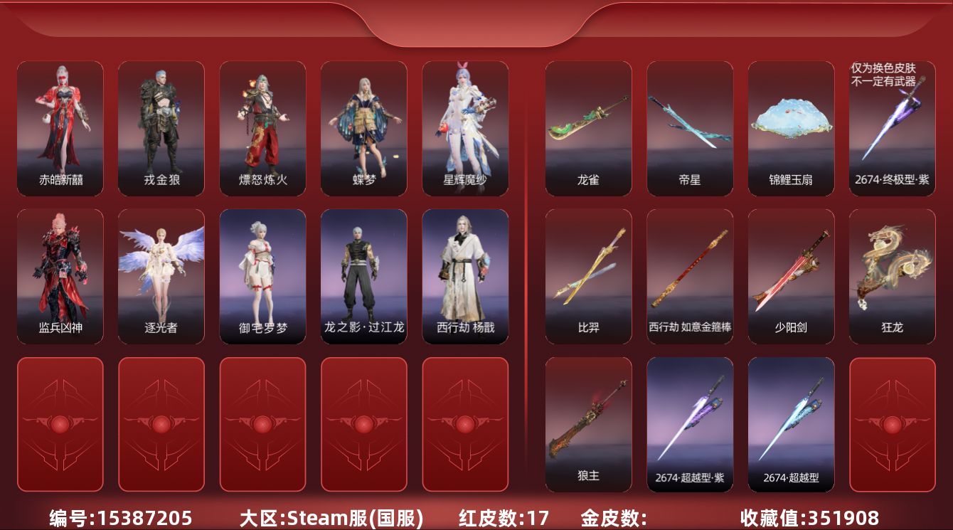 [15376711]yjj1224/2.6换绑/等级551/s19三人蚀月4/18红528金收藏值321522/赤皓新囍/初代玄女/化生明王/戎金狼/熛怒炼火/墨离/青龙将星/绝代风华/天罚/苍穹之光/少阳剑/帝星/龙雀/狼主/飞将戟/西行劫·如意金箍棒/逆晦朔/狂龙倒反阴阳·炽羽/夜华朝/耀世魂花/夏日派对·午后瑰夏/紫金玉女/红川仙子/碧水青天/九阴圣女/绿野守护·悠竹萌客/楚韵九歌·山鬼/街头狂欢·涂鸦少女/绮云衫/冬日绮韵·白熊/九骊之君/夏日派对·夏海伏浪/武道无穷·少林/枫行者/八宝龙王/九州遗珍·福寿仙/白族·云雪染/智绘·萍之缘/新倩女幽魂·瑶光沐月/新倩女幽魂·流纨裙/怪诞狂想·友情岁月/护世四法·多闻天王/斗罗大陆·唐三/银狼裘/噬月天狼/苍狼之主/康复之星/巨阙/夏日派对·椰风夕照/逆水寒·江海沧澜/游四海/巅峰极速·小可/春日序曲·晨风/承云兰寿/阴阳姬/清雅少女/决战平安京·恋念私语/决战平安京·御神之刃/妖刀姬/绿野守护·暗沼摩罗/阿娜希塔/伏波龙女/怒浪/西行劫·杨戬/常胜袍/百战·破荆者/弘毅袍/龙之影·过江龙/封神录·申公豹/司天命/朝闻道/若谷/封神录·龙吉公主/夏日派对·仲夏霜华/寒英素雪/祸津素盏/麟鹿大铠/苍雷丸/倒反阴阳·凛冬/千秋匠心·玉叶景/长歌诗韵·胡旋女/观山海·青鸟/龙门·飞天/惊云羽/瀚海苍鹰/葫芦兄弟·蛤蟆头领/街头狂欢·不败擂主/观山海·秋神蓐收/干将莫邪/护世四法·持国天王/观山海·冬神玄冥/春不敛/封神录·妲己/护世四法·广目天王/日影花阴/黄昏巫主/夜绸袍/寿竹云春/代号·玉脍/赤诚心/封神录·姜子牙/云间影/绿野守护·山漠狞影/暖冬茶馨/斩神·林七夜/发型金色皮肤:簪缨发/韶光发/绿野守护·娇憨发/p5r·noir发型发/缘觉发/子菀发/伏苓发/(挑染)暮落发/九州遗珍·春桃发/苍狼宗主发/斗罗大陆·海神发/逆水寒·江海发/巫师3·白狼发/月丹发/(挑染)樱舞发/碎浪发/(挑染)填海发/绿野守护·冷傲发/立靖仇驗发/(挑染)清威发/(挑染)代号·冷萃发/冰凌发/灵儿发/封神录·红鸾星发/阎摩发/翔鸾发/(挑染)鸿影发/观山海·青鸾发/千秋匠心·琳琅发/观山海·天刑发/(挑染)宵烛发/观山海·冥泉发/流萤发/缱绻发/幽焰发/古溪发/封神录·笼烟芍药发/惊雀发/(挑染)狮鬃发/逆水寒·极夜发/(挑染)风吹雪发/封神录·仙风