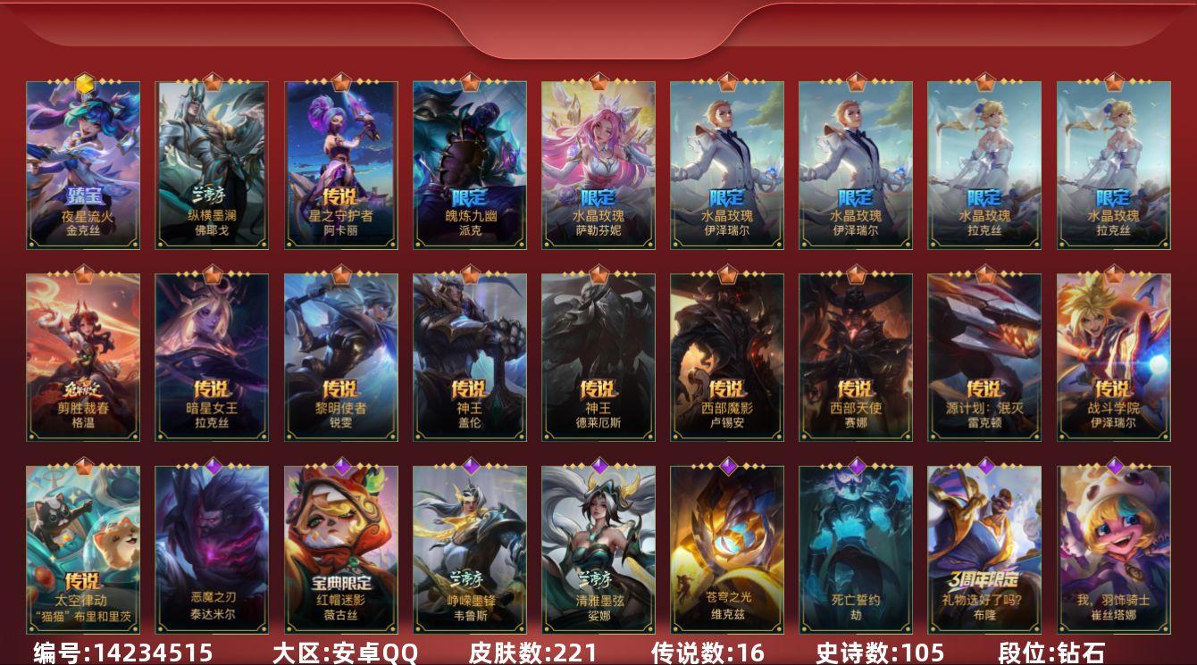 1神话 3限定 16传说 105史诗 221皮肤 可二次 可修改实名 【段位】:钻石 【神话皮】:夜星流火 金克丝 【限定皮肤】:水晶玫瑰拉克丝水晶玫瑰伊泽瑞尔水晶玫瑰琴女 【传说皮】:星之守护者 阿卡丽水晶玫瑰萨勒芬妮魄炼九幽 派克纵横墨澜 佛耶戈西部魔影卢锡安水晶玫瑰ez水晶玫