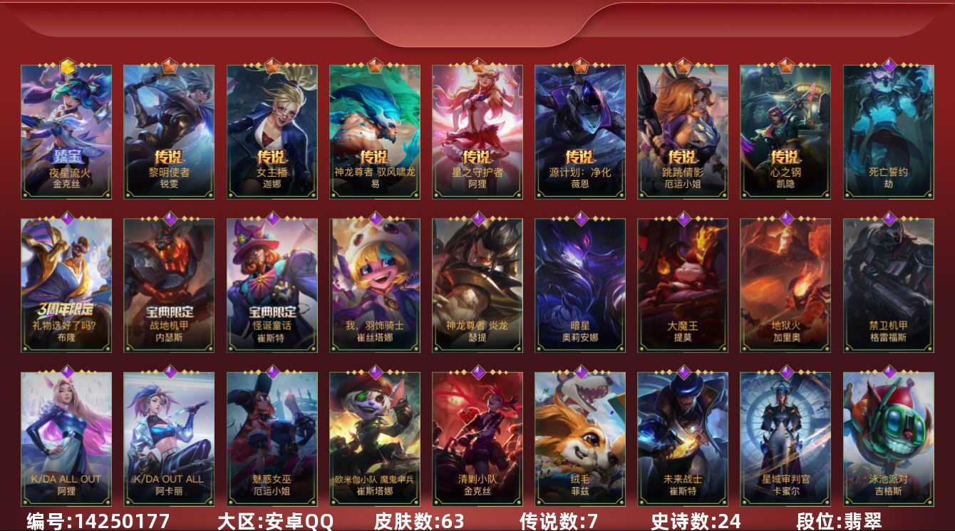 [14266283]1限定 11传说 24史诗 77皮肤 可二次 可修改实名 【段位】:翡翠 【限定皮肤】:赵云子龙 【传说皮】:神龙尊者 圣龙 李青西部魔影卢锡安天煞劫神王诺手神拳盲僧律政大亨k/da allout萨勒芬妮黑夜使者亚索福牛守护者女呛光明哨兵格雷福斯战斗学院ez