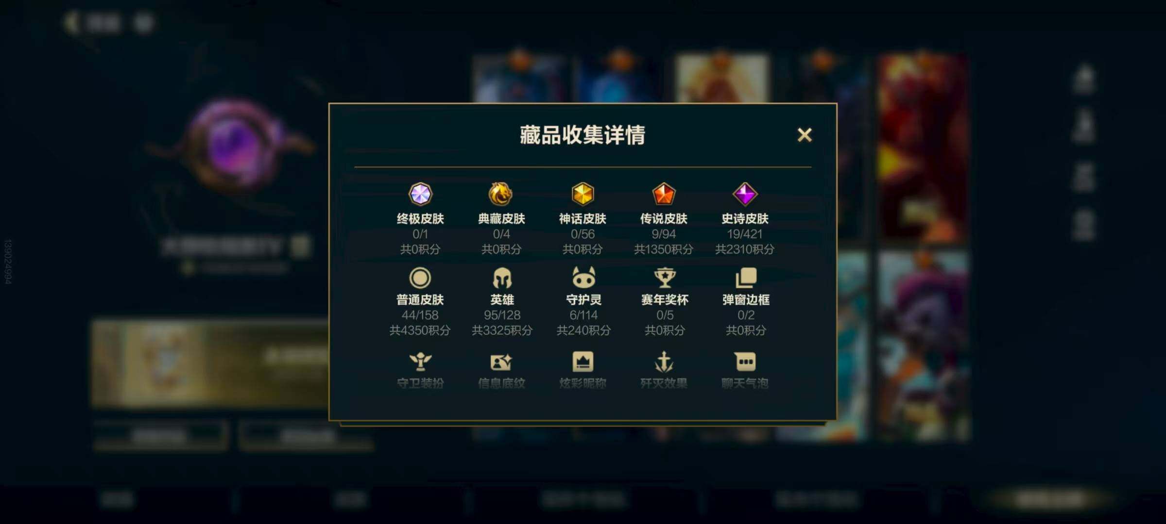 [14224699]42英雄-40皮肤-0典藏-0神话-6传说-10史诗 【传说皮肤】:暗星尊 烬,斗魂无双 亚索,灵魂莲华 瑟提,黎明使者 永恩,驯龙炮手 崔丝塔娜,源计划:林 易 【史诗皮肤】:暗星 墨菲特,霸天剑魔 亚托克斯,电玩女神 阿狸,地狱火 加里奥,魔女 卡蜜尔,清剿小队 潘森,驯龙女巫 璐璐,源计划:裁决 蔚,泳池派对 格雷福斯,宇航员 诺提勒斯 【赛季皮肤】:s10王牌上将,s12龙冕先锋,s13龙冕御盾,s15龙冕异士,s18冠翎巨神像 【其他皮肤】:暗黑女武神 黛安娜,暗影 易,冰霜亚龙 希瓦娜,冲击之刃 劫,单身贵族 内瑟斯,鳄霸 雷克顿,光明之锤 杰斯,海上霸主 盖伦,龙冕先锋 赵信,猎龙勇士 布隆,龙冕御盾 布隆,擂台皇帝 布里茨,秘密特工 赵信,末路教父 格雷福斯,哞利斯塔 阿利斯塔,女警官 蔚,热血班长 德莱厄斯,铁血狙击手 凯特琳,王牌上将 嘉文四世,西部牛仔 亚索,腥红之月 鬼武者 慎,龙冕异士 烬,冠翎巨神像 加里奥,五连摇滚鼓手 奥拉夫