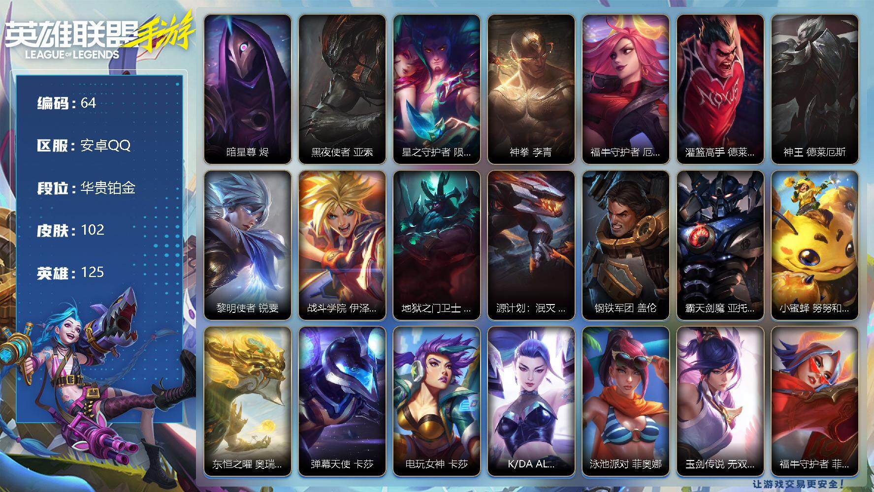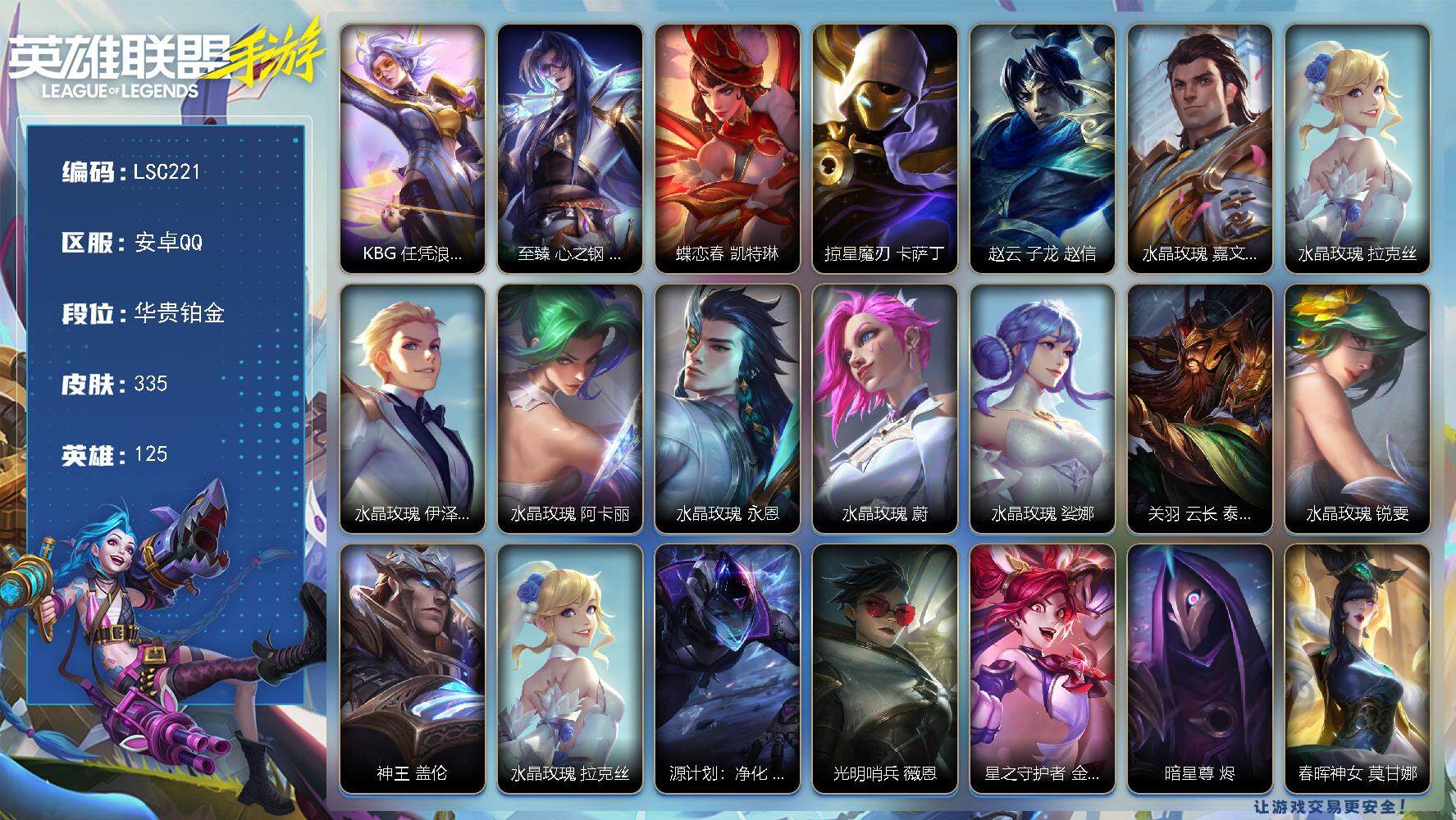 【lsc221】125英雄/335皮肤/3神话/38传说/176史诗/华贵铂金/kbg 任凭浪起 破浪 菲奥娜/至臻 心之钢 永恩/蝶恋春 凯特琳/掠星魔刃 卡萨丁/赵云 子龙 赵信/水晶玫瑰 嘉文四世/水晶玫瑰 拉克丝/水晶玫瑰 伊泽瑞尔/水晶玫瑰 阿卡丽/水晶玫瑰 永恩/水晶玫瑰 蔚/水晶玫瑰 娑娜/关羽 云长 泰达米尔/水晶玫瑰 锐雯/神王 盖伦/源计划:净化 薇恩/光明哨兵 薇恩/星之守护者 金克丝/暗星尊 烬/春晖神女 莫甘娜/黑夜使者 亚索/斗魂无双 亚索/星之守护者 阿狸/灵魂莲华 阿狸/天煞 劫/西部魔影 卢锡安/日蚀骑士 蕾欧娜/月蚀骑士 蕾欧娜/驯龙炮手 崔丝塔娜/星之守护者 落 霞/星之守护者 陨 洛/神拳 李青/炼狱魔犬 内瑟斯/福牛守护者 厄运小姐/灵魂莲华 瑟提/黎明使者 永恩/神龙尊者 驭风啸龙 易/灌篮高手 德莱厄斯/神王 德莱厄斯/女主播 迦娜/源计划:联合 艾希/西部天使 艾希/花车开起来咯! 墨菲特/黎明使者 锐雯/战斗学院 伊泽瑞尔/地狱之门卫士 加里奥/源计划:泯灭 雷克顿/西部天使 赛娜/灵魂莲华 锤石/钢铁军团 盖伦/整装!旋木骑士 盖伦/霸天剑魔 亚托克斯/战斗学院 拉克丝/桃映暖春 拉克丝/惊悚派对 阿木木/殇之机器人 阿木木/地狱火 阿木木/劲道美味 阿木木/黑夜使者 凯隐/黎明使者 卡尔玛/小蜜蜂 努努和威朗普/地狱行者 孙悟空/水晶玫瑰 薇恩/探梦奇旅 艾克/泳池派对 奥莉安娜/星之守护者 奥莉安娜/腥红之月 黛安娜/无限烈焰 黛安娜/焕影迎春 佐伊/腥红之月 泰达米尔/猛虎下山 赵信/斗魂无双 赵信/暗星 卡兹克/喵喵魅影金克丝/西部魔影 赫卡里姆/战斗校长 悠米/觅心猫猫 悠米/猛虎 布隆/圣诞老人 布隆/西部牛仔 烬/腥红之月 烬/灭迹行者 烬/灰烬领主 奥瑞利安·索尔/圣龙 奥瑞利安·索尔/东恒之曜 奥瑞利安·索尔/灵魂莲华 辛德拉/腥红之月 崔斯特/未来战士 崔斯特/弹幕天使 卡莎/电玩女神 卡莎/k/da all out 卡莎/神龙尊者 玉境灵龙 卡莎/斗魂无双 尼菈/玉剑传说 苍鸾 莫甘娜/k/da all out 伊芙琳/福纳康宁 伊芙琳/清剿小队 潘森/未来战士 潘森/铁血女忍 阿卡丽/k/da all out 阿卡丽/源计划:火 菲奥娜/泳池派对 菲奥娜/玉剑传说 无双 菲奥娜/福牛守护者 菲奥娜/苹果机器人 布里茨/战场之王 布里茨/悦鼓春生 萨勒芬妮/歌手?不!是主唱! 萨勒芬妮/福牛守护者 安妮/源计划:风 亚索/灵魂莲华 亚索/幻梦甜心 阿狸/源计划:阴 劫/灵能特工 劫/灵能特工 凯尔/屠龙勇士 凯尔/源计划:山 蕾欧娜/战斗学院 蕾欧娜/小恶魔 崔丝塔娜/我,羽饰骑士 崔丝塔娜/娜就去看看 崔丝塔娜/灵魂莲华 崔丝塔娜/预备备!砰! 崔丝塔娜/大魔王 提莫/灵魂莲华 提莫/小蜜蜂 提莫/电玩女神 娑娜/星之守护者 娑娜/泳池派对 璐璐/驯龙女巫 璐璐/寒冬精灵 璐璐/睡衣守护者 璐璐/秘旅探索者 希瓦娜/源计划:裁决 蔚/炼狱魔女 蔚/暮星之羽 霞/晨星之翎 洛/欧米伽小队 毒针狙击手 图奇/源计划:匿影 图奇/水晶玫瑰 格温/源代码 卡蜜尔/星域审判官 卡蜜尔/裂帛剪春 卡蜜尔/暗星 嘉文四世/福牛守护者 嘉文四世/电玩魔爵 佛耶戈/地下拳王 李青/柯基 库奇/梦境绅探 凯南/冰封王子 蒙多医生/盗梦者 内瑟斯/电玩女神 厄运小姐/魅惑女巫 厄运小姐/神龙尊者 炎龙 瑟提/灵魂莲华 永恩/心之钢 永恩/玉剑传说 无极 易/灵魂莲华 易/西部魔影 德莱厄斯/福牛守护者 德莱厄斯/泳池派对 格雷福斯/禁卫机甲 格雷福斯/绝命机甲 格雷福斯/星之守护者 迦娜/玉剑传说 风仙子 迦娜/魅惑女巫 迦娜/灵魂收割者 德莱文/破败军团 德莱文/斗魂无双 德莱文/神龙尊者 苍龙 艾希/福牛守护者 阿利斯塔/冰川巨兽 墨菲特/暗星 墨菲特/银河魔装机神 菲兹/虚空海灵 菲兹/绒毛 菲兹/欧米伽小队 鬼影蛙人 菲兹/柚子软糖 菲兹/战场之王 吉格斯/奥术大师 吉格斯/水晶玫瑰 弗拉基米尔/源代码 娜美/电玩勇者 锐雯/玉剑传说 武剑仙 锐雯/灵魂莲华 锐雯/光明哨兵 锐雯/白色死神 韦鲁斯/暗星 韦鲁斯/西部天使 艾瑞莉娅/光明哨兵 艾瑞莉娅/斗魂无双 艾瑞莉娅/死亡誓约 卡特琳娜/战斗学院 卡特琳娜/星域学者 索拉卡/睡衣守护者 伊泽瑞尔/星之守护者 伊泽瑞尔/地狱火 加里奥/天启骑士 杰斯/水晶玫瑰 杰斯/泉眼永不干涸! 丽桑卓/奈落之炎 慎/苍穹之光 布兰德/灵魂烈焰 布兰德/泳池派对 雷克顿/冰糖葫芦 维迦/梦境灵探 赛娜/怨之砂 派克/绝代智将 斯维因/西部魔影 锤石/未来战士 锤石/神龙尊者 钢铁之龙 锤石/盗梦暗影 锤石/源计划:末日 沃里克/灵魂莲华 莉莉娅/黑夜使者 莉莉娅/雷霆领主 奥恩/魅惑女巫 薇古丝/s1光耀之刃/s2光耀之芒/s3光耀之灵/s4光耀之心/s5绯金魅影/s6绯金丽刃/s7绯金战斧/s8绯金鮫灵/s9王牌舰长/s10王牌上将/s11王牌勇将/s11王牌司令/s12龙冕先锋/s13龙冕御盾/s14龙冕神策/s15龙冕异士/s16冠翎飞行员/死亡骑士 盖伦/游侠法师 拉克丝/暗黑武士 雷恩加尔/光明骑士 卡尔玛/脏兮兮 努努和威朗普/三昧真火 孙悟空/斗战胜佛 孙悟空/苍穹之光 薇恩/觅心猎手 薇恩/猎龙勇士 薇恩/哥特女仆 奥莉安娜/光耀之心 奥莉安娜/暗黑女武神 黛安娜/国王 泰达米尔/光耀之刃 泰达米尔/龙冕先锋 赵信/死亡绽放 卡兹克/光耀之芒 金克丝/双城之战 金克丝/狮心 布隆/龙冕御盾 布隆/龙冕异士 烬/赌侠 崔斯特/王牌舰长 崔斯特/刀锋女王 莫甘娜/探戈灵魂 伊芙琳/绯金魅影 伊芙琳/钢铁意志 潘森/银色之牙 阿卡丽/超武乾坤:暗影 阿卡丽/皇家守卫 菲奥娜/绯
