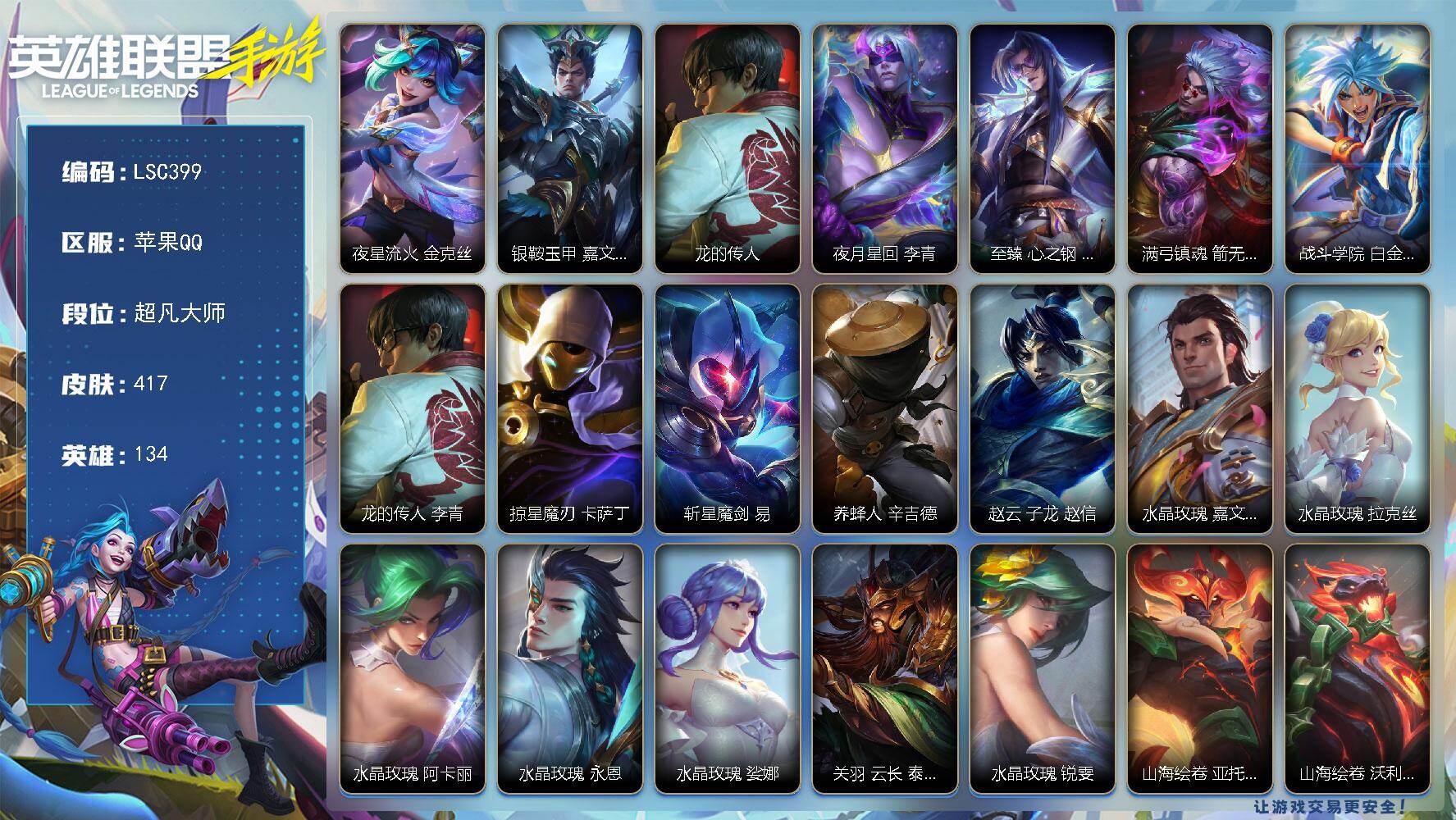 【lsc399】134英雄/417皮肤/7神话/43传说/223史诗/超凡大师/夜星流火 金克丝/银鞍玉甲 嘉文四世/龙的传人 李青/夜月星回 李青/至臻 心之钢 永恩/满弓镇魂 箭无虚发 韦鲁斯/战斗学院 白金学长 伊泽瑞尔/掠星魔刃 卡萨丁/斩星魔剑 易/养蜂人 辛吉德/赵云 子龙 赵信/水晶玫瑰 嘉文四世/水晶玫瑰 拉克丝/水晶玫瑰 阿卡丽/水晶玫瑰 永恩/水晶玫瑰 娑娜/关羽 云长 泰达米尔/水晶玫瑰 锐雯/山海绘卷 亚托克斯/山海绘卷 沃利贝尔/吕布 奉先 嘉文四世/神王 盖伦/海魔至尊 亚托克斯/暗星女王 拉克丝/心之钢 凯隐/源计划:净化 薇恩/光明哨兵 薇恩/暗星尊 烬/星域游侠 崔斯特/星之守护者 卡莎/太空律动 “猫猫”布里和里茨 布里茨/k/da all out 萨勒芬妮/黑夜使者 亚索/斗魂无双 亚索/御风墨影 亚索/灵魂莲华 阿狸/天煞 劫/星域武神 贾克斯/西部魔影 卢锡安/驯龙炮手 崔丝塔娜/欧米伽小队 幽灵特工 提莫/星之守护者 落 霞/翩翩绣蕊 霞/神拳 李青/神龙尊者 圣龙 李青/律政大亨 蒙多医生/炼狱魔犬 内瑟斯/福牛守护者 厄运小姐/跳跳倩影 厄运小姐/灵魂莲华 瑟提/黎明使者 永恩/源计划:林 易/灌篮高手 德莱厄斯/神王 德莱厄斯/光明哨兵 格雷福斯/黎明使者 德莱文/黎明使者 锐雯/地狱之门卫士 加里奥/斗魂觉醒 莎弥拉/未来战士 凯特琳/源计划:泯灭 雷克顿/最终boss 维迦/钢铁军团 盖伦/霸天剑魔 亚托克斯/星之守护者 拉克丝/战斗学院 拉克丝/惊悚派对 阿木木/殇之机器人 阿木木/地狱火 阿木木/霸天战士 雷恩加尔/雷喵喵尔 雷恩加尔/黎明使者 卡尔玛/星域先知 卡尔玛/丧尸 努努和威朗普/太空律动 “舞林双子” 努努和威朗普/小蜜蜂 努努和威朗普/地狱行者 孙悟空/水晶玫瑰 薇恩/探梦奇旅 艾克/暗星 奥莉安娜/泳池派对 奥莉安娜/星之守护者 奥莉安娜/腥红之月 黛安娜/无限烈焰 黛安娜/光明哨兵 黛安娜/星之守护者 佐伊/恶魔之刃 泰达米尔/端劲墨印 泰达米尔/猎龙勇士 赵信/霸天异形 卡兹克/暗星 卡兹克/猎梦吞噬者 卡兹克/清剿小队 金克丝/喵喵魅影金克丝/末路管家 布隆/猛虎 布隆/圣诞老人 布隆/礼物选好了吗? 布隆/西部牛仔 烬/斗魂觉醒 烬/霸天龙神 奥瑞利安·索尔/灰烬领主 奥瑞利安·索尔/圣龙 奥瑞利安·索尔/东恒之曜 奥瑞利安·索尔/腥红之月 崔斯特/未来战士 崔斯特/怪诞童话 崔斯特/弹幕天使 卡莎/电玩女神 卡莎/k/da all out 卡莎/神龙尊者 玉境灵龙 卡莎/魅惑女巫 莫甘娜/k/da all out 伊芙琳/清剿小队 潘森/未来战士 潘森/西宙之晖 潘森/铁血女忍 阿卡丽/k/da all out 阿卡丽/源计划:暗影 阿卡丽/源计划:火 菲奥娜/泳池派对 菲奥娜/玉剑传说 无双 菲奥娜/未来战士 菲奥娜/福牛守护者 菲奥娜/苹果机器人 布里茨/星之守护者 萨勒芬妮/福牛守护者 安妮/源计划:风 亚索/战场之王 亚索/灵魂莲华 亚索/电玩女神 阿狸/k/da all out 阿狸/幻梦甜心 阿狸/源计划:阴 劫/死亡誓约 劫/灵能特工 劫/武神 贾克斯/灵能特工 凯尔/屠龙勇士 凯尔/深海奇域 凯尔/源计划:雷 卢锡安/未来战士 卢锡安/源计划:山 蕾欧娜/泳池派对 蕾欧娜/战斗学院 蕾欧娜/小恶魔 崔丝塔娜/我,羽饰骑士 崔丝塔娜/娜就去看看 崔丝塔娜/大魔王 提莫/小蜜蜂 提莫/泳池派对 璐璐/驯龙女巫 璐璐/星之守护者 璐璐/银河魔装机神 希瓦娜/秘旅探索者 希瓦娜/破败军团 希瓦娜/炼狱魔女 蔚/燎原烈焰 蔚/暮星之羽 霞/秀逸墨羽 霞/晨星之翎 洛/欧米伽小队 毒针狙击手 图奇/太空律动 “百万调音” 格温/水晶玫瑰 格温/斗魂觉醒 格温/源代码 卡蜜尔/星域审判官 卡蜜尔/暗星 嘉文四世/福牛守护者 嘉文四世/神龙尊者 均衡之龙 沃利贝尔/泳池派对 李青/地下拳王 李青/电玩上校 库奇/柯基 库奇/奈落之炎 凯南/冰封王子 蒙多医生/战地机甲 内瑟斯/盗梦者 内瑟斯/太空律动 “狗头” 内瑟斯/北辰之威 内瑟斯/破败军团 厄运小姐/源计划:燃 泽丽/海之歌 泽丽/神龙尊者 炎龙 瑟提/心之钢 瑟提/灵魂莲华 永恩/持胡萝卜的雪人 易/西部魔影 德莱厄斯/福牛守护者 德莱厄斯/泳池派对 格雷福斯/禁卫机甲 格雷福斯/战斗教授 格雷福斯/绝命机甲 格雷福斯/玉剑传说 风仙子 迦娜/魅惑女巫 迦娜/温雅墨曲 迦娜/灵魂收割者 德莱文/破败军团 德莱文/斗魂无双 德莱文/海之歌 艾希/福牛守护者 阿利斯塔/霸天巨兽 墨菲特/冰川巨兽 墨菲特/暗星 墨菲特/银河魔装机神 菲兹/虚空海灵 菲兹/绒毛 菲兹/欧米伽小队 鬼影蛙人 菲兹/柚子软糖 菲兹/战场之王 吉格斯/泳池派对 吉格斯/黑夜使者 弗拉基米尔/水晶玫瑰 弗拉基米尔/天棱寒雨 弗拉基米尔/玉剑传说 寒潭夭夭 娜美/替父从军 花木兰 锐雯/玉剑传说 武剑仙 锐雯/光明哨兵 锐雯/白色死神 韦鲁斯/暗星 韦鲁斯/玉剑传说 舞剑仙 艾瑞莉娅/光明哨兵 艾瑞莉娅/斗魂无双 艾瑞莉娅/金玉贺吉 艾瑞莉娅/源计划:雄心 卡特琳娜/死亡誓约 卡特琳娜/战斗学院 卡特琳娜/西部魔影 执行人 卡特琳娜/星之守护者 索拉卡/冬境仙灵 索拉卡/源代码 索拉卡/星域学者 索拉卡/电玩勇者 伊泽瑞尔/星之守护者 伊泽瑞尔/心之钢 伊泽瑞尔/地狱火 加里奥/秘旅探索者 加里奥/战斗学院 阿克尚/黎明使者 阿克尚/天启骑士 杰斯/神奇先驱 杰斯/水晶玫瑰 杰斯/西部魔影 厄加特/星之守护者cos 厄加特/伯爵 卡萨丁/神龙尊者 星界之龙 卡萨丁/灵能特工 莎弥拉/猎龙勇士 奥拉夫/泉眼永不干涸! 丽桑卓/未来战士 慎/苍穹之