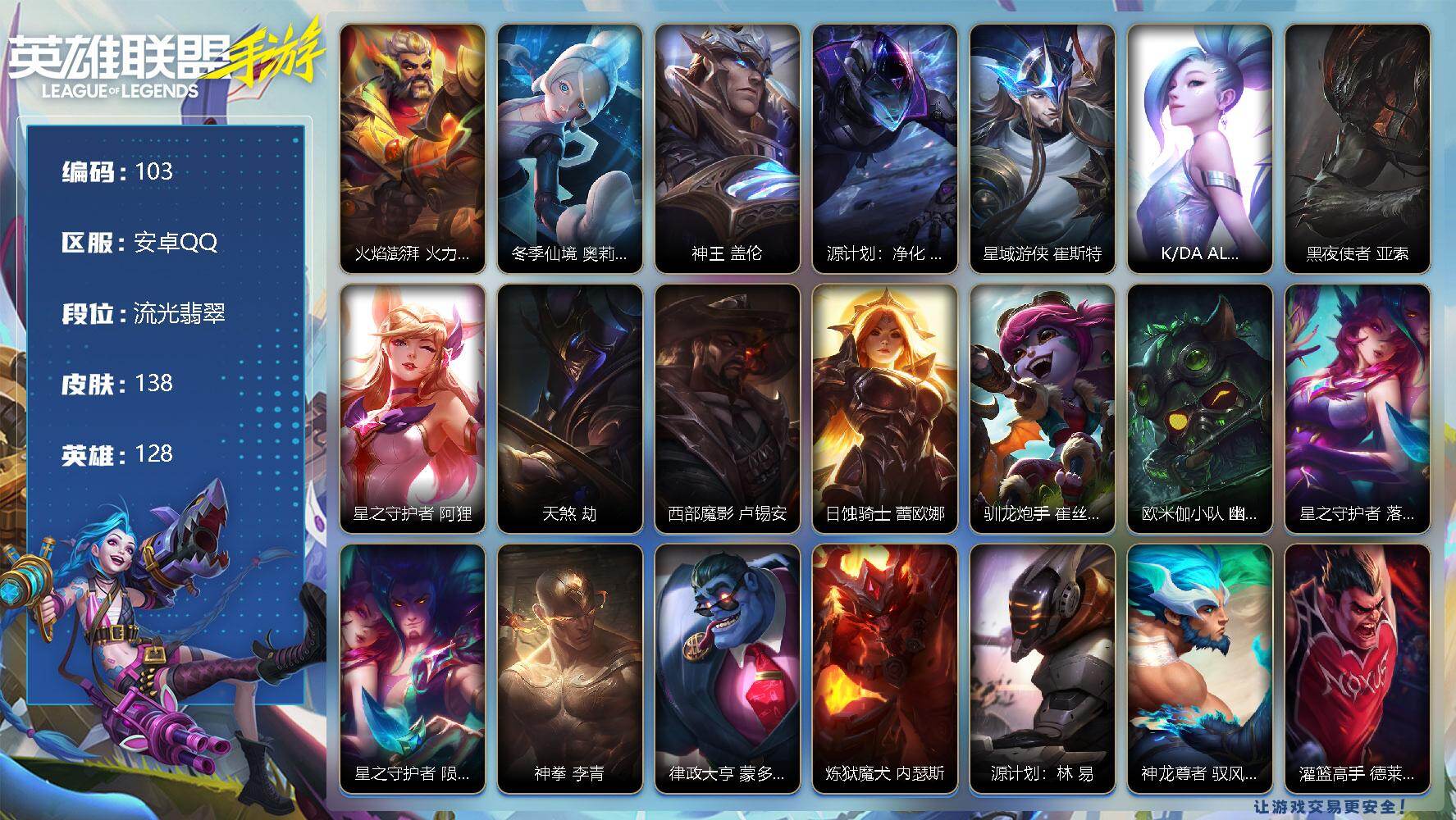 【lsc353】100英雄/72皮肤/超凡大师/星之守护者 金克丝/幻灵特战队长 菲奥娜/西部魔影 卢锡安/西部天使 艾希/黎明使者 锐雯/战斗学院 伊泽瑞尔/黑夜使者 泰达米尔/礼物选好了吗? 布隆/西部牛仔 烬/未来战士 崔斯特/源计划:火 菲奥娜/福牛守护者 安妮/源计划:山 蕾欧娜/大魔王 提莫/源代码 卡蜜尔/暗星 嘉文四世/地下拳王 李青/奈落之炎 凯南/禁卫机甲 格雷福斯/霸天巨兽 墨菲特/泳池派对 吉格斯/电玩勇者 锐雯/玉剑传说 武剑仙 锐雯/灵魂莲华 锐雯/电玩勇者 伊泽瑞尔/战场之王 布兰德/s1光耀之刃/s2光耀之芒/s5绯金魅影/s6绯金丽刃/s7绯金战斧/s8绯金鮫灵/s9王牌舰长/s10王牌上将/s11王牌勇将/s11王牌司令/s12龙冕先锋/s13龙冕御盾/s14龙冕神策/s15龙冕异士/s18冠翎巨神像/s19冠翎征服者/死亡骑士 盖伦/游侠法师 拉克丝/暗黑武士 雷恩加尔/苍穹之光 薇恩/光耀之刃 泰达米尔/龙冕先锋 赵信/末路狂花 金克丝/光耀之芒 金克丝/双城之战 金克丝/猎龙勇士 布隆/龙冕御盾 布隆/龙冕异士 烬/王牌舰长 崔斯特/冠翎征服者 尼菈/绯金魅影 伊芙琳/皇家守卫 菲奥娜/绯金丽刃 菲奥娜/小红帽 安妮/西部牛仔 亚索/冲击之刃 劫/熊猫 提莫/冰霜亚龙 希瓦娜/女警官 蔚/王牌上将 嘉文四世/创世魔神 内瑟斯/单身贵族 内瑟斯/西部牛仔 厄运小姐/抵抗军战姬 厄运小姐/绯金战斧 德莱文/极地女神 艾希/王牌司令 艾希/无畏号 墨菲特/科学狂人 吉格斯/龙冕神策 吉格斯/碎桶者 古拉加斯/鲛妮座人 娜美/绯金鲛灵 娜美/苍穹之光 韦鲁斯/炼金狂士 辛吉德/蕉泥座人 索拉卡/冠翎巨神像 加里奥/光明之锤 杰斯/王牌勇将 奥拉夫/铁血狙击手 凯特琳/黑暗骑士 布兰德/枯萎之壤 雷克顿