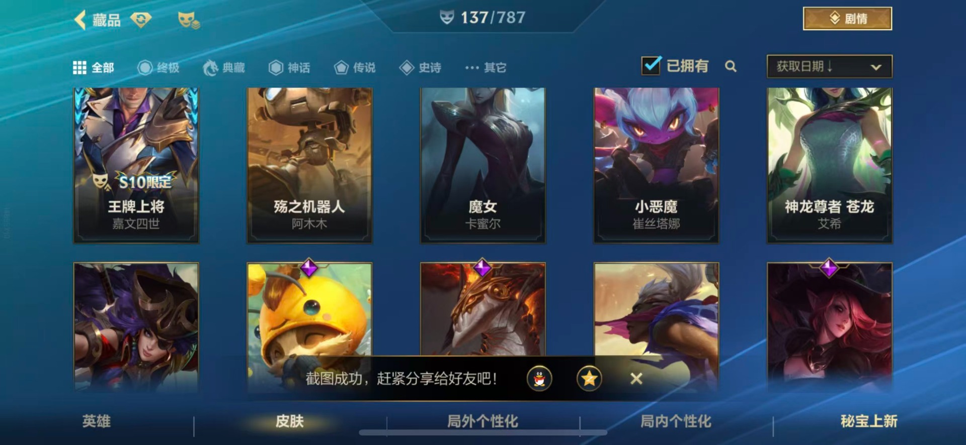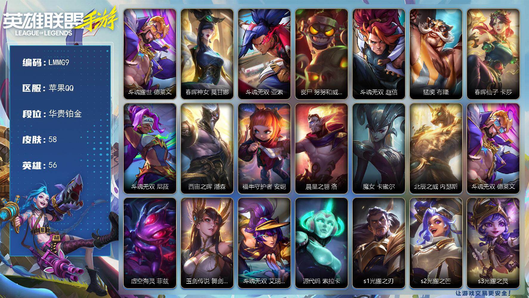 【lmmg9】56英雄/58皮肤/1神话/2传说/15史诗/华贵铂金/斗魂耀世 德莱文/春晖神女 莫甘娜/斗魂无双 亚索/丧尸 努努和威朗普/斗魂无双 赵信/猛虎 布隆/春晖仙子 卡莎/斗魂无双 尼菈/西宙之晖 潘森/福牛守护者 安妮/晨星之翎 洛/魔女 卡蜜尔/北辰之威 内瑟斯/斗魂无双 德莱文/虚空海灵 菲兹/玉剑传说 舞剑仙 艾瑞莉娅/斗魂无双 艾瑞莉娅/源代码 索拉卡/s1光耀之刃/s2光耀之芒/s3光耀之灵/s4光耀之心/s5绯金魅影/s6绯金丽刃/s7绯金战斧/s8绯金鮫灵/s9王牌舰长/s10王牌上将/s11王牌勇将/s11王牌司令/s19冠翎征服者/光明骑士 卡尔玛/斗战胜佛 孙悟空/苍穹之光 薇恩/哥特女仆 奥莉安娜/光耀之心 奥莉安娜/国王 泰达米尔/光耀之刃 泰达米尔/光耀之芒 金克丝/猎龙勇士 布隆/狮心 布隆/探戈灵魂 崔斯特/王牌舰长 崔斯特/冠翎征服者 尼菈/绯金魅影 伊芙琳/银色之牙 阿卡丽/绯金丽刃 菲奥娜/擂台皇帝 布里茨/兔宝宝 布里茨/西部牛仔 亚索/冲击之刃 劫/光明骑士 贾克斯/熊猫 提莫/光耀之灵 璐璐/冰霜亚龙 希瓦娜/女警官 蔚/王牌上将 嘉文四世/单身贵族 内瑟斯/西部牛仔 厄运小姐/暗影 易/黑暗骑士 格雷福斯/绯金战斧 德莱文/极地女神 艾希/王牌司令 艾希/无畏号 墨菲特/飞车暴走族 古拉加斯/绯金鲛灵 娜美/苍穹之光 韦鲁斯/炼金狂士 辛吉德/王牌勇将 奥拉夫/腥红之月 鬼武者 慎