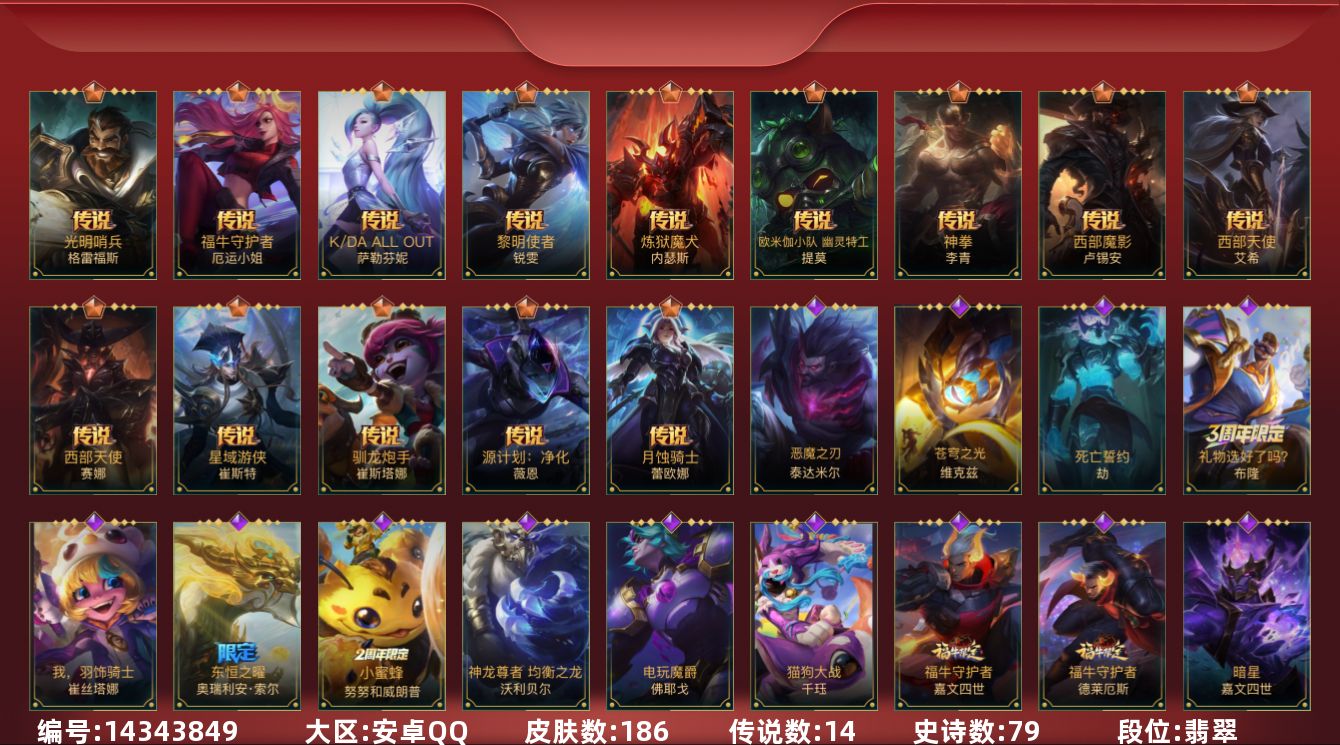 [14343849]14传说 79史诗 186皮肤 可二次 可修改实名 【段位】:翡翠 【传说皮】:西部天使寒冰西部魔影卢锡安神拳盲僧星域游侠卡牌欧米伽小队 幽灵特工炼狱魔犬黎明使者锐雯k/da allout萨勒芬妮福牛守护者女呛西部天使赛娜光明哨兵格雷福斯月蚀骑士蕾欧娜源