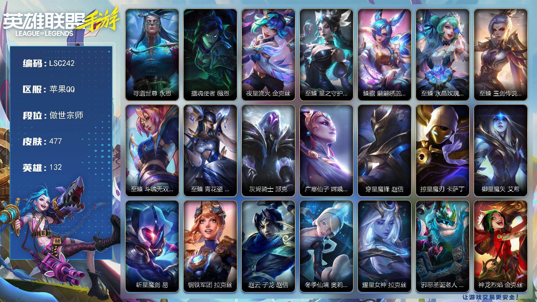 【lsc242】132英雄/477皮肤/傲世宗师/寻道世尊永恩/摄魂使者薇恩/夜星流火 金克丝/至臻 星之守护者 辛德拉/臻藏翩翩绣蕊霞/至臻 水晶玫瑰 格温/至臻 玉剑传说 武剑仙 锐雯/至臻 斗魂无双 艾瑞莉娅/至臻 青花瓷 丽桑卓/灰烬骑士派克/广寒仙子嫦娥/穿星魔锋/掠星魔刃卡萨丁/御星魔矢/斩星魔剑/钢铁军团拉克丝/赵云 子龙/冬季仙境发条/耀星女神拉克丝/圣诞老人/神龙烈焰金克丝/