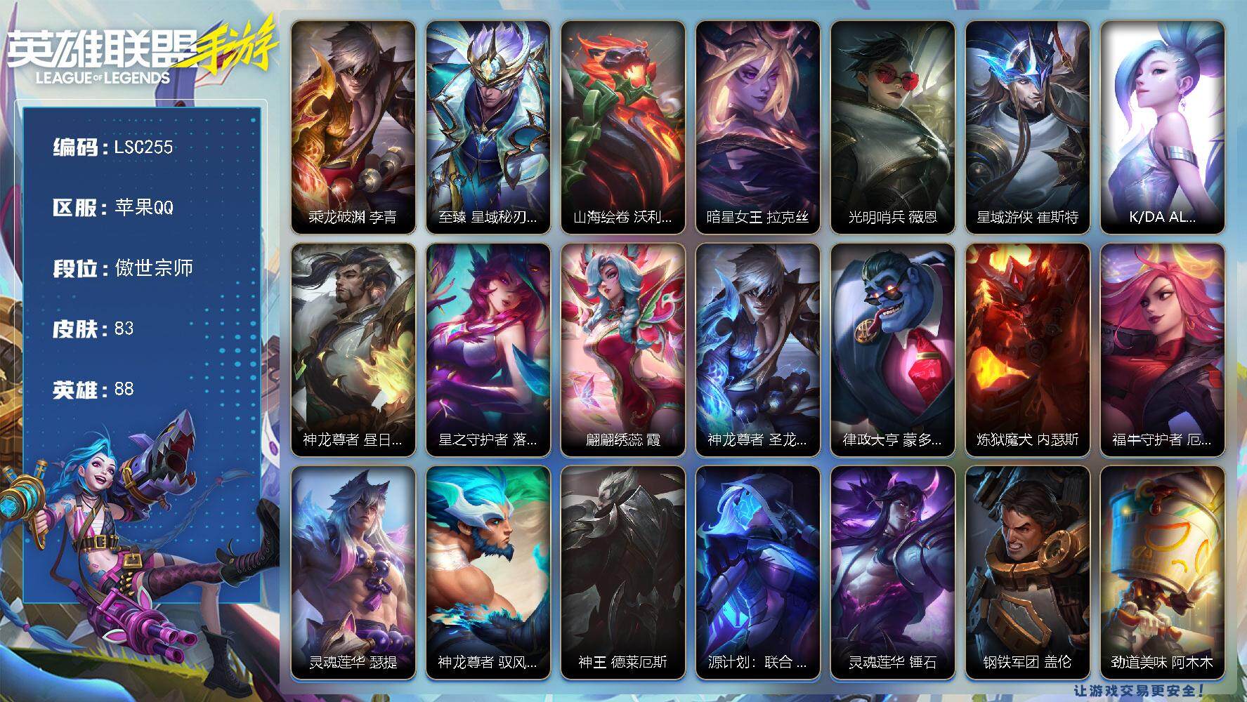 【lsc255】88英雄/83皮肤/傲世宗师/乘龙破渊李青/至臻星域秘刃泰隆/山海绘卷狗熊/暗星女王拉克丝/光明哨兵薇恩/星域游侠崔斯特/k/da allout萨勒芬妮/神龙尊者 昼日真龙 亚索/星之守护者落霞/蛇年限定翩翩绣蕊霞/神龙尊者 圣龙 李青/律政大亨蒙多医生/炼狱魔犬内瑟斯/福牛守护者厄运小姐/灵魂莲华瑟提/神龙尊者 驭风啸龙/神王德莱厄斯/源计划:联合艾希/灵魂莲华锤石/钢铁军团