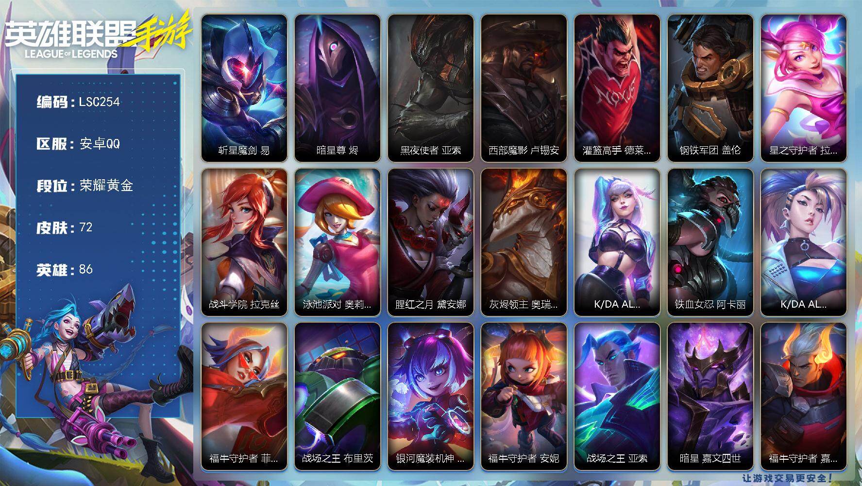 【lsc254】86英雄/72皮肤/4传说/29史诗/荣耀黄金/斩星魔剑 易/暗星尊 烬/黑夜使者 亚索/西部魔影 卢锡安/灌篮高手 德莱厄斯/钢铁军团 盖伦/星之守护者 拉克丝/战斗学院 拉克丝/泳池派对 奥莉安娜/腥红之月 黛安娜/灰烬领主 奥瑞利安·索尔/k/da all out 伊芙琳/铁血女忍 阿卡丽/k/da all out 阿卡丽/福牛守护者 菲奥娜/战场之王 布里茨/银河魔装机神 安妮/福牛守护者 安妮/战场之王 亚索/暗星 嘉文四世/福牛守护者 嘉文四世/泳池派对 李青/柯基 库奇/冰封王子 蒙多医生/盗梦者 内瑟斯/福牛守护者 德莱厄斯/破败军团 德莱文/福牛守护者 阿利斯塔/电玩勇者 锐雯/源代码 索拉卡/秘旅探索者 加里奥/梦境灵探 赛娜/未来战士 锤石/s1光耀之刃/s2光耀之芒/s3光耀之灵/s4光耀之心/s5绯金魅影/s6绯金丽刃/海上霸主 盖伦/猎龙勇士 薇恩/光耀之心 奥莉安娜/国王 泰达米尔/光耀之刃 泰达米尔/秘密特工 赵信/光耀之芒 金克丝/双城之战 金克丝/猎龙勇士 布隆/探戈灵魂 崔斯特/绯金魅影 伊芙琳/绯金丽刃 菲奥娜/西部牛仔 亚索/焰尾妖狐 阿狸/冲击之刃 劫/烧烤女神 蕾欧娜/熊猫 提莫/五连摇滚键盘手 娑娜/光耀之灵 璐璐/冰霜亚龙 希瓦娜/女警官 蔚/双城之战 蔚/至高之拳 李青/超级英雄 凯南/创世魔神 内瑟斯/单身贵族 内瑟斯/西部牛仔 厄运小姐/女帝 厄运小姐/无情重炮 格雷福斯/暴风女神 迦娜/德莱德莱 德莱文/极地女神 艾希/河水之灵 娜美/苍穹之光 韦鲁斯/蕉泥座人 索拉卡/冰川勇者 伊泽瑞尔/铁哥们儿 奥拉夫/鳄霸 雷克顿/穿着正装的恶魔 维迦