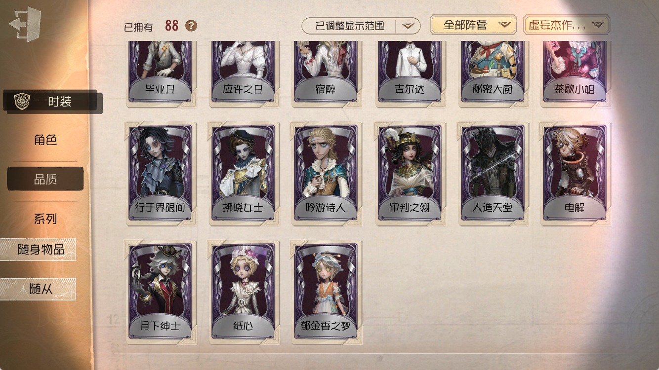 [15600042]安卓官服 手机账号 88时装 8金皮 27紫皮 4随从 30随身物品 【时装】:园丁-源自星辰渔女-垂泪的神女园丁初晴爱丽丝·德罗斯-片刻闲暇“囚徒”-毕业日渔女-chef k“小女孩”-欧律狄刻红夫人-应许之日渔女-审判之翎气象学家-茶歇小姐“杰克”-加里摄影师-盛夏光影记者-伊布空军-梅爱丽“心理学家”-恒梦教授-吟游诗人歌剧演员-拂晓女士病患-溯光古董商-陶梦嫣红蝶-胧夜26号守卫-秘密大厨木偶师-行于界限间冒险家-赞因音核裂响小提琴家-人造天堂画家-掌中篆记木偶师-义体再构小说家-“伊始新篇”园丁-郁金香之梦红夫人-女大公红蝶-竹华盲女-吉尔达“囚徒”-电解摄影师-月下绅士 【随身物品】:沙漠精灵(奇珍)拾贝奇珍枯萎的花冠奇珍记忆囚笼奇珍天羽奇珍手摇铃奇珍酩酊奇珍白泽玉奇珍完美人偶稀世日与月奇珍水晶宫稀世归燕奇珍