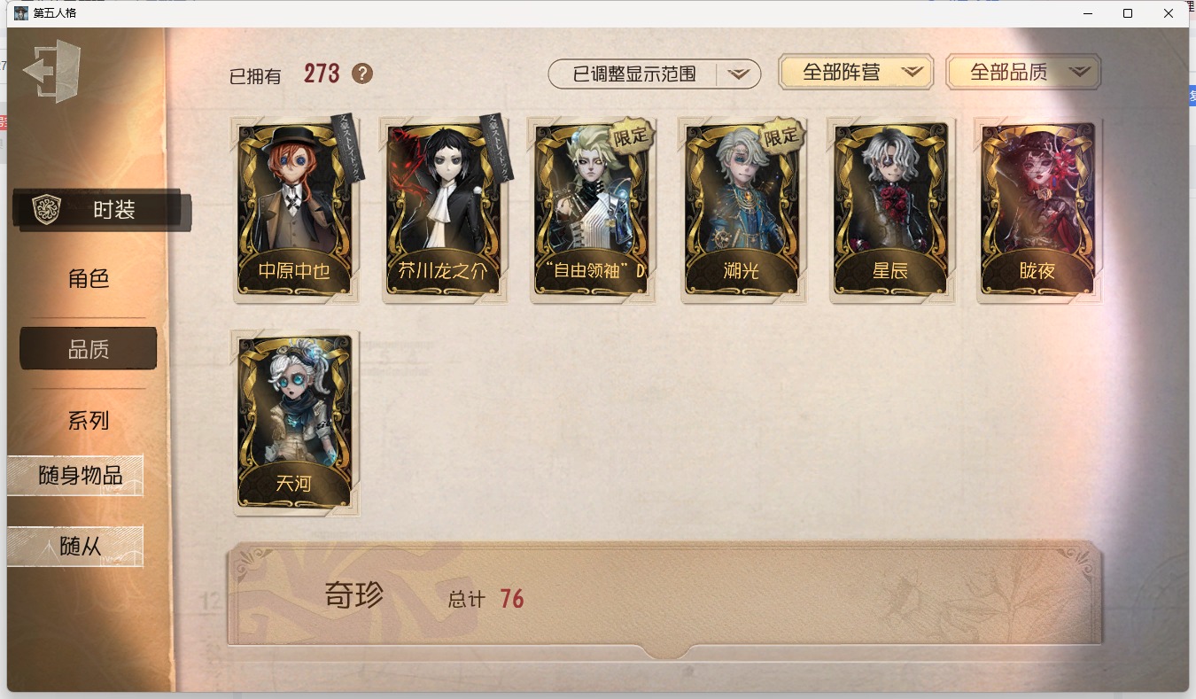 [15599808]安卓官服 邮箱账号 107时装 13金皮 22紫皮 3随从 37随身物品 【时装】:作曲家-幽灵帆“小女孩”-欧律狄刻气象学家-茶歇小姐黄衣之主-衣帽架先生梦之女巫-裁缝夫人小女孩-石榴蝶小姐“慈善家”-鎏金的表演大师空军-梅爱丽大副-雷斯垂德探长雕刻家-善忘的海马体骑士-艺术品商人记者-华生小姐爱哭鬼-善恶的本性病患-溯光杂技演员-李天辰26号守卫-秘密大厨小说家-无归的昨日画家-掌中篆记古董商-乔苓勘探员-盛夏飞盘医生-司药祭司-“厄运”勘探员-罗纳德勘探员-中原中也昆虫学者-曼陀罗红夫人-贝拉夫人红蝶-竹华调酒师-海盐特调宿伞之魂-程小时陆光“囚徒”-灵犀妙探“囚徒”-太宰治 【随身物品】:沙滩镜(奇珍)太宰的爱书(稀世)枯萎的花冠奇珍记忆囚笼奇珍酩酊奇珍欢呼(奇珍)糖果鬼(奇珍)福尔摩斯冒险史奇珍折柳稀世玫瑰手杖蓝奇珍白泽玉奇珍完美人偶稀世协律奇珍葡萄酒稀世