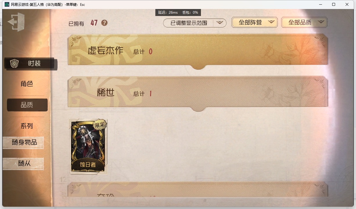 [14376277]华为 手机账号 47时装 1金皮 10紫皮 1随从 16随身物品 【时装】:律师-亚伯拉罕·葛雷幸运儿-星航之旅厂长-丰悦“噩梦”-圣洁隐士-游隼哭泣小丑-蚕食者红夫人-宝钻女爵冒险家-爱丽丝守夜人-蚀日者园丁-罗刹绯春梦之女巫-纸皇后