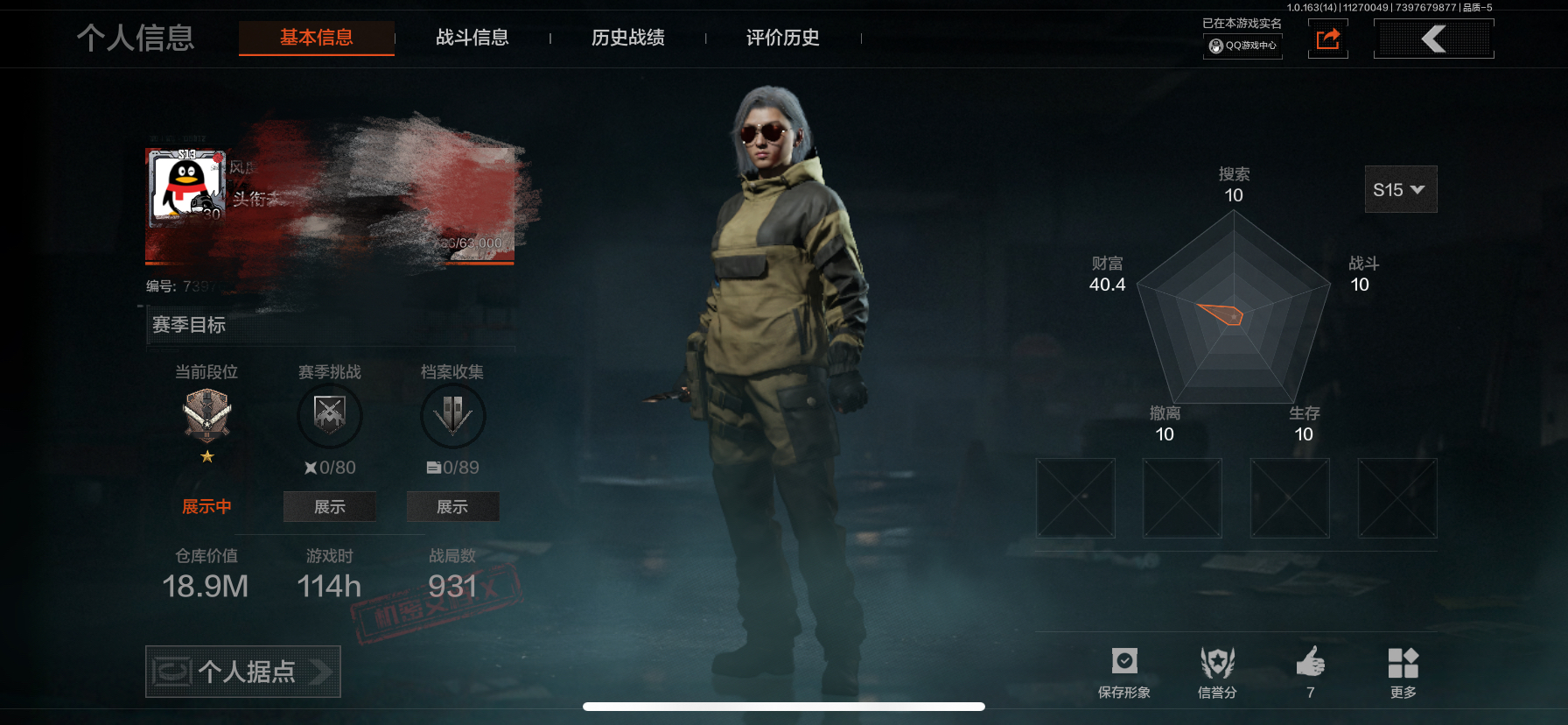 安卓q-等级30-仓库价值3.3m-科恩币798274 【套装】 城市户外运动套装 等高线运动套装 台风iv竞技运动服 台风ii竞技运动服 【近战武器】 开山刀 工兵铲 螺丝刀 冬日冰镐 裁决手杖剑 突击匕首 瑞兔折刀