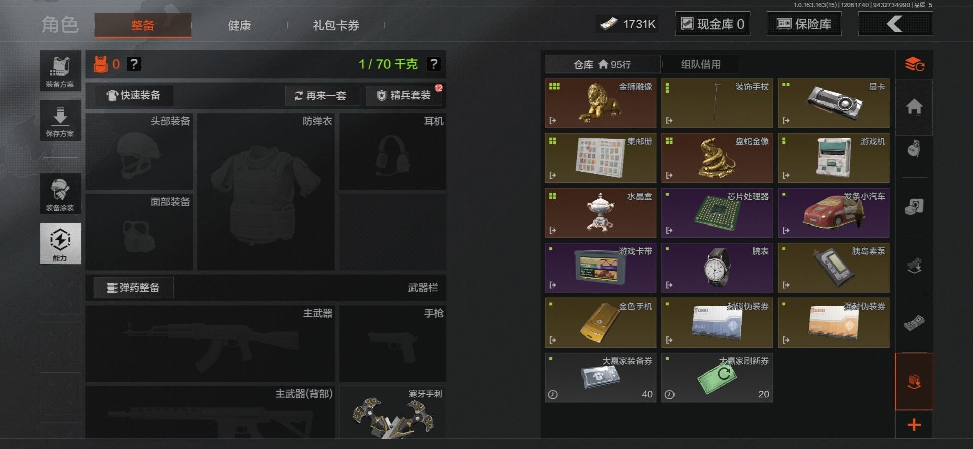 [14397809]库存价值9.9 2近战武器 3金呛皮 可修改实名 【柯恩币数量】:1731 【近战武器】:寒牙手刺工兵铲 【金色呛皮】:旧王圣谕·q191旗帜·aek骑士之剑·vss 【紫色呛皮】:竞技·mdr鱼跃丹青·qbu191竞技·aug最后防线·aek旗帜·rpk1