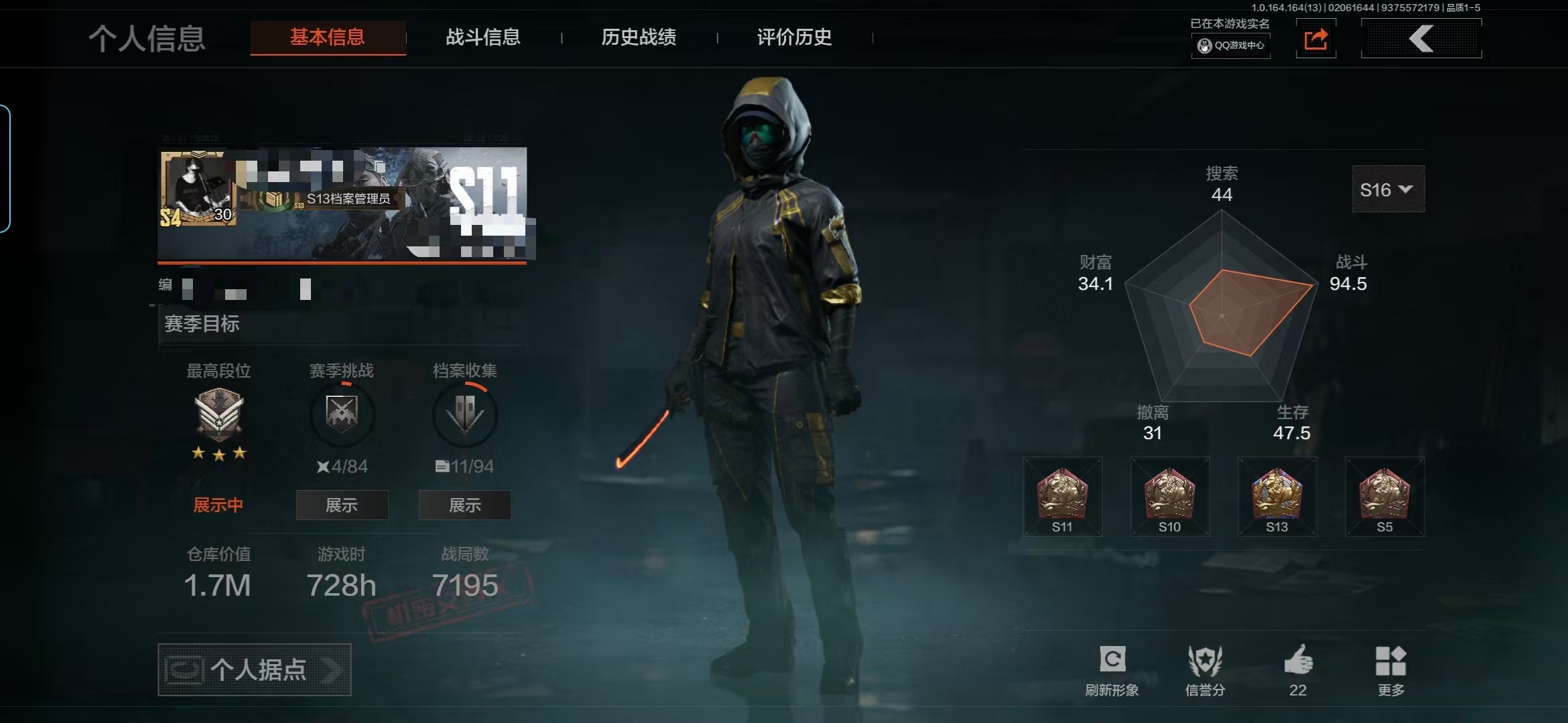 【aqqh414】段位:尖兵/仓库价值百万:77.8/nocs-7折刀/鲨鱼刀/工兵铲/旧王圣谕vss/浮鳞影青q192/旧王圣谕q191/告丧夜曲ar57/蓝色咆哮h416