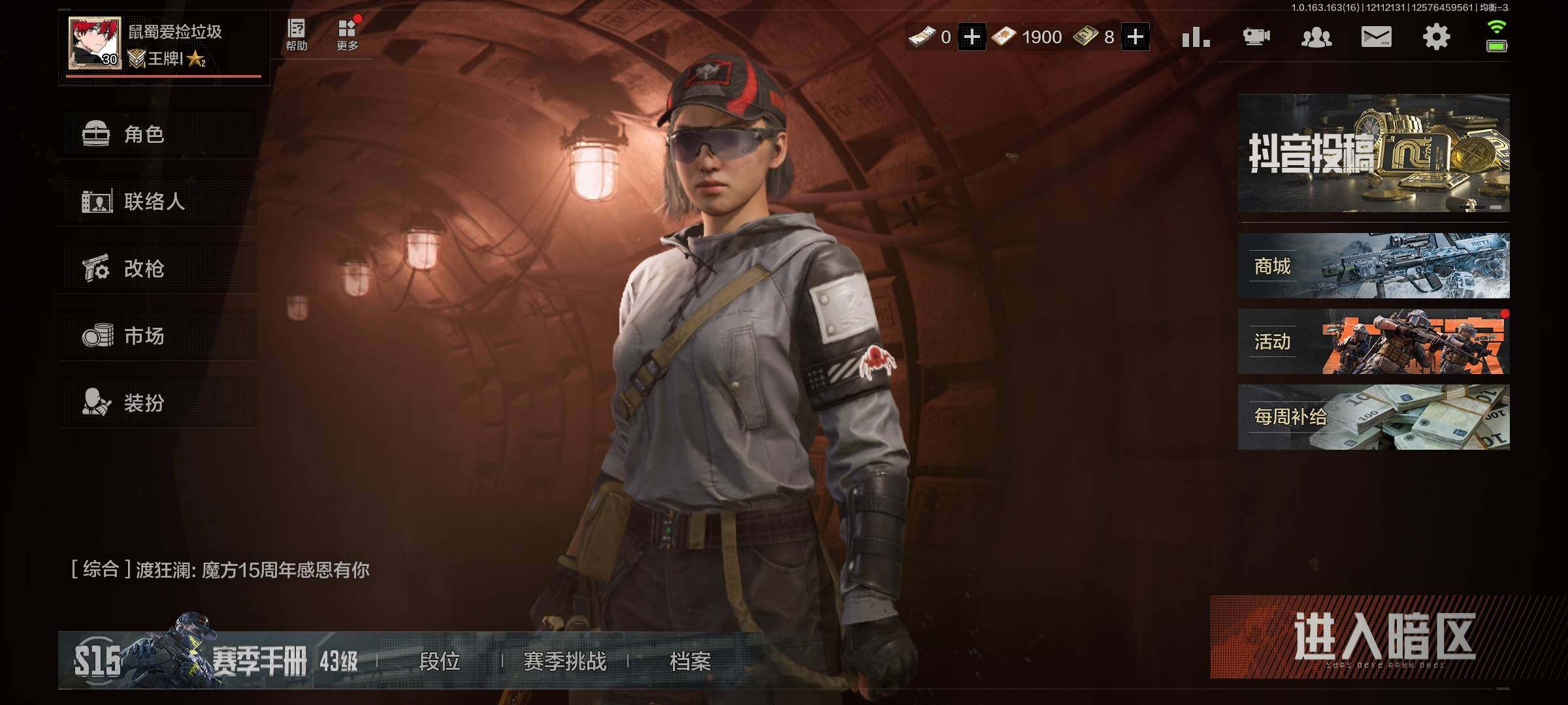 【aqd52】等级:30/段位:大师/仓库价值百万:0.29/柯恩币:45051/来战开山刀/明刀绣春/裁决手杖剑/工兵铲/蓝色咆哮h416/战术大师aek/浮鳞影青q192/旧王圣谕q191/旧王圣谕vss/利齿风暴m