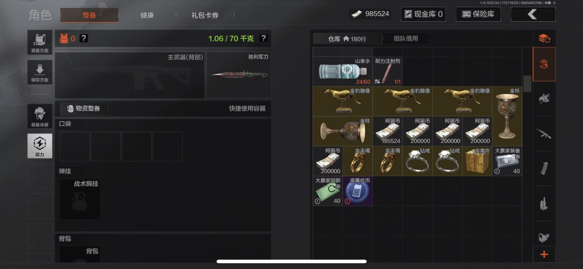 库存价值2.1 3近战武器 1金呛皮 可修改实名 【柯恩币数量】:985524 【近战武器】:工兵铲来战·开山刀胜利军刀 【金色呛皮】:蓝色咆哮·h416 【紫色呛皮】:棱光裂变·ak102骑士之剑·14骑士之剑·sj16自喷网格·h416来战·akm竞技·m4a1全地形数码
