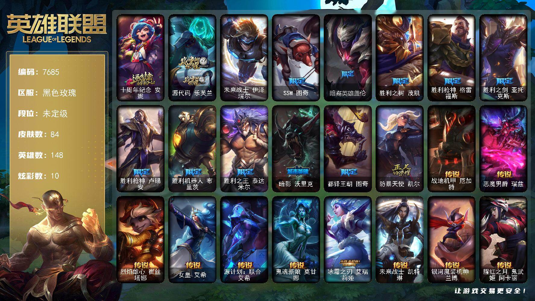 【皇冠号】未定级段位-148英雄-84皮肤-10炫彩-1终极-2神话-11限定-14传说-20史诗 【神话皮肤】:十周年纪念安妮,源代码乐芙兰 【臻彩皮肤】:破败军团厄运小姐灵岛征伐使 【终极皮肤】:未来战士伊泽瑞尔 【限定皮肤】:ssw图奇,暗裔英雄盖伦,胜利之树茂凯,胜利呛神格雷福斯,胜利之剑亚托克斯,胜利呛神卢锡安,胜利机器人布里茨,胜利之王泰达米尔,暗影沃里克,都铎王朝图奇,防暴天使凯尔 【传说皮肤】:战地机甲厄加特,恶魔男爵瑞兹,烈焰雄心崔丝塔娜,女皇艾希,源计划联合艾希,鬼魂新娘莫甘娜,冰霜之刃艾瑞莉娅,未来战士凯特琳,银河魔装机神兰博,腥红之月鬼武姬阿卡丽,死亡骑士盖伦,黯黑魔龙希瓦娜,黑夜使者亚索,星之守护者金克丝 【史诗皮肤】:摄魂男爵弗拉基米尔,火箭达人崔丝塔娜,特种部队普朗克,铁血狙击手凯特琳,无畏号墨菲特,沙漠风暴卡特琳娜,屠龙勇士薇恩,苍穹之光薇恩,法老王朝内瑟斯,血色之锤波比,刺客信条凯南,侏罗纪化石克格莫,腥红之月鬼武者慎,源计划火菲奥娜,永恒之森赫卡里姆,腥红之月烬,黯焰双魂千珏,源计划雷卢锡安,冲击之刃劫,暮星之羽霞 【其他皮肤1】:未来战士崔斯特,弗拉基米尔伯爵,宗师级法师训练师瑞兹,瑞兹白须,武神贾克斯,探戈灵魂伊芙琳,黑金诱惑图奇,横行霸道图奇,铬金铠甲拉莫斯,恐怖之源萨科,战栗之毒蒙多,泳池派对蒙多,源计划正义艾瑞莉娅,海牛骑手库奇,紫水晶意志塔里克,绿野仙踪维迦,赏金猎人卡特琳娜,恶咒亡魂魔腾,烈焰古树茂凯,猎天使魔女薇恩,远土之灵斯卡纳,电玩勇者伊泽瑞尔,龙骑士莫德凯撒,蜂刺阿卡丽,源计划暗影阿卡丽,炎爆慎,怒之火炮格雷福斯,坚韧不屈沃利贝尔,觅心射手韦鲁斯,玉剑传说无双,黑潮黛安娜,kda卡莎,银河魔装机神纳尔,丧尸杀手金克丝,泳池派对雷克塞,永恒之森霞