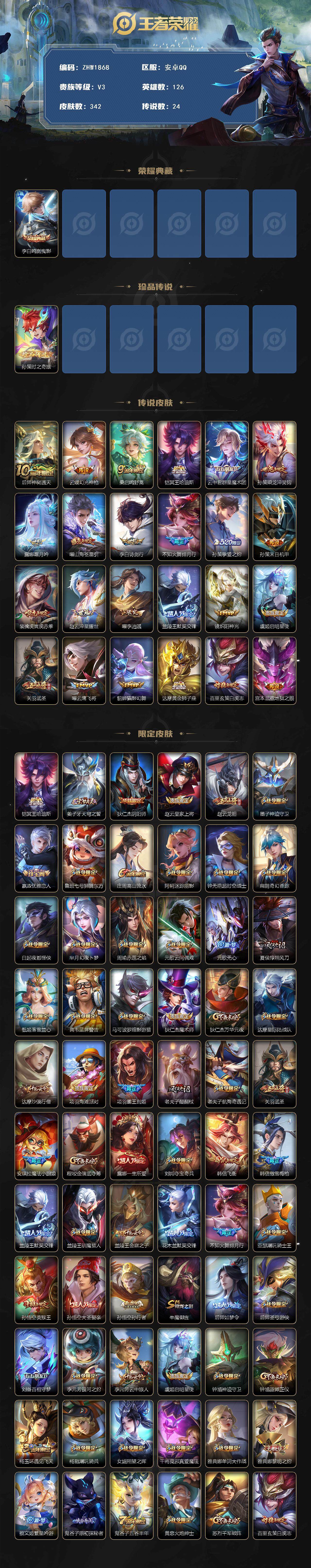 [14389956]可二次【店主推荐捡漏号!可直接换绑/省50孙策/市100裴擒虎】:安卓q-v8-最强王者段位-126英雄-342皮肤-1典藏皮肤-1珍品传说-24传说-117史诗 【英雄全皮】:猪八戒全皮,蒙恬全皮,影全皮 【荣耀典藏】:李白鸣剑曳影 【珍品传说】:孙策时之奇旅 【传说皮肤】:后羿神树通天,云缨幻光神呛,桑启鸣野蒿,铠冥王哈迪斯,云中君群星魔术团,孙策乘龙淬吴钩,露娜霜月吟,曜山海苍雷引,李白诗剑行,不知火舞绯月行,孙策挚爱之约,孙策末日机甲,裴擒虎寅虎赤拳,赵云淬星耀世,曜李 ,兰陵王默契交锋,镜炽阳神光,虞姬启明星使,关羽武圣,曜云鹰飞将,貂蝉猫影幻舞,达摩黄金狮子座,百里玄策白虎志,宫本武藏地狱之眼 【限定皮肤】:铠冥王哈迪斯,姜子牙天穹之誓,狄仁杰阴阳师,赵云皇家上将,赵云龙胆,墨子神迹守卫,嬴政优雅恋人,鲁班七号狮舞东方,庄周高山流水,阿轲迷踪丽影,钟无艳超时空战士,扁鹊奇幻香踪,白起夜都怪侠,芈月幻夜卜梦,周瑜赤莲之焰,元歌云间偶戏,元歌无心,夏侯惇朔风刀,甄姬落雪兰心,典韦蓝屏警告,马可波罗暗影游猎,狄仁杰魔术师,狄仁杰万华元夜,达摩星际陆战队,达摩沙漠行僧,项羽海滩派对,项羽霸王别姬,老夫子醍醐杖,老夫子航海奇遇记,关羽武圣,安琪拉魔法小厨娘,程咬金演武夺筹,露娜一生所爱,刘邦夺宝奇兵,韩信飞衡,韩信傲雪梅呛,兰陵王默契交锋,兰陵王驯魔猎人,兰陵王金庭之子,花木兰默契交锋,不知火舞绯月行,亚瑟潮玩骑士王,孙悟空美猴王,孙悟空大圣娶亲,孙悟空孙行者,牛魔御旌,后羿如梦令,后羿圣弓游侠,刘备百相守梦,李元芳银河之约,李元芳云中旅人,虞姬启明星使,钟馗神迹守卫,钟馗驱傩正仪,杨玉环遇见飞天,杨戬潮玩骑兵,女娲朔望之晖,干将莫邪真爱魔法,雅典娜单词大作战,雅典娜黎明之约,蔡文姬繁星吟游,鬼谷子原初探秘者,鬼谷子五谷丰年,黄忠火炮绅士,苏烈千军破阵,百里玄策白虎志,百里守约朱雀志,弈星混沌棋,梦奇顽趣,沈梦溪星空之诺,沈梦溪大漠名商,明世隐疑决卦,明世隐吟游魔法,裴擒虎天狼狩猎者,裴擒虎李小龙,裴擒虎寅虎赤拳,裴擒虎擒涛扼浪,狂铁电玩高手,米莱狄御霄,米莱狄胡桃异想国,云中君纤云弄巧,伽罗天狼溯光者,盾山御銮,盾山梦圆繁星,孙策挚爱之约,猪八戒西部大镖客,猪八戒猪悟能,上官婉儿梁祝,上官婉儿天狼绘梦者,嫦娥如梦令,嫦娥拒霜思,嫦娥暖冬兔眠,曜李 ,曜