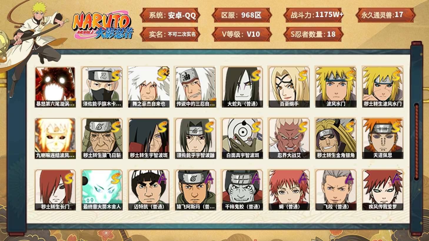 【火影忍者】【lyhy8965】战斗力:1175w;段位:影级2阶;本服排名:769;vip:v10级;s忍:18个;a忍:40个;通灵兽:17个,s忍:暴怒第六尾漩涡鸣人|须佐能乎旗木卡卡西|舞之豪杰自来也|传说中的三忍自来也|大蛇丸(普通)|百豪纲手|波风水门|秽土转生波风水门|九喇嘛连结波风水门|秽土转生猿飞日斩|秽土转生宇智波斑|须佐能乎宇智波鼬|白面具宇智波斑|忍界大战艾|秽土转生金角银角|天道佩恩|秽土转生长门|最终章大筒木舍人__a忍:迈特凯(普通) 5星|猿飞阿斯玛(普通) 5星|干柿鬼鲛(普通) 5星|蝎(普通) 4星|飞段(普通) 4星|疾风传我爱罗 3星|忍界大战我爱罗 3星|绯流琥蝎 3星|仙人模式漩涡鸣人|初始形态机械鸣人|九尾查克拉漩涡鸣人|万花筒写轮眼宇智波佐助|须佐能乎宇智波佐助|宇智波泉奈|百豪春野樱|忍界大战秋道丁次|忍界大战李洛克|最终章日向雏田|万花筒写轮眼旗木卡卡西|七夕限定猿飞阿斯玛|火影继承人猿飞日斩|青年波风水门|近松十人卫千代|桃地再不斩|秽土转生桃地再不斩|忍界大战奇拉比|忍界大战土台|半蛇斗篷药师兜|不动|秽土转生角都|晓大蛇丸|宇智波鼬(普通)|迪达拉(普通)|秽土转生迪达拉|死司凭血飞段|侠隐江湖大野木|羁绊神农|木叶上忍猿飞木叶丸|桃式显现漩涡博人|四代目土影黑土__通灵兽:忍犬(普通)|蓝蛇|蛤蟆吉|忍龟|镰鼬|猿魔|山椒鱼|蜃|蛤蟆仙人|鲛鲨|蛤蟆健|乌鸦(普通)|蛞蝓(普通)|蛤蟆龙|砂之守鹤|蛤蟆广|梦貘